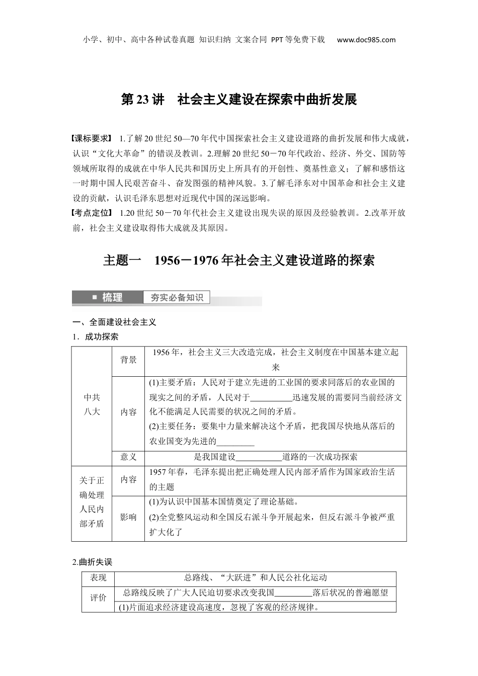 小学、初中、高中各种试卷真题知识归纳文案合同PPT等免费下载www.doc985.com第23讲社会主义建设在探索中曲折发展课标要求1.了解20世纪50—70年代中国探索社会主义建设道路的曲折发展和伟大成就,认识“文化大革命”的错误及教训。2.理解20世纪50-70年代政治、经济、外交、国防等领域所取得的成就在中华人民共和国历史上所具有的开创性、奠基性意义;了解和感悟这一时期中国人民艰苦奋斗、奋发图强的精神风貌。3.了解毛泽东对中国革命和社会主义建设的贡献,认识毛泽东思想对近现代中国的深远影响。考点定位1.20世纪50-70年代社会主义建设出现失误的原因及经验教训。2.改革开放前,社会主义建设取得伟大成就及其原因。主题一1956-1976年社会主义建设道路的探索一、全面建设社会主义1.成功探索中共八大背景1956年,社会主义三大改造完成,社会主义制度在中国基本建立起来内容(1)主要矛盾:人民对于建立先进的工业国的要求同落后的农业国的现实之间的矛盾,人民对于迅速发展的需要同当前经济文化不能满足人民需要的状况之间的矛盾。(2)主要任务:要集中力量来解决这个矛盾,把我国尽快地从落后的农业国变为先进的_________意义是我国建设道路的一次成功探索关于正确处理人民内部矛盾内容1957年春,毛泽东提出把正确处理人民内部矛盾作为国家政治生活的主题影响(1)为认识中国基本国情奠定了理论基础。(2)全党整风运动和全国反右派斗争开展起来,但反右派斗争被严重扩大化了2.曲折失误表现总路线、“大跃进”和人民公社化运动评价总路线反映了广大人民迫切要求改变我国落后状况的普遍愿望(1)片面追求经济建设高速度,忽视了客观的经济规律。小学、初中、高中各种试卷真题知识归纳文案合同PPT等免费下载www.doc985.com(2)由于对社会主义建设经验不足,以及当时的等因素,1959年至1961年,我国经济发生了严重困难思维点拨“大跃进”和人民公社化运动(1)“大跃进”反映了我不展的客律,片面地大生模,追求建国顾经济发观规扩产规经济设的高速度,背了客律,于生力域;其影是致民比例重失违观经济规属产领响导国经济严调生境遭到重破坏。态环严(2)人民公社化反映了我不生力的水平,片面地革生系,背了生运动国顾产实际变产关违产力定生系的原理,超越了史展段,于生系域;其影是重挫了决产关历发阶属产关领响严伤人民群生的性。众产积极3.调整提高时间1961年1月开始内容对国民经济实行“调整、、充实、提高”的八字方针意义(1)1962年下半年到1965年,国民经济稳步增长,接近并超过新中国成立以来最高水平。(2)1964年,建设“”目标的提出极大地激发了亿万人民建设社会主义国家的积极性二、“文化大革命”1.过程:1966年发动,1976年结束。2.评价:“文化大革命”不是任何意义上的革命或社会进步,而是一场由领导者错误发动,被反革命集团利用,给党、国家和各族人民带来严重灾难的内乱。思维点拨1949—1976年我国社会主要矛盾的变化(1)中人民共和成立到民的恢期:社主要矛盾是无的人民大华国国经济复时会还产阶级领导和三大人的余力的矛盾。众敌残势(2)渡期:社主要矛盾工人、社主道路本主道路的过时会转变为阶级与资产阶级会义与资义矛盾。(3)全面建社主期:的主要矛盾是人民于建立先的工的要求同落后的设会义时国内对进业国的之的矛盾,是人民于文化迅速展的需要同前文化不能足农业国现实间对经济发当经济满人民需要的之的矛盾。状况间视角1中共八大的经济主张材料有可能高速度地展我的生力发国产……也必估到前上、政上和技力须计当经济财术量上的客限制,估到保持后力量的必要,而不离展的正常比例观计备应当脱经济发……就小学、初中、高中各种试卷真题知识归纳文案合同PPT等免费下载www.doc985.com是要注意防止和正右保守的或随时纠倾“左”冒的向,而又妥可靠地推倾险倾积极稳进国民的展。经济发——摘自《中国共产党第八次全国代表大会文件》据材料概括中共八大的经济发展主张。试答:__________________________________________________________________________________________________________________________________________视角2社会主义经济建设存在的问题材料下是...