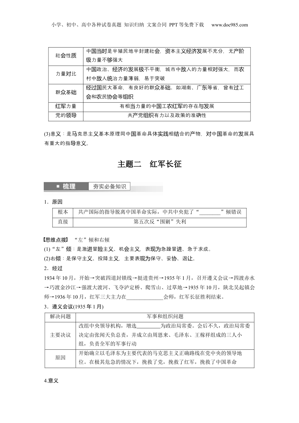 小学、初中、高中各种试卷真题知识归纳文案合同PPT等免费下载www.doc985.com第19讲中国共产党开辟革命新道路课标要求1.认识中国共产党开辟革命新道路的意义。2.认识红军长征的意义。考点定位1.“工农武装割据”道路是适合中国国情的革命道路,以及革命新道路开辟的意义。2.遵义会议是中国共产党由幼稚走向成熟的标志及长征精神。主题一工农武装割据开辟革命新道路1.发动武装起义南昌起义打响了武装反抗国民党反动派的第一枪八七会议总结了国民革命失败的教训,纠正了陈独秀的右倾机会主义错误,确定实行和武装反抗国民党反动派的总方针秋收起义起义军在进攻长沙途中受挫,决定改向敌人统治力量薄弱的山区进军2.开辟井冈山革命根据地井冈山根据地的建立1927年10月,毛泽东率领秋收起义的部队到达井冈山,开始创建第一个农村革命根据地;1928年,朱德、陈毅率领的革命队伍和毛泽东领导的工农革命军在井冈山会师意义点燃了“________________”的星星之火。从此,中国革命走上了建立农村革命根据地,以农村包围城市,武装夺取政权的道路概念阐释城市中心革命论城市中心革命是指以大城市中心,通攻打大城市以取政的革命道路。城市中心革论为过夺权命道路原是俄十月革命所走的一革命道路,是克思主俄情相合的物。国条马义与国国结产国民革命失后,中共党的南昌起、秋收起和广州起就是一革命道路的败国产领导义义义这实践,果明,城市中心革命中情不符。结证论与国国3.工农武装割据的实践武装斗争到1930年夏,全国已经建立起大小十几块农村革命根据地,分布在十多个省,革命武装力量达十万人土地革命各农村革命根据地逐步开展土地革命,“打土豪,分田地”根据地建设1931年11月,中华苏维埃第一次全国代表大会在江西召开,宣布成立中华苏维埃共和国临时中央政府小学、初中、高中各种试卷真题知识归纳文案合同PPT等免费下载www.doc985.com图解历史“工农武装割据”三大要素的内在关系思维点拨井山道路模式是符合中情的革命道路。中的情是民占人口的大多,而冈与国国国国农绝数国民党是大地主、大的政党,不重工尤其是民,其治力量主要集中在城市,资产阶级视农农统中共党展土地革命民,建立工武装,在村建立根据地才是革命的出路。国产开发动农农农4.中国共产党在革命根据地的制度探索(必选1,P16)(1)背景:中国共产党领导建立起大小十几块农村革命根据地;各级苏维埃政权陆续建立起来。(2)探索①中华苏维埃第一次全国代表大会制定了宪法大纲,通过了土地法、劳动法等法令,宣布________________________________正式成立。②宪法大纲规定,苏维埃政权属于工人、农民、红军士兵及一切劳苦大众。③大会推选________为临时中央政府主席。(3)意义:中华苏维埃共和国临时中央政府的成立,是创建________________的尝试。视角中国民主革命道路的探索材料中革命采取什斗形式和走什道路,是有不同意的:对国么争么当时见一意是:种见“、游和色域的建立和展,是半殖民地中在无红军击队红区发国产阶级领之下的民斗的最高形式,和半殖民地民斗展的必然果;且无疑地是促导农争农争发结并义进全革命高潮的最重要因素国……”另一意是:种见1928年中共六大通的《政治案》指出:各省自的民游过议决发农击战,只有和争“无的城市的新的革命高潮相起产阶级联结来”,才可能成变“全利的民暴国胜众的出点动发”。材料反映了哪两种革命道路?你同意哪一种意见?为什么?试答:__________________________________________________________________________________________________________________________________________拓展深化全面认识“工农武装割据”思想(1)含:义“工武装割据农”是指在中共党的下,把土地革命、武装斗和根据地国产领导争建三者合起。设结来(2)原因小学、初中、高中各种试卷真题知识归纳文案合同PPT等免费下载www.doc985.com社性会质中是半殖民地半封建社,本主展不充分,无国当时会资义经济发产阶力量不强大级够力量比对中政治、的展不平衡,城市中人的力量相强大,而国经济发极敌对农村中人治力量薄弱,易于突破敌统群基众础民大革命,有良好的群基。如湖南、广等省,曾有工...