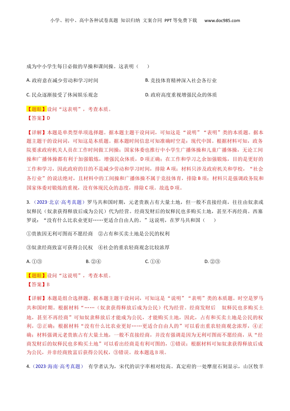小学、初中、高中各种试卷真题知识归纳文案合同PPT等免费下载www.doc985.com专题03表明说明类选择题表明说明类选择题,以考查推理能力为主,兼顾对记忆、提取信息、比较等能力的考查,重点考查的是“论从史出”、“史论结合”,强调分析判断能力。此类试题在高考选择题中占有较大的比重。(1)从命题意图看,“表明”“说明”设问主要考查学生透过现象看本质的能力,考查的往往是深层次的理解。(2)从考查路径看,“表明”“说明”所考查路径大致分三种:一是题干与选项之间是因果关系;二是题干与选项之间是现象与本质的关系;三是题干与选项之间是判断关系。(3)标志性词语:“表明”“说明”。“表明”“说明”,一般就是从事实(材料)得出结论的意思。说明表明类试题属于本质题。“表明”是指表示清楚,比较确切地指出;“说明”意思是解释清楚,讲明解;说明原因。表明、说明的含义相似,即都是考查学生从材料中能得出的历史结论,但也有所不同,“表明”多含有求答历史现象本质之意,“说明”含有分析、阐述(以说明方式来证明结论的对错)之意。一、应对此类试题的方法分两步:可概括为“一排除二分析三区分”一排除二分析三区分二分析一排除三区分析排除错误说法分析哪个选项能够更深层次地反映材料信息“表明”“说明”和“反映”“体现”具有相似性。它们的区别在于:“反映”“体现”都属于间接说明、深层说明、本质说明,“说明”“表明”更多是表明相互关系的一种设问方式。小学、初中、高中各种试卷真题知识归纳文案合同PPT等免费下载www.doc985.com二、此类试题也是增加开放性选择题的重要方式,在作答时需要根据题意进行分析,避免思维定式。1.(2023·北京·高考真题)“邮”是汉代一种通信机构,官府的重要文书可以通过“邮”传递,称为“以邮行”。1930年,新疆罗布泊北岸的遗址出土大量汉代简牍,如图为其中一件的照片。据研究推断,此遗址是汉代设立的居卢訾(zǐ)粮仓。这一发现说明,汉朝()①推动中外丝绸贸易的发展②有较发达的信息传递体系③在西域地区推行了郡县制④发展交通有利于边疆治理A.①③B.②④C.①④D.②③【题眼】设问“这一发现说明”,考查本质。【答案】B【详解】本题是组合选择题。据本题主题干设问词,可知这是“说明”“表明”类的本质题。时空是:汉朝(中国)。②根据材料“官府的重要文书可以通过‘邮’传递……新疆罗布泊北岸的遗址出土大量汉代简牍……此遗址是汉代设立的居卢訾粮仓”结合所学知识可知,“邮”是汉代一种通信机构,官府的重要文书可以通过“邮”传递,说明汉朝时期有较发达的信息传递体系,符合题意;④新疆罗布泊北岸的遗址是汉代设立的居卢訾粮仓,说明汉代时期加强了对边疆的治理,符合题意;①根据材料信息,材料描述的是丝绸之路的繁荣,但无法判定是否为丝绸贸易,不符合题意;③根据材料信息,无法判定在西域地区是否设置了郡县,不符合题意。综上所述,②④符合题意,B项正确;其他选项与题意不符,排除A、C、D项。故选B项。2.(2023·北京·高考真题)1954年,政务院发布通知,要求政府机关人员“在每天上午和下午的工作时间中各抽出十分钟做工间操”。随后,国家体委也公布并推行了第一套少年广播体操和儿童广播体操,很快小学、初中、高中各种试卷真题知识归纳文案合同PPT等免费下载www.doc985.com成为中小学生每日必做的早操和课间操。这表明()A.政府意在减少劳动和学习时间B.竞技体育精神深入社会各行业C.民众逐渐接受了休闲娱乐观念D.政府高度重视增强民众的体质【题眼】设问“这表明”,考查本质。【答案】D【详解】本题是单类型单项选择题。据本题主题干设问词,可知这是“说明”“表明”类的本质题。据本题主题干的设问词,可知这是本质题。据本题时间信息可知准确时空是:现代中国。根据材料可知,政务院要求政府机关人员在工作时间做工间操;国家体委也推行中小学生广播体操和儿童广播体操,无论工间操和广播体操都有利于加强锻炼,增强民众体质,D项正确;在工作和学习之余加强锻炼,目的是更好的工作和学习,因此政府的目的不是减少劳动和学习时间,排除A项;材料只涉及政府机关和学校,...