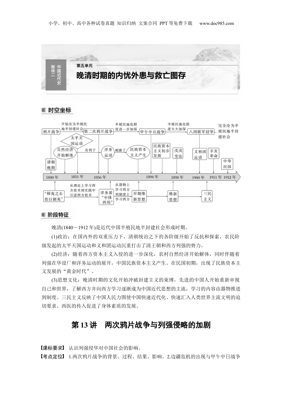 小学、初中、高中各种试卷真题知识归纳文案合同PPT等免费下载www.doc985.com晚清(1840-1912年)是近代中国半殖民地半封建社会形成时期。(1)政治:在国内外的双重压力下,清朝统治之下的各阶级开始了反抗和探索,农民阶级发起的太平天国运动和义和团运动沉重打击了清王朝和西方列强的势力。(2)经济:随着西方资本主义入侵的进一步深化,农村自然经济开始解体,同时伴随着列强在华设厂和洋务运动的展开,中国民族资本主义产生。在民国初期,出现了民族资本主义发展的“黄金时代”。(3)思想文化:晚清时期的文化开始冲破封建主义的束缚,先进的中国人开始重新审视自己和世界,了解西方并向西方学习逐渐成为中国近代思想的主流,学习的内容由器物推进到制度。三民主义反映了中国人民力图使中国快速近代化、快速汇入人类世界主流文明的迫切要求。西医的传入促进了身体素质的发展。第13讲两次鸦片战争与列强侵略的加剧课标要求认识列强侵华对中国社会的影响。考点定位1.两次鸦片战争的背景、过程、结果、影响。2.边疆危机的出现与甲午中日战争小学、初中、高中各种试卷真题知识归纳文案合同PPT等免费下载www.doc985.com的爆发、列强瓜分中国的表现。3.八国联军侵华的背景、过程、结果、影响。4.《辛丑条约》的内容、危害。主题一鸦片战争1.鸦片战争前的世界和中国——背景世界——资本主义不断发展地位后,资本主义生产方式在英、法、美等国逐渐占据主导地位矛头世界主要殖民主义国家把矛头指向中国中国——仍停留在封建社会政治君主专制统治依旧顽固经济自给自足的小农经济是主要的生产方式科技军事非常落后社会矛盾各地农民起义此起彼伏图解历史鸦片战争爆发的必然性2.鸦片战争的概况项目鸦片战争(中国近代史开端)第二次鸦片战争原因打开市场、倾销商品、掠夺原料进一步打开中国市场(根本);列强要求修约,被清政府拒绝(直接)时间1840.6-1842.81856-1860年双方清政府与英国清政府与英法等国结果(1)1842年《》(中国被迫割让香港岛、赔款2100万银元、接受协定关税以及开放五口通商等)。(2)1843年中英《虎门条约》;1844(1)1858年《天津条约》;1860年《北京条约》(英法获取割地、赔款、开放通商口岸以及内河航行权等权益;合法化)。小学、初中、高中各种试卷真题知识归纳文案合同PPT等免费下载www.doc985.com年中美《望厦条约》;中法《黄埔条约》(英、法、美三国从中国获得协定关税、、片面最惠国待遇以及通商口岸传教权等)(2)中俄《北京条约》,迫使清政府承认《》,抢占黑龙江以北、乌苏里江以东100余万平方千米的中国土地,俄方提出边界走向强加给中国概念阐释片面最惠国待遇与领事裁判权最惠待遇是指一在通商、航海、收或公民法律地位等方面予另一享受或国国税给国现时将来所予任何第三同的一切惠、特或豁免等待遇。最惠待遇一般是相互的,但近代给国样优权国中外的,往往只片面定享受最惠待遇,而中无等利,国与国签订条约规该缔约国国国则对权是片面的。事裁判指一具有的通外事于另一土的本民根据其本法律行使领权国过驻领对处国领内国国国司法管的力。是一治外法,是帝主在殖民地或半殖民地家所享有的一辖权权这种权国义国种非法特。权3.鸦片战争的影响(1)政治:中国的独立、主权和领土完整受到了严重侵犯。(2)经济:鸦片贸易合法化,协定关税损害中国关税主权;自然经济开始解体,中国逐渐被卷入资本主义世界市场。(3)思想:地主阶级开始开眼看世界。(4)社会性质:中国从一个独立的封建社会逐渐沦为半殖民地半封建社会。图解历史半殖民地半封建社会4.近代以来的中国城市化进程(必选2,P62-63)(1)鸦片战争以来中国城市化的演进背景表现近代鸦片战争后,通商口岸,逐渐发展起资本主义工商业近代化性质的工商业城市陆续出现、发展、壮大,吸引了大量乡村人口进城,开启了近代中国城市化的进程小学、初中、高中各种试卷真题知识归纳文案合同PPT等免费下载www.doc985.com现代中华人民共和国成立;改革开放城市化进入新阶段。1978年后,中国的城市化进程加快。21世纪以来,中国城市化迅猛发展思维点拨中国城市化进程的阶段特点从19世下半叶到纪20世中叶,由于受到世界列强的侵...