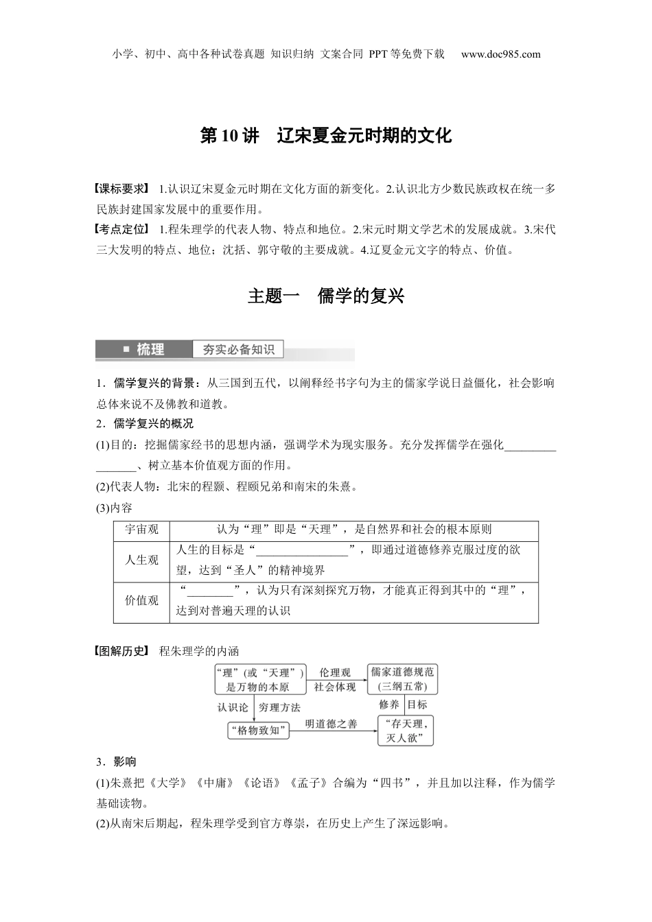 小学、初中、高中各种试卷真题知识归纳文案合同PPT等免费下载www.doc985.com第10讲辽宋夏金元时期的文化课标要求1.认识辽宋夏金元时期在文化方面的新变化。2.认识北方少数民族政权在统一多民族封建国家发展中的重要作用。考点定位1.程朱理学的代表人物、特点和地位。2.宋元时期文学艺术的发展成就。3.宋代三大发明的特点、地位;沈括、郭守敬的主要成就。4.辽夏金元文字的特点、价值。主题一儒学的复兴1.儒学复兴的背景:从三国到五代,以阐释经书字句为主的儒家学说日益僵化,社会影响总体来说不及佛教和道教。2.儒学复兴的概况(1)目的:挖掘儒家经书的思想内涵,强调学术为现实服务。充分发挥儒学在强化________________、树立基本价值观方面的作用。(2)代表人物:北宋的程颢、程颐兄弟和南宋的朱熹。(3)内容宇宙观认为“理”即是“天理”,是自然界和社会的根本原则人生观人生的目标是“________________”,即通过道德修养克服过度的欲望,达到“圣人”的精神境界价值观“________”,认为只有深刻探究万物,才能真正得到其中的“理”,达到对普遍天理的认识图解历史程朱理学的内涵3.影响(1)朱熹把《大学》《中庸》《论语》《孟子》合编为“四书”,并且加以注释,作为儒学基础读物。(2)从南宋后期起,程朱理学受到官方尊崇,在历史上产生了深远影响。小学、初中、高中各种试卷真题知识归纳文案合同PPT等免费下载www.doc985.com视角程朱理学材料理家提出学“理”作宇宙万物的本原,以儒家的法、理思想核心,吸收佛为它礼伦为道思想中的精粹,形成了析理精微、明确的哲体系,是的粗糙儒所无法比论证学这两汉学拟的。理家以儒家学“人圣”最高境界,充分肯定人的生活、道德精神的意;弃为现实义它摒佛道所宣的彼岸世界,不相信魂不、回世之,而力求在世界中崇高的扬灵灭轮转说现实实现理想,所以是一理性主的哲。它种义学——摘编自马克垚《世界文明史》根据材料,概括宋代理学的积极作用,结合所学知识,简析儒学由“粗糙”趋向“精微”的原因。试答:__________________________________________________________________________________________________________________________________________拓展深化宋明理学的特点及影响(1)特点儒哲化学学的道德信式的理由宋代理家的改造,展成哲理体系传统条论经学发学论儒佛道化学主要表在吸收借佛道的形而上;借佛、道的系,现鉴教与教学鉴传教谱立创“道统”;吸收佛、道的禁欲主义儒世俗化学程朱理控制育科,通授徒、院等方式在社上广泛学教与举并过书讲学会播,甚至深入族、家之中。朱熹的《家》和《小》也成家传规训礼学为庭和幼童的行范为规(2)影响步性进程朱理在育人知、陶冶情操等方面了十分的作用学教们书识礼发挥积极有利于培人的社任感、史使命感等养会责历程朱理含的主理,激了中民族的正,凝聚了夏女学蕴爱国义论扬华气华儿团御侮、革立新的雄心,成民族凝聚力和向心力的重要源泉之一结旧为局限性程朱理以封建理道德范人的行,封建制治,阻碍了思想学伦规们为维护专统文化的展发程朱理的一些思想主也一定程度上禁了人的思想和行,尤其是学张锢们为对女思想、行的束更重妇为缚为严主题二宋元时期的文艺、科技与少数民族文字小学、初中、高中各种试卷真题知识归纳文案合同PPT等免费下载www.doc985.com1.文学艺术宋词句子长短不等,用来配乐歌唱,根据乐谱分为不同的词牌。以豪放派的苏轼、辛弃疾和婉约派的柳永、李清照的词作成就最为突出元曲包括散曲和杂剧。________标志着中国古代戏曲艺术的成熟,代表作家有关汉卿、王实甫等话本说书的底本,实际上就是早期的白话小说书画书法名家更加追求个性,不拘法度;______注重意境和笔墨情趣;花鸟画、人物画水平也很高概念阐释市民文学封建社后期,着工商城市的起,适城市居民需要而生的一世俗文,又会随业兴为应产种学称城市文。容大多描市民的社生活和悲离合的故事,反映市民的思想和愿望为学内写会欢阶层。2.科技宋朝北宋工匠毕昇发明了___________火药被大量制造并用于军事,出现爆炸型火器、管形射击火器造出了指南针,广泛应用于航海沈括所著《梦溪笔谈》记载和总...