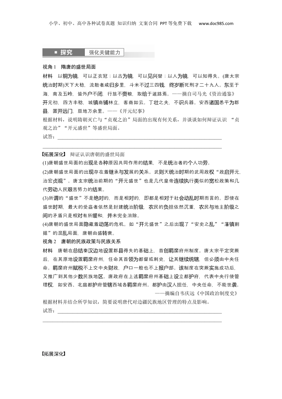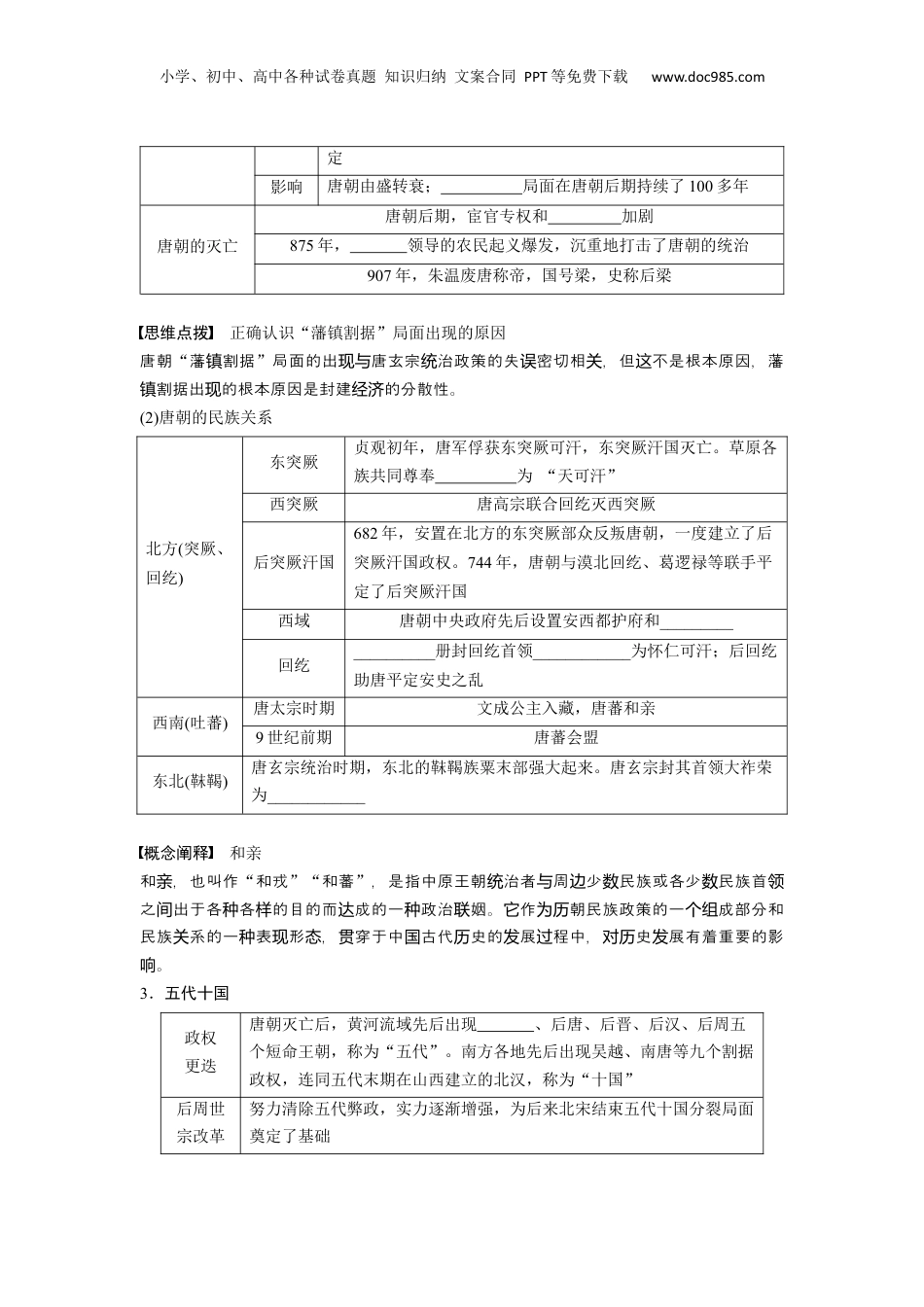 小学、初中、高中各种试卷真题知识归纳文案合同PPT等免费下载www.doc985.com第6讲三国两晋南北朝至隋唐的政治创新课标要求通过了解隋唐时期封建社会的高度繁荣,认识隋唐时期的制度变化与创新、民族交融、区域开发。考点定位1.隋唐的统治及盛世出现的原因、表现。2.唐朝处理民族关系的方式、措施及意义。3.科举制、三省六部制的形成及意义。4.租庸调制、两税法的内容、意义。主题一从隋唐盛世到五代十国的统治1.隋朝的兴亡统一581年,北周外戚杨坚建立隋朝,定都长安;589年,隋灭,结束了南北长期分裂的局面建设在长安、洛阳两都和地方广设仓库;兴建洛阳城;开通了贯通南北的______灭亡原因隋炀帝大兴土木,穷奢极欲,三征高丽。生产遭到严重破坏,民不聊生,引发大规模起义标志618年,隋炀帝被部将杀死,隋朝灭亡思维点拨隋朝大运河开通的原因(1)隋朝作一的中央集家可集中力量建大型工程。为统权国兴(2)加强南方的有效控制,固治。为对巩统(3)适重心南移的,保障中央政府的物供。应经济趋势资应2.唐朝的兴衰与民族交融(1)唐朝的兴衰建立与统一618年,在长安称帝,建立唐朝,随后统一全国“贞观之治”唐太宗轻徭薄赋,劝课农桑,戒奢从简,知人善任,虚怀纳谏。在其统治时期出现了开明政治局面,史称“”武周政权武则天当权期间,唐朝社会经济持续发展“开元盛世”______统治期间,经济有很大发展,社会空前繁荣,史称“开元盛世”安史之乱原因开元年间,唐玄宗在边境重地增置军镇,军镇长官兵力扩大。唐玄宗统治后期朝政趋于腐败,出现外重内轻的局面过程755年,安禄山、史思明发动叛乱。叛乱历时八年,后被唐平小学、初中、高中各种试卷真题知识归纳文案合同PPT等免费下载www.doc985.com定影响唐朝由盛转衰;局面在唐朝后期持续了100多年唐朝的灭亡唐朝后期,宦官专权和加剧875年,领导的农民起义爆发,沉重地打击了唐朝的统治907年,朱温废唐称帝,国号梁,史称后梁思维点拨正确认识“藩镇割据”局面出现的原因唐朝“藩割据镇”局面的出唐玄宗治政策的失密切相,但不是根本原因,藩现与统误关这割据出的根本原因是封建的分散性。镇现经济(2)唐朝的民族关系北方(突厥、回纥)东突厥贞观初年,唐军俘获东突厥可汗,东突厥汗国灭亡。草原各族共同尊奉为“天可汗”西突厥唐高宗联合回纥灭西突厥后突厥汗国682年,安置在北方的东突厥部众反叛唐朝,一度建立了后突厥汗国政权。744年,唐朝与漠北回纥、葛逻禄等联手平定了后突厥汗国西域唐朝中央政府先后设置安西都护府和_________回纥__________册封回纥首领____________为怀仁可汗;后回纥助唐平定安史之乱西南(吐蕃)唐太宗时期文成公主入藏,唐蕃和亲9世纪前期唐蕃会盟东北(靺鞨)唐玄宗统治时期,东北的靺鞨族粟末部强大起来。唐玄宗封其首领大祚荣为____________概念阐释和亲和,也叫作亲“和戎”“和蕃”,是指中原王朝治者周少民族或各少民族首统与边数数领之出于各各的目的而成的一政治姻。作朝民族政策的一成部分和间种样达种联它为历个组民族系的一表形,穿于中古代史的展程中,史展有着重要的影关种现态贯国历发过对历发。响3.五代十国政权更迭唐朝灭亡后,黄河流域先后出现、后唐、后晋、后汉、后周五个短命王朝,称为“五代”。南方各地先后出现吴越、南唐等九个割据政权,连同五代末期在山西建立的北汉,称为“十国”后周世宗改革努力清除五代弊政,实力逐渐增强,为后来北宋结束五代十国分裂局面奠定了基础小学、初中、高中各种试卷真题知识归纳文案合同PPT等免费下载www.doc985.com视角1隋唐的盛世局面材料以,可以正衣冠;以古,可以替;以人,可以知得失。铜为镜为镜见兴为镜(唐太宗治期统时)天下大稔,流散者咸里,斗米不三四,死刑才二十九人。至于归乡过钱终岁断东海,南及五岭,皆外不,行旅不粮,取于道路焉。户闭赍给——摘自司马光《资治通鉴》元初,四方丰稔,城商林立,客商如云。丁之夫,不兵器。安西悉平郡开镇铺壮识诸国为,置,亘地万余里。县开远门——《开元纪事》根据材料,说明隋朝灭亡与“贞观之治”局面的出现有何关系,并谈谈如何辩证认识“贞观之治”“开元盛世”等盛世局面。试答:_______...