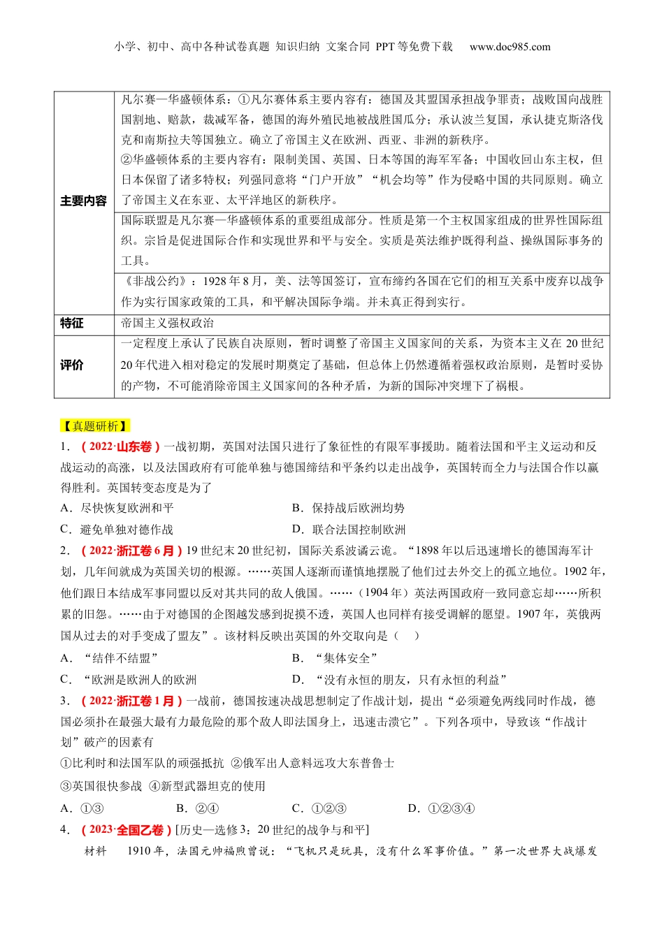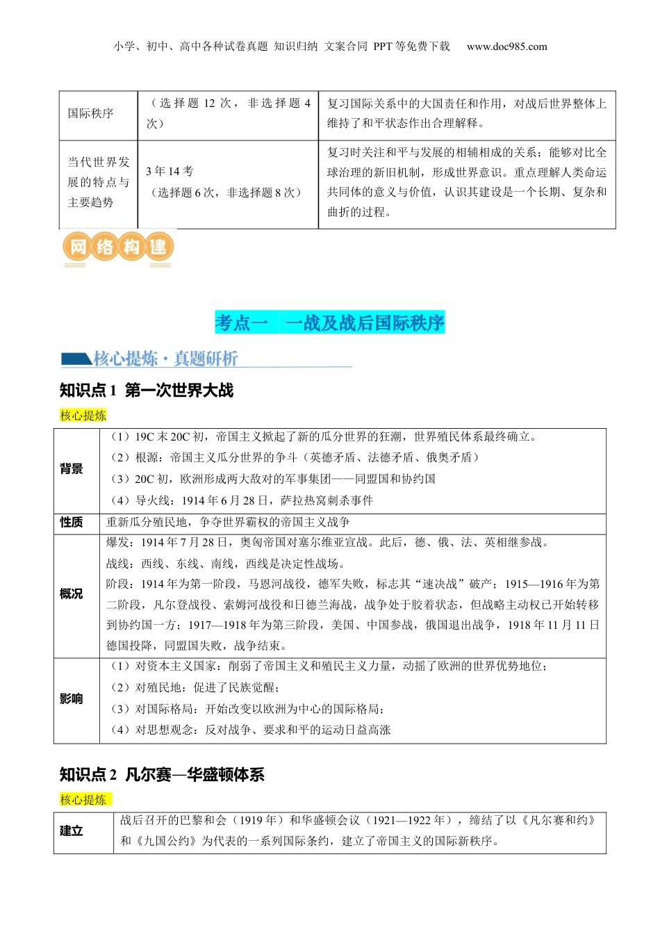 小学、初中、高中各种试卷真题知识归纳文案合同PPT等免费下载www.doc985.com题专13世界大战与世界格局的变演目录考情分析1网络构建2考点一一战及战后国际秩序3核心提炼·真题研析3知识点1第一次世界大战3知识点2凡尔赛—华盛顿体系3题型特训·命题预测5考点二二战及战后国际秩序7核心提炼·真题研析7知识点1第二次世界大战7知识点2战后国际秩序的形成7题型特训·命题预测12考点三当代世界发展的特点与主要趋势10核心提炼·真题研析10知识点1世界多极化与经济全球化10知识点2和平发展合作共赢的时代潮流12知识点3维护现代世界文化的多样性13题型特训·命题预测17考点要求考题(统计2021—2023)考建备议一战及战后国际秩序3年12考(选择题6次,非选择题6次)3年考查基本平衡,把握其主要脉络;结合文献记载和数据材料,关注凡尔赛—华盛顿体系对战后国际秩序的影响;结合历史与现实,理解战争的残酷性及其给人类文明带来的灾难,进行重点复习。二战及战后3年16考三年考查较多,关注理解二战后国际秩序的变动。重点小学、初中、高中各种试卷真题知识归纳文案合同PPT等免费下载www.doc985.com国际秩序(选择题12次,非选择题4次)复习国际关系中的大国责任和作用,对战后世界整体上维持了和平状态作出合理解释。当代世界发展的特点与主要趋势3年14考(选择题6次,非选择题8次)复习时关注和平与发展的相辅相成的关系;能够对比全球治理的新旧机制,形成世界意识。重点理解人类命运共同体的意义与价值,认识其建设是一个长期、复杂和曲折的过程。考点一一战及战后国际秩序知识点1第一次世界大战核心提炼背景(1)19C末20C初,帝国主义掀起了新的瓜分世界的狂潮,世界殖民体系最终确立。(2)根源:帝国主义瓜分世界的争斗(英德矛盾、法德矛盾、俄奥矛盾)(3)20C初,欧洲形成两大敌对的军事集团——同盟国和协约国(4)导火线:1914年6月28日,萨拉热窝刺杀事件性质重新瓜分殖民地,争夺世界霸权的帝国主义战争概况爆发:1914年7月28日,奥匈帝国对塞尔维亚宣战。此后,德、俄、法、英相继参战。战线:西线、东线、南线,西线是决定性战场。阶段:1914年为第一阶段,马恩河战役,德军失败,标志其“速决战”破产;1915—1916年为第二阶段,凡尔登战役、索姆河战役和日德兰海战,战争处于胶着状态,但战略主动权已开始转移到协约国一方;1917—1918年为第三阶段,美国、中国参战,俄国退出战争,1918年11月11日德国投降,同盟国失败,战争结束。影响(1)对资本主义国家:削弱了帝国主义和殖民主义力量,动摇了欧洲的世界优势地位;(2)对殖民地:促进了民族觉醒;(3)对国际格局:开始改变以欧洲为中心的国际格局;(4)对思想观念:反对战争、要求和平的运动日益高涨知识点2凡尔赛—华盛顿体系核心提炼建立战后召开的巴黎和会(1919年)和华盛顿会议(1921—1922年),缔结了以《凡尔赛和约》和《九国公约》为代表的一系列国际条约,建立了帝国主义的国际新秩序。小学、初中、高中各种试卷真题知识归纳文案合同PPT等免费下载www.doc985.com主要内容凡尔赛—华盛顿体系:①凡尔赛体系主要内容有:德国及其盟国承担战争罪责;战败国向战胜国割地、赔款,裁减军备,德国的海外殖民地被战胜国瓜分;承认波兰复国,承认捷克斯洛伐克和南斯拉夫等国独立。确立了帝国主义在欧洲、西亚、非洲的新秩序。②华盛顿体系的主要内容有:限制美国、英国、日本等国的海军军备;中国收回山东主权,但日本保留了诸多特权;列强同意将“门户开放”“机会均等”作为侵略中国的共同原则。确立了帝国主义在东亚、太平洋地区的新秩序。国际联盟是凡尔赛—华盛顿体系的重要组成部分。性质是第一个主权国家组成的世界性国际组织。宗旨是促进国际合作和实现世界和平与安全。实质是英法维护既得利益、操纵国际事务的工具。《非战公约》:1928年8月,美、法等国签订,宣布缔约各国在它们的相互关系中废弃以战争作为实行国家政策的工具,和平解决国际争端。并未真正得到实行。特征帝国主义强权政治评价一定程度上承认了民族自决原则,暂时调整了帝国主义国家间的关系,为资本主义在20世纪20年代进入相对稳定的发...