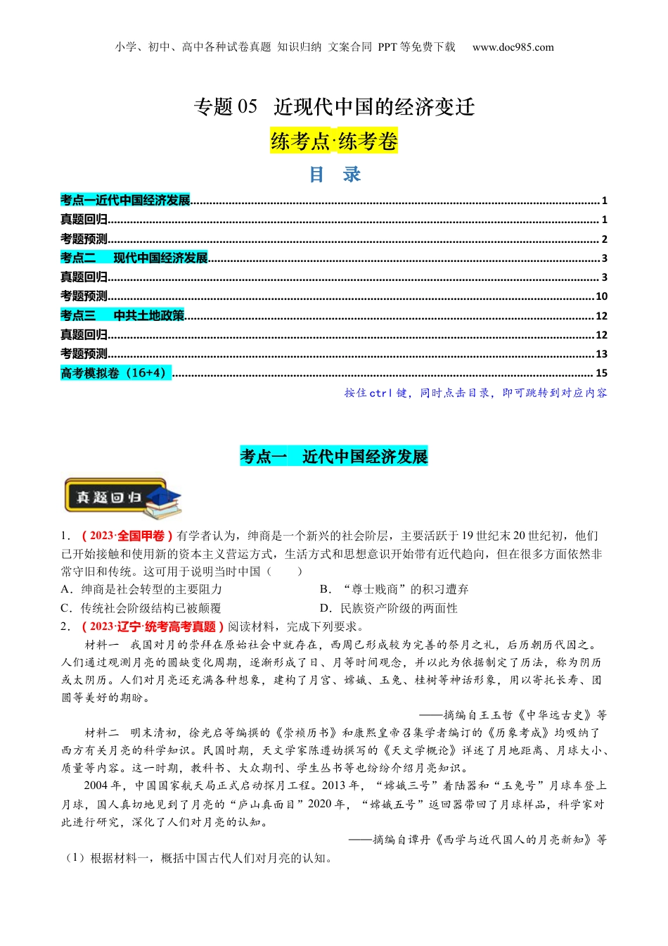 小学、初中、高中各种试卷真题知识归纳文案合同PPT等免费下载www.doc985.com专题05近现代中国的经济变迁练考点·练考卷目录考点一近代中国经济发展................................................................................................................................1真题回归..........................................................................................................................................................1考题预测..........................................................................................................................................................2考点二现代中国经济发展...........................................................................................................................3真题回归..........................................................................................................................................................3考题预测........................................................................................................................................................10考点三中共土地政策................................................................................................................................12真题回归........................................................................................................................................................12考题预测........................................................................................................................................................13高考模拟卷(16+4)....................................................................................................................................15按住ctrl键,同时点击目录,即可跳转到对应内容考点一近代中国经济发展1.(2023·全国甲卷)有学者认为,绅商是一个新兴的社会阶层,主要活跃于19世纪末20世纪初,他们已开始接触和使用新的资本主义营运方式,生活方式和思想意识开始带有近代趋向,但在很多方面依然非常守旧和传统。这可用于说明当时中国()A.绅商是社会转型的主要阻力B.“尊士贱商”的积习遭弃C.传统社会阶级结构已被颠覆D.民族资产阶级的两面性2.(2023·辽宁·统考高考真题)阅读材料,完成下列要求。材料一我国对月的崇拜在原始社会中就存在,西周已形成较为完善的祭月之礼,后历朝历代因之。人们通过观测月亮的圆缺变化周期,逐渐形成了日、月等时间观念,并以此为依据制定了历法,称为阴历或太阴历。人们对月亮还充满各种想象,建构了月宫、嫦娥、玉兔、桂树等神话形象,用以寄托长寿、团圆等美好的期盼。——摘编自王玉哲《中华远古史》等材料二明末清初,徐光启等编撰的《崇祯历书》和康熙皇帝召集学者编订的《历象考成》均吸纳了西方有关月亮的科学知识。民国时期,天文学家陈遵妫撰写的《天文学概论》详述了月地距离、月球大小、质量等内容。这一时期,教科书、大众期刊、学生丛书等也纷纷介绍月亮知识。2004年,中国国家航天局正式启动探月工程。2013年,“嫦娥三号”着陆器和“玉兔号”月球车登上月球,国人真切地见到了月亮的“庐山真面目”2020年,“嫦娥五号”返回器带回了月球样品,科学家对此进行研究,深化了人们对月亮的认知。——摘编自谭丹《西学与近代国人的月亮新知》等(1)根据材料一,概括中国古代人们对月亮的认知。小学、初中、高中各种试卷真题知识归纳文案合同PPT等免费下载www.doc985.com(2)根据材料并结合所学知识,概括明清以来国人对月亮认知的变化并分析其原因。1.1912年8月,北洋政府计划将轮船招商局收归国有。10月,股东们在《民立报》发表文章称:“不知公司改革,权在股东,苟非转售外人,即在专制时代亦不能横加干预。”经过一番较量,最终政府打...