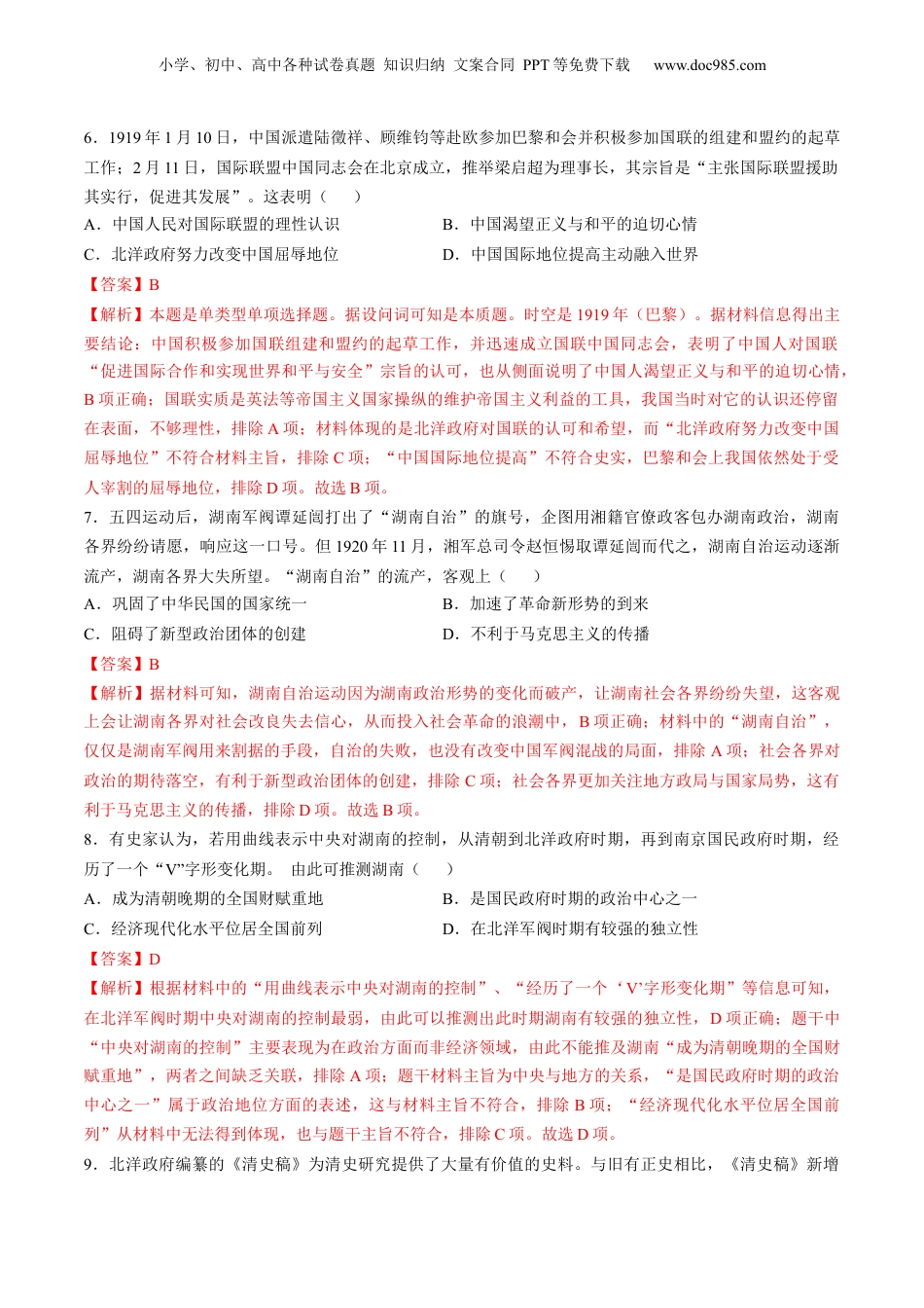 小学、初中、高中各种试卷真题知识归纳文案合同PPT等免费下载www.doc985.com专题五晚清到清末民初:内忧外患与救亡道路的尝试考试范围:第14—17讲;考试时间:100分钟;注意事项:1.答卷前,考生务必将自己的姓名、准考证号等填写在答题卡和试卷指定位置上。2.回答选择题时,选出每小题答案后,用铅笔把答题卡上对应题目的答案标号涂黑。如需改动,用橡皮擦干净后,再选涂其他答案标号。回答非选择题时,将答案写在答题卡上。写在本试卷上无效。3.考试结束后,将本试卷和答题卡一并交回第I卷(选择题)一、选择题:本题共16小题,每小题3分,共48分。1.孙中山深切地认识到,八年以来中华民国政治不良到这个地步,就是“因为单破坏地面,没有掘地底陈土的缘故”,今后“改造中国的第一步”,只有重新开始革命,扫清官僚、政客、武人这些“地底的陈土”。这体现了孙中山()A.与袁世凯势力彻底决裂B.宪政理论的完善与推广C.革命思想的嬗变与升华D.新三民主义的正式形成【答案】C【解析】本题是单类型单项选择题。根据主题干的设问词,可知是本质题。时空是:民国初年(中国)。据材料“八年以来中华民国”可知材料所述内容发生的时间约为1919年前后,据材料“重新开始革命,扫清官僚、政客、武人这些‘地底的陈土’”,并结合所学可知,在二次革命、护国运动、护法运动失败后,孙中山开始意识到中国问题的症结就在于封建官僚、政客和军阀的反动统治,主张继续进行革命,推翻北洋军阀,这体现了孙中山革命思想的嬗变与升华,C项正确;1915年袁世凯阴谋复辟帝制,孙中山领导了护国运动,1916年袁世凯病死,排除A项;材料主要讲孙中山主张推翻北洋军阀和其他封建势力,与宪政理论关系不大,排除B项;1924年1月,孙中山在中国国民党第一次全国代表大会提出了新三民主义的主张,排除D项。故选C项。2.中华民国南京临时政府成立时实行总统制,《中华民国临时约法》改总统制为责任内阁制,袁世凯正式就任大总统后,又改责任内阁制为总统制。上述现象反映的实质问题是()A.责任内阁制在中国行不通B.在当时的中国只能实行总统制C.民主与专制的斗争激烈D.专制独裁的传统在中国没有受到冲击【答案】C【解析】结合所学知识可知,清帝即位后,为维护民主革命成果,防范袁世凯独裁,孙中山等人通过《临时约法》将政体从总统制调整为责任内阁制,袁世凯镇压二次革命后,改责任内阁制为总统制,民国初年政体的频繁变化反映的实质问题是,民主与专制的斗争激烈,C项正确;政体变化和袁世凯废除责任内阁制只是表面现象,并非材料反映的实质问题,排除A项;在当时的中国只能实行总统制的说法绝对,排除B项;专制独裁的传统在中国没有受到冲击与“中华民国南京临时政府成立”和《中华民国临时约法》的小学、初中、高中各种试卷真题知识归纳文案合同PPT等免费下载www.doc985.com颁布等不符,排除D项。故选C项。3.1912年至1916年的袁世凯统治时期,先后产生了唐绍仪、段祺瑞等8届内阁;1916年至1924年的9年间,则先后历经了27届政府内阁,其中最短的两届内阁存在不到一周。造成这一现象的主要原因是()A.政治体制存在缺陷B.各地军阀割据混战C.责任内阁名存实亡D.民众参政热情高涨【答案】A【解析】根据材料“1912年至1916年的袁世凯统治时期,先后产生了唐绍仪、段祺瑞等8届内阁;1916年至1924年的9年间,则先后历经了27届政府内阁,其中最短的两届内阁存在不到一周。”可知,民国政治体制很大程度上模仿法国、美国体制,同中国国情不能完全适应,导致内阁动荡,因此不能完全适应国情的制度是存在缺陷的,A项正确;军阀混战不是导致材料现象出现的主要原因,排除B项:责任内阁名存实亡是材料的表现,设问要求回答主要原因,排除C项;民众参政热情高涨,与民国时期的历史史实不符,排除D项。故选A项。4.盖中国如欲保存独立,不得不用立宪政治,而从其国之历史习惯社会经济状况,与夫列强之关系观之,则中国之立宪,以君主制行之为易,以共和制行之则较难也——(美)古德若1913年《共和与君主论》该文章()A.为保皇派反对革命派提供了理论依据B.为维新派变法提供了思想武器C.为复辟...