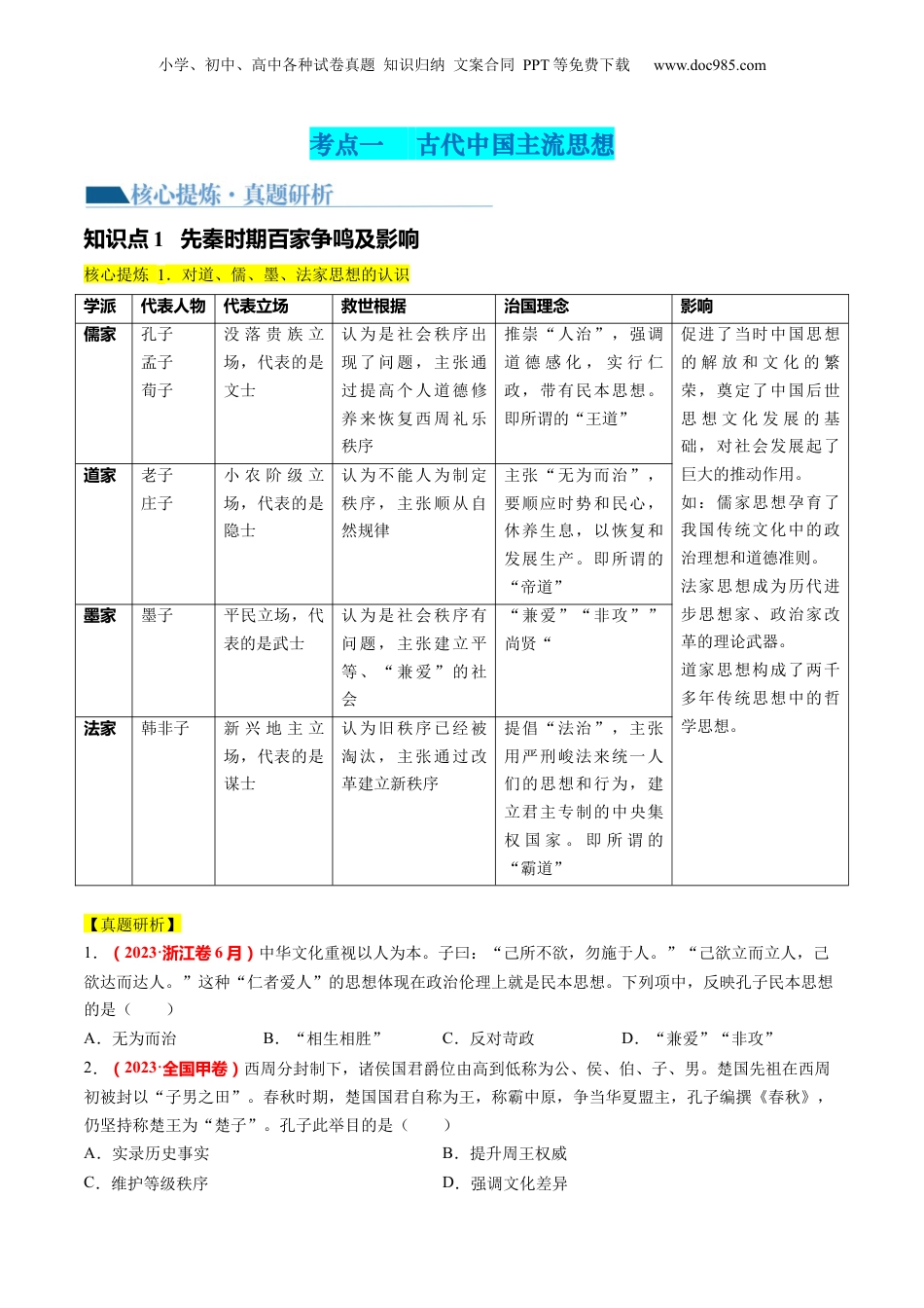 小学、初中、高中各种试卷真题知识归纳文案合同PPT等免费下载www.doc985.com题专03古代中国的思想文化科学艺术与目录考情分析1网络构建2考点一古代中国主流思想3核心提炼·真题研析3知识点1先秦时期百家争鸣及影响3知识点2儒家思想的演变4题型特训·命题预测6考点二古代中国科学技术与文学艺术核心提炼·真题研析8知识点1古代中国科学技术8知识点2古代中国文学艺术10题型特训·命题预测13按住ctrl键,同时点击目录,即可跳转到对应内容考点要求考题统(计2021—2023)考建备议古代中国主流思想先秦时期百家争鸣及影响3年8考(选择题8次)3年考查基本平衡,重点是儒家思想的演变过程,三教并行、程朱理学都是复习重点。儒家思想的演变3年4考(选择题2次,非选择题2次)古代中国科学技术与文学艺术古代中国科学技术3年4考(选择题2次,非选择题2次)古代的科学技术和文学艺术三年考查较多,多数集中在宋元明清时期,复习时重点关注,尤其小说戏曲近几年考查多。古代中国文学艺术3年16考(选择题14次,非选择题2次)小学、初中、高中各种试卷真题知识归纳文案合同PPT等免费下载www.doc985.com考点一古代中国主流思想知识点1先秦时期百家争鸣及影响核心提炼1.对道、儒、墨、法家思想的认识学派代表人物代表立场救世根据治国理念影响儒家孔子孟子荀子没落贵族立场,代表的是文士认为是社会秩序出现了问题,主张通过提高个人道德修养来恢复西周礼乐秩序推崇“人治”,强调道德感化,实行仁政,带有民本思想。即所谓的“王道”促进了当时中国思想的解放和文化的繁荣,奠定了中国后世思想文化发展的基础,对社会发展起了巨大的推动作用。如:儒家思想孕育了我国传统文化中的政治理想和道德准则。法家思想成为历代进步思想家、政治家改革的理论武器。道家思想构成了两千多年传统思想中的哲学思想。道家老子庄子小农阶级立场,代表的是隐士认为不能人为制定秩序,主张顺从自然规律主张“无为而治”,要顺应时势和民心,休养生息,以恢复和发展生产。即所谓的“帝道”墨家墨子平民立场,代表的是武士认为是社会秩序有问题,主张建立平等、“兼爱”的社会“兼爱”“非攻””尚贤“法家韩非子新兴地主立场,代表的是谋士认为旧秩序已经被淘汰,主张通过改革建立新秩序提倡“法治”,主张用严刑峻法来统一人们的思想和行为,建立君主专制的中央集权国家。即所谓的“霸道”【真题研析】1.(2023·浙江卷6月)中华文化重视以人为本。子曰:“己所不欲,勿施于人。”“己欲立而立人,己欲达而达人。”这种“仁者爱人”的思想体现在政治伦理上就是民本思想。下列项中,反映孔子民本思想的是()A.无为而治B.“相生相胜”C.反对苛政D.“兼爱”“非攻”2.(2023·全国甲卷)西周分封制下,诸侯国君爵位由高到低称为公、侯、伯、子、男。楚国先祖在西周初被封以“子男之田”。春秋时期,楚国国君自称为王,称霸中原,争当华夏盟主,孔子编撰《春秋》,仍坚持称楚王为“楚子”。孔子此举目的是()A.实录历史事实B.提升周王权威C.维护等级秩序D.强调文化差异小学、初中、高中各种试卷真题知识归纳文案合同PPT等免费下载www.doc985.com3.(2023·全国新课标卷)荀子是战国时期著名的儒家学者,他的学生韩非、李斯则是法家学派代表人物。下列能代表三人在治国方略上共同主张的是()A.“起法正以治之,重刑罚以禁之”B.“尧舜之道,不以仁政,不能平治天下”C.“道之以德,齐之以礼,有耻且格”D.“绝仁弃义,民复孝慈;绝巧弃利,盗贼无有”4.(2022·全国甲卷)汉晋时期有多种文本记载,帝尧之时,“天下太和,百姓无事”。有老者“击壤”而戏,围观者称颂帝尧。老者歌云:“吾日出而作,日入而息,凿井而饮,耕地而食,帝何德于我哉!”上述记载所体现的政治理念最接近()A.孔子B.老子C.韩非D.墨子知识点2儒家思想的演变核心提炼1.儒家思想的演变时期地位原因春秋战国儒家思想受到统治者的冷落“仁政”“德治”等主张虽然有利于缓和社会矛盾,但在诸侯争霸、战乱不断的年代,这些主张不能适应当时激烈的社会变革秦朝儒家思想受到压制秦统一后,儒生依旧遵守旧的主张,非议郡县制...
