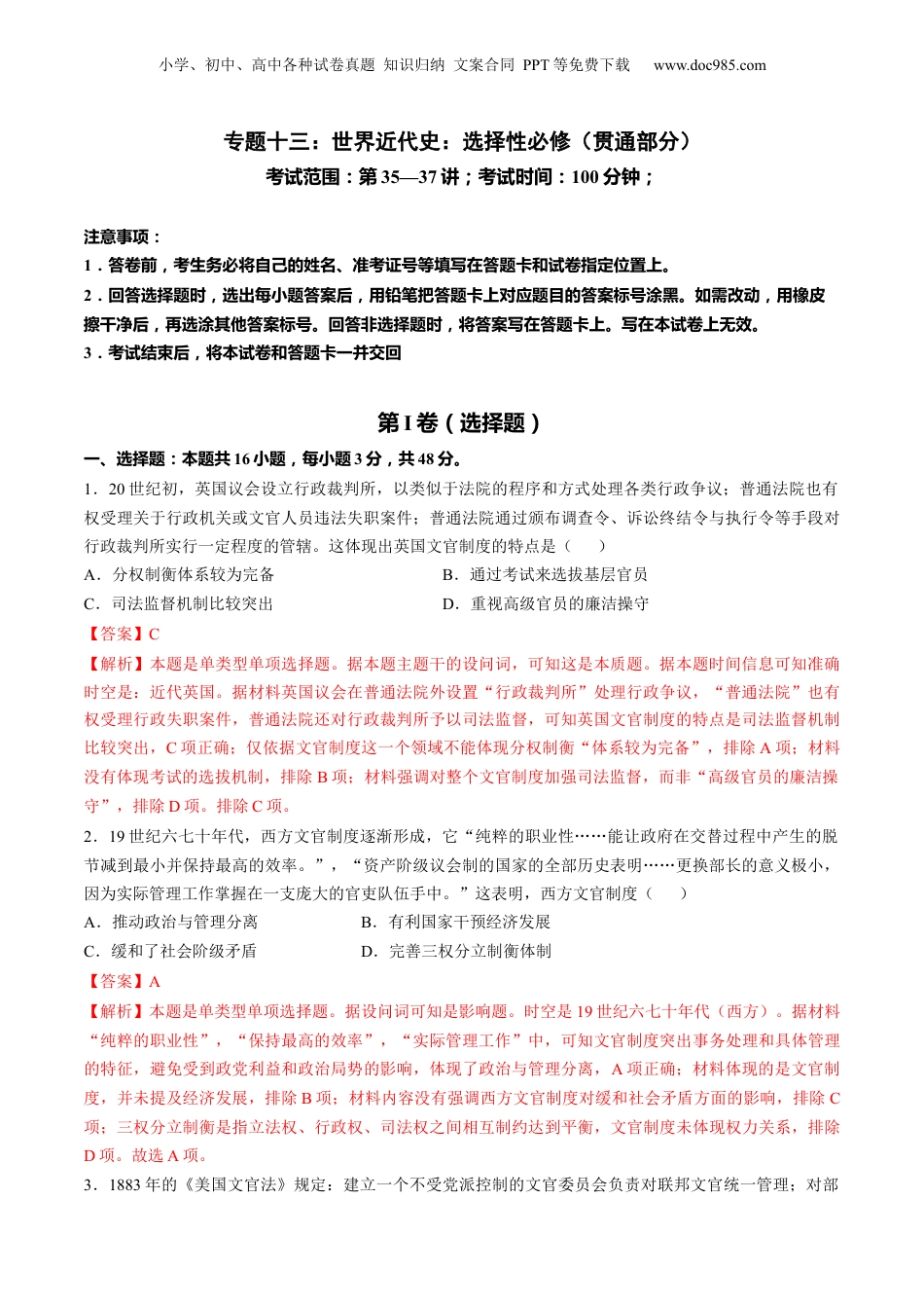 小学、初中、高中各种试卷真题知识归纳文案合同PPT等免费下载www.doc985.com专题十三:世界近代史:选择性必修(贯通部分)考试范围:第35—37讲;考试时间:100分钟;注意事项:1.答卷前,考生务必将自己的姓名、准考证号等填写在答题卡和试卷指定位置上。2.回答选择题时,选出每小题答案后,用铅笔把答题卡上对应题目的答案标号涂黑。如需改动,用橡皮擦干净后,再选涂其他答案标号。回答非选择题时,将答案写在答题卡上。写在本试卷上无效。3.考试结束后,将本试卷和答题卡一并交回第I卷(选择题)一、选择题:本题共16小题,每小题3分,共48分。1.20世纪初,英国议会设立行政裁判所,以类似于法院的程序和方式处理各类行政争议;普通法院也有权受理关于行政机关或文官人员违法失职案件;普通法院通过颁布调查令、诉讼终结令与执行令等手段对行政裁判所实行一定程度的管辖。这体现出英国文官制度的特点是()A.分权制衡体系较为完备B.通过考试来选拔基层官员C.司法监督机制比较突出D.重视高级官员的廉洁操守【答案】C【解析】本题是单类型单项选择题。据本题主题干的设问词,可知这是本质题。据本题时间信息可知准确时空是:近代英国。据材料英国议会在普通法院外设置“行政裁判所”处理行政争议,“普通法院”也有权受理行政失职案件,普通法院还对行政裁判所予以司法监督,可知英国文官制度的特点是司法监督机制比较突出,C项正确;仅依据文官制度这一个领域不能体现分权制衡“体系较为完备”,排除A项;材料没有体现考试的选拔机制,排除B项;材料强调对整个文官制度加强司法监督,而非“高级官员的廉洁操守”,排除D项。排除C项。2.19世纪六七十年代,西方文官制度逐渐形成,它“纯粹的职业性……能让政府在交替过程中产生的脱节减到最小并保持最高的效率。”,“资产阶级议会制的国家的全部历史表明……更换部长的意义极小,因为实际管理工作掌握在一支庞大的官吏队伍手中。”这表明,西方文官制度()A.推动政治与管理分离B.有利国家干预经济发展C.缓和了社会阶级矛盾D.完善三权分立制衡体制【答案】A【解析】本题是单类型单项选择题。据设问词可知是影响题。时空是19世纪六七十年代(西方)。据材料“纯粹的职业性”,“保持最高的效率”,“实际管理工作”中,可知文官制度突出事务处理和具体管理的特征,避免受到政党利益和政治局势的影响,体现了政治与管理分离,A项正确;材料体现的是文官制度,并未提及经济发展,排除B项;材料内容没有强调西方文官制度对缓和社会矛盾方面的影响,排除C项;三权分立制衡是指立法权、行政权、司法权之间相互制约达到平衡,文官制度未体现权力关系,排除D项。故选A项。3.1883年的《美国文官法》规定:建立一个不受党派控制的文官委员会负责对联邦文官统一管理;对部小学、初中、高中各种试卷真题知识归纳文案合同PPT等免费下载www.doc985.com分官职实行竞争性考试;禁止文官参加党派活动等。这些规定()A.保证了政府工作的稳定持续B.消除了公务人员的贪腐行为C.加剧了社会阶层的固化现象D.加强了联邦政府的行政权力【答案】A【解析】依据材料“建立一个不受党派控制的文官委员会负责对联邦文官统一管理;对部分官职实行竞争性考试;禁止文官参加党派活动等”,可以看出美国通过法律文件的形式,制定文官的统一管理、竞争考试以及禁止参加党派活动等措施,这样可以有效保证政府工作的稳定持续,A项正确;“消除”,表述绝对,排除B项;材料体现的是美国文官制度的相关规定所起到的积极作用,不能得出其对社会阶层固化的影响,排除C项;文官制度是官员的选拔,不能看出联邦政府行政权力的变化,排除D项。故选A项。4.有学者认为,罗马法横跨巨大的时空,不仅满足了它赖以产生的简单商品社会,还满足了在高度发展的社会生活所需的法律价值、精神、原则。由此可知,罗马法的永恒价值主要基于其()A.法律体系B.司法程序C.法律条文D.法治观念【答案】D【解析】本题是单类型单项选择题。据本题主题干的设问词,可知这是推断题。据本题时间信息可知准确时空是:古代(罗马)。根据材料“罗马法横跨巨大的时空,不仅...