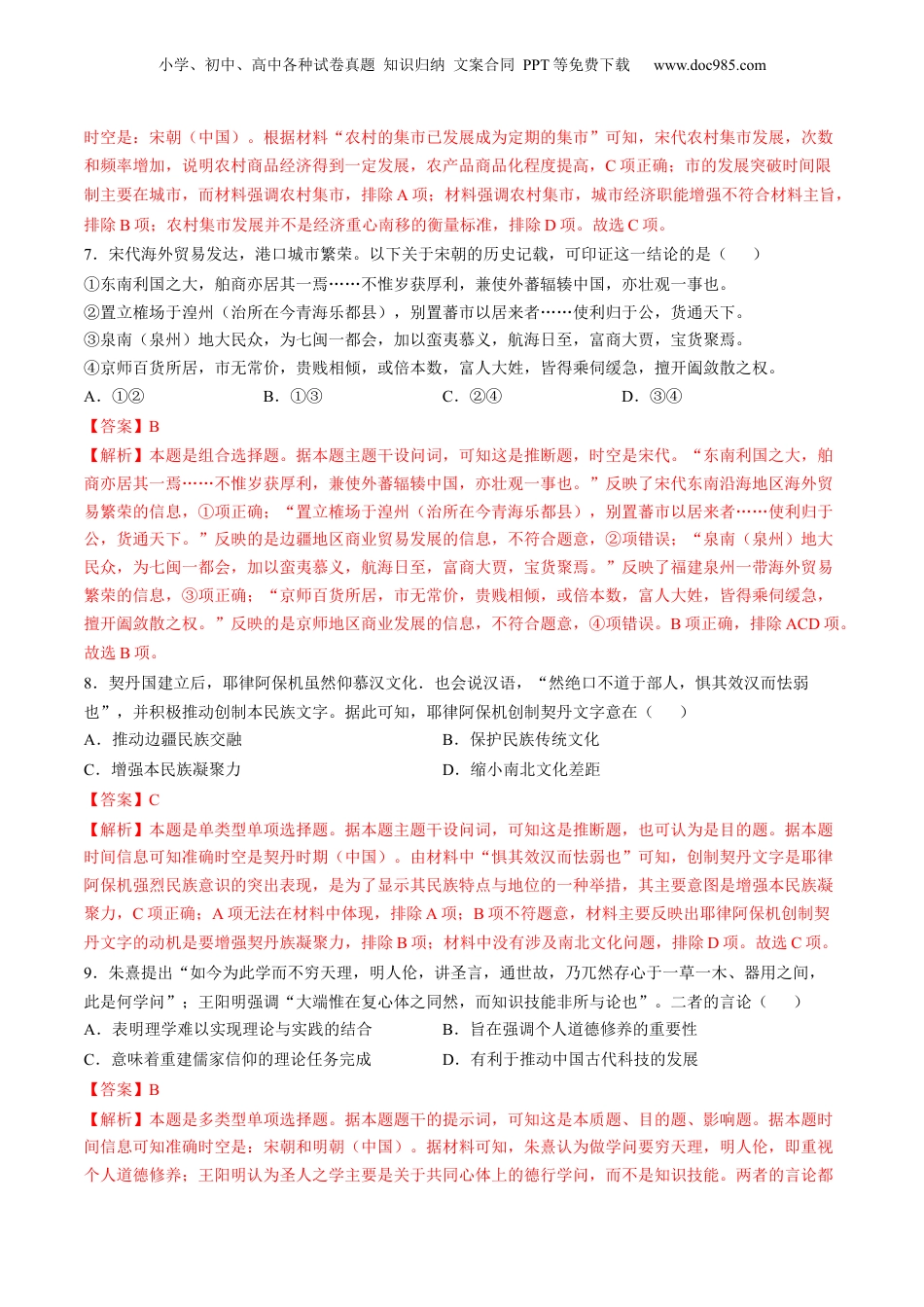 小学、初中、高中各种试卷真题知识归纳文案合同PPT等免费下载www.doc985.com专题三:宋元到明清:多民族政权的并立、统一和中国版图的奠定考试范围:第6—9讲;考试时间:100分钟。注意事项:1.答卷前,考生务必将自己的姓名、准考证号等填写在答题卡和试卷指定位置上。2.回答选择题时,选出每小题答案后,用铅笔把答题卡上对应题目的答案标号涂黑。如需改动,用橡皮擦干净后,再选涂其他答案标号。回答非选择题时,将答案写在答题卡上。写在本试卷上无效。3.考试结束后,将本试卷和答题卡一并交回第I卷(选择题)一、选择题:本题共16小题,每小题3分,共48分。1.北宋统治者将募兵发展为一种有意识的“养兵”政策,以此稳定社会秩序、消除动乱,结果导致军队数量不断增加,军费恶性膨胀。为改变这一局面,王安石()A.实行按军功授爵制B.推行“兵农合一”征兵制C.定期更换禁军驻地D.任用文官担任枢密院长官【答案】B【解析】本题是单类型单项选择题。据本题主题干的设问词,可知这是推断题。据本题时间信息可知准确时空是:北宋(中国)。据材料和所学可知,北宋实行“养兵”政策,结果造成冗兵、冗费,加重了财政危机,为了改变这一局面,王安石变法推行“兵农合一”的保甲法,把农民变为保甲,平时维护治安,战时参加作战,既防止农民的反抗,又节省了军费,B项正确;战国时期商鞅变法推行按军功授爵,排除A项;定期更换禁军驻地、任用文官担任枢密院长官,都不能改变“军队数量不断增加,军费恶性膨胀”的局面,排除CD项。故选B项。2.宋代盛行郊祭大礼和恩荫制。自宋真宗、仁宗起,每三年举行一次盛大的祭天地、祭祖宗的活动,每逢祭祀,大小各官,皆得恩荫,仅北宋末年的一次祭天大典就有4000人恩荫得官。由此可以推知宋代()A.阶级固化现象初现B.恩荫入仕成为主流C.官僚体系日趋完善D.王朝统治存在危机【答案】D【解析】本题为单类型单项选择题。根据设问可知,这是推断题。时空范围为宋代中国。宋代在祭祀大典时候大量恩荫官员,这加速了宋代冗官现象,增加了政府的财政负担,可以推断出宋代王朝统治存在危机,D项正确;宋代科举制相对完善,社会阶层流动性强,排除A项;宋代主要的入仕途径是科举制,排除B项;通过祭祀大典上的恩荫现象无法推断出当时官僚体系发展程度,排除C项。故选D项。3.北宋“分天下为十余路,各置转运使……使朝廷之令必行于转运使,转运使之令必行于州,州之令必行于县,县之令必行于吏民,然后上下之叙正,而纪纲立矣”。这一行政管理模式()小学、初中、高中各种试卷真题知识归纳文案合同PPT等免费下载www.doc985.comA.呈现权力相互牵制的特色B.抬高了文官与士人的地位C.助长因循守旧的政治风气D.有利于维护中央集权稳定【答案】D【解析】本题是单类型单项选择题。据本题主题干的设问词,可知这是影响题。据本题时间信息可知准确时空是:北宋(中国)。根据材料可知,北宋设置各路转运使传递政令,推动政令的逐级实施,这种行政管理模式强化了中央集权,D项正确;材料中的行政单位是上下级隶属关系,而非相互制约关系,排除A项;重文轻武政策抬高了文官与士人的地位,从材料看不出文官与士人的地位,排除B项;材料体现不出因循守旧的政治风气,排除C项。故选D项。4.辽国建立后,任用汉人参与礼制建构,制定了吉礼、凶礼、军礼、宾礼、嘉礼等。相比于汉唐以来礼乐式微之势,辽礼更具完整性、礼仪性,可谓中原礼乐之重建。由此可知()A.辽国实行南北面官制度B.儒家文化主流地位确立C.民族文化融合程度深入D.少数民族普遍接受礼乐【答案】C【解析】本题是单类型单项选择题。据本题主题干的设问词,可知这是推断题。据本题时间信息可知准确时空是:辽代(中国)。根据题材料“汉人参与礼制建构……辽礼更具完整性、礼仪性,可谓中原礼乐之重建”可知,辽国借鉴了汉人的礼乐制度且更具完整性和礼仪性,这说明此时民族文化融合程度加深,C项正确;材料没有涉及南北面官制度,排除A项;汉武帝时期,儒家文化主流地位确立,排除B项;“普遍”说法过于绝对,排除D项。故选C项。5.忽必烈建立元朝后,在中央设立中书省,任命右丞...