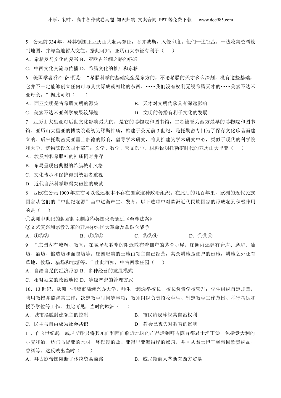 小学、初中、高中各种试卷真题知识归纳文案合同PPT等免费下载www.doc985.com专题九史前时代至中古时期:早期文明的产生与多元世界的初现考试范围:第26—27讲;考试时间:100分钟;注意事项:1.答卷前,考生务必将自己的姓名、准考证号等填写在答题卡和试卷指定位置上。2.回答选择题时,选出每小题答案后,用铅笔把答题卡上对应题目的答案标号涂黑。如需改动,用橡皮擦干净后,再选涂其他答案标号。回答非选择题时,将答案写在答题卡上。写在本试卷上无效。3.考试结束后,将本试卷和答题卡一并交回第I卷(选择题)一、选择题:本题共16小题,每小题3分,共48分。1.斯塔夫里阿诺斯在《全球通史》中指出:“种植植物能养活的人口要比采集食物所能养活的人口多得多。……农业生产率增长使食物有了剩余,能供养新产生的祭司阶级、士兵和吏。……文字就是祭司们出于记事的需要而做出的一大发明。”这说明()A.文字的产生是进入文明社会的唯一标志B.农耕畜牧业的产生是人类迈向文明的前提C.古代文明产生于祭司对神灵的真诚的崇拜D.私有制的产生是人类迈向文明进步的结果2.《汉谟拉比法典》规定:“如果一个人偷了一头牛,一只羊……如果它属于神或者王官,他要赔偿30倍;如果它属于平民,他要赔偿10倍;如果窃贼没有可赔偿的,他应该被处死。”“如果一个人债务缠身,暴风雨神阿达德摧毁了他的田地,或者洪水冲走了作物……在那一年,他可以不向他的债主归还粮食,他可以暂停履行他的合同,他可以不付那一年的利息。”据此可知《汉谟拉比法典》()A.是世界上现存最早的较为完整的成文法典B.使得古巴比伦人民享有法律面前人人平等C.协调借贷等社会关系,维护有产者的利益D.成为近代英美法系和大陆法系的历史源头3.雅典执政官梭伦曾规定:“凡愿意者皆被允许替遭受不公平对待的人申冤”及“向陪审法庭申诉”“凡是在城邦陷入纷争时不拿起武器跟随某一派别者,将被剥夺其公民资格并且不得参与城邦事务。”梭伦这些规定旨在()A.培养公民积极参政的品德B.为雅典民主政治奠基C.防止极端民主政体的出现D.积极维护公民参政权4.罗马共和国文化象征的西塞罗,曾经去斯多葛学派开创者芝诺的学校(雅典)学习;斯多葛哲学家塞涅卡,也曾做过罗马皇帝尼禄的老师和高参;罗马著名的皇帝哈德良和马克奥勒留,都一度在斯多葛哲学家爱比克泰德创办的学校学习。这表明古罗马文化()A.具有明显的功利色彩B.呈现出多元一体的特征C.深受希腊文明的影响D.推动了欧洲社会的转型小学、初中、高中各种试卷真题知识归纳文案合同PPT等免费下载www.doc985.com5.公元前334年,马其顿国王亚历山大起兵东征,吞并波斯,入侵印度。他们一边征战,一边收集资料绘制地图,并与当地哲人交往。据此可知,亚历山大东征有利于()A.希腊罗马文化的复兴B.亚欧古丝绸之路的畅通C.中西文化交流与传播D.希腊文化的推广和东移6.美国学者乔治·萨顿说:“希腊科学的基础完全是东方的,不论希腊的天才多么深刻,没有这些基础,它并不一定能够创立任何可与其实际成就相比的东西。……我们没有权利无视希腊天才的……美索不达米亚母亲。”据此可知()A.西亚文明是古希腊文明的源头B.天才对文明传承具有深远影响C.美索不达米亚科学成果较辉煌D.文明的传播有利于文化的发展7.亚历山大里亚对后世文化影响最大的,是它的博物院和图书馆,二者被誉为西方最早的博物院和图书馆。亚历山大里亚的博物院最初为缪斯神庙,始建于公元前3世纪,是托勒密专门为了保存文化珍品而建立的。后来托勒密受亚里士多德的影响,倡导学术研究,将其扩建为学术研究中心,类似于现代的科学院和大学。博物院设立四个部门:文学、数学、天文医学。材料说明托勒密时代的亚历山大里亚()A.埃及神和希腊神的神庙同时并存B.布局呈现出典型的希腊城市风格C.文化传承和保护得到统治者重视D.近代自然科学取得突破性的成就8.西欧在公元1000年左右可以说还根本不存在国家这种政治组织。在此后的几百年里,欧洲的近代民族国家从它们的“中世纪起源”当中逐渐产生、发育。以下选项中对欧洲近代民族国家的形成起到积极作用的是()...