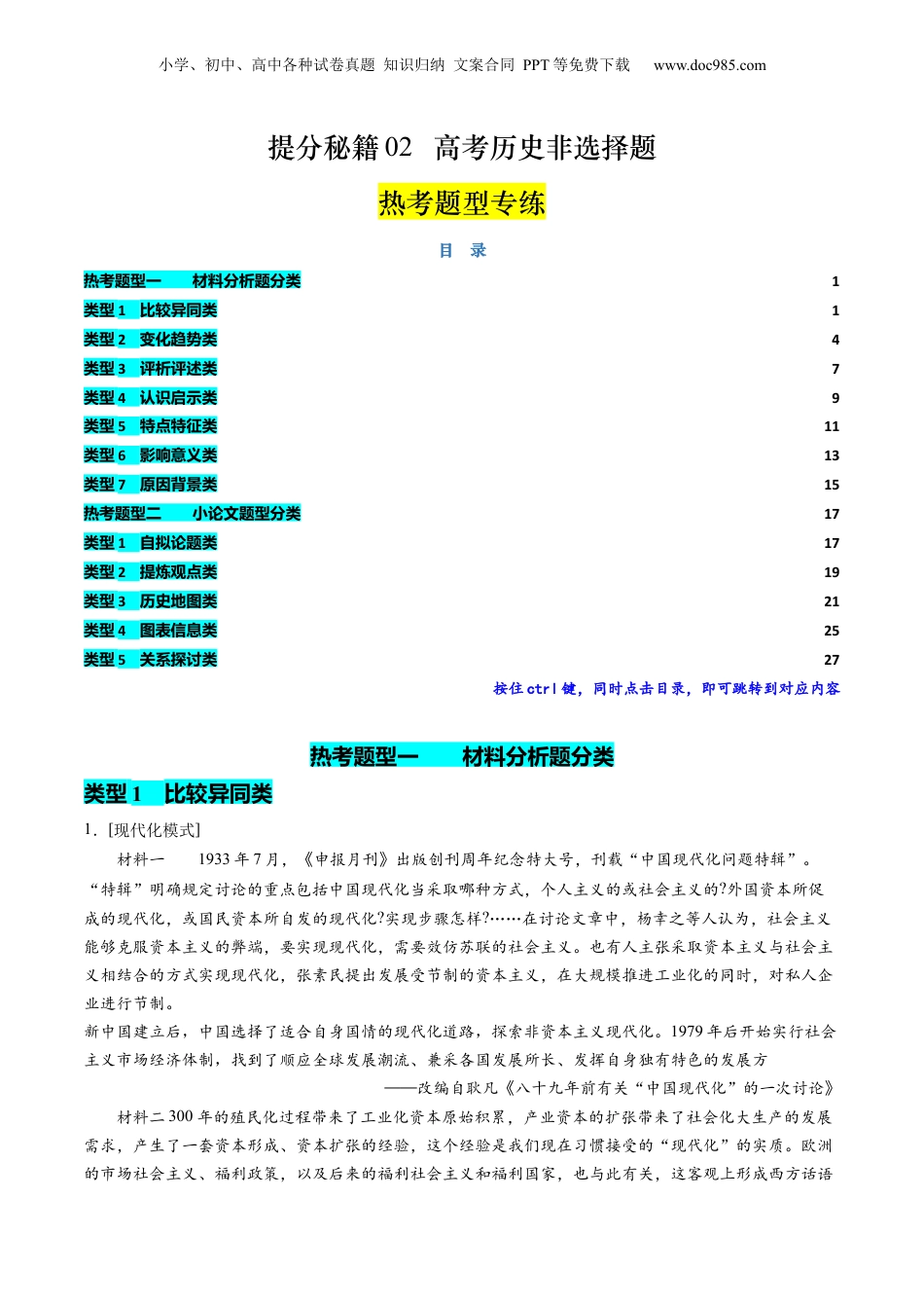 小学、初中、高中各种试卷真题知识归纳文案合同PPT等免费下载www.doc985.com提分秘籍02高考历史非选择题热考题型专练目录热考题型一材料分析题分类1类型1比较异同类1类型2变化趋势类4类型3评析评述类7类型4认识启示类9类型5特点特征类11类型6影响意义类13类型7原因背景类15热考题型二小论文题型分类17类型1自拟论题类17类型2提炼观点类19类型3历史地图类21类型4图表信息类25类型5关系探讨类27按住ctrl键,同时点击目录,即可跳转到对应内容热考题型一材料分析题分类类型1比较异同类1.[现代化模式]材料一1933年7月,《申报月刊》出版创刊周年纪念特大号,刊载“中国现代化问题特辑”。“特辑”明确规定讨论的重点包括中国现代化当采取哪种方式,个人主义的或社会主义的?外国资本所促成的现代化,或国民资本所自发的现代化?实现步骤怎样?……在讨论文章中,杨幸之等人认为,社会主义能够克服资本主义的弊端,要实现现代化,需要效仿苏联的社会主义。也有人主张采取资本主义与社会主义相结合的方式实现现代化,张素民提出发展受节制的资本主义,在大规模推进工业化的同时,对私人企业进行节制。新中国建立后,中国选择了适合自身国情的现代化道路,探索非资本主义现代化。1979年后开始实行社会主义市场经济体制,找到了顺应全球发展潮流、兼采各国发展所长、发挥自身独有特色的发展方——改编自耿凡《八十九年前有关“中国现代化”的一次讨论》材料二300年的殖民化过程带来了工业化资本原始积累,产业资本的扩张带来了社会化大生产的发展需求,产生了一套资本形成、资本扩张的经验,这个经验是我们现在习惯接受的“现代化”的实质。欧洲的市场社会主义、福利政策,以及后来的福利社会主义和福利国家,也与此有关,这客观上形成西方话语小学、初中、高中各种试卷真题知识归纳文案合同PPT等免费下载www.doc985.com环境中的“现代化”经验,使人不得不思考,这一经验是不是一个科学的东西。——摘编自钱乘旦《世界现代化进程》和罗荣渠《现代化新论》(1)根据材料-并结合所学知识,指出1933年这场“中国现代化”主题讨论的国际背景。(2)根据材料一、二并结合所学知识,比较中国式现代化与西方现代化的异同。2.阅读材料,完成下列要求。材料一疫情一起,广州市民开始抬神巡游,驱疫免灾。实际上,广州地方政府也卷入此类游戏中。……在《申报》大量有关广州疫情的报道中,见有酬神、施药、施医、施棺等公共活动,却始终没有公共卫生活动。这是因为,在中国的医学思想中,疫病是由天气不和所引起的。大多数论者都将华南的疫情当作天气亢旱,雨水不调的产物。——曹树基《1894年鼠疫大流行中的广州、香港和上海》材料二西人则不然。(香港)地方一有时疫,即由洁净局派人逐户查察。如屋中有不洁之物,必令洗涤净尽,更以药水遍洒室中,使无污秽之气。凡患疫者,则另设一地以处之,免致传染他人。街衢秽物,亦必辟除使尽,其有患疫而毙者,亦另择一地而葬之。随毙随葬,不少停留,以免秽气熏蒸。各厕所每日洗涤,投以生灰,以辟秽恶。——《申报·论中西治疫之不同》(1894年5月25日)材料三对于鼠疫,1890年代西方的治疗并不很有效。(香港)华人居民不仅反对他们认为荒谬的医疗,也反对非常具有侵略性的国家政策,尤其是强制性的逐户检查、强迫入院以及毁坏房屋。——【美】班凯乐《十九世纪中国的鼠疫》(1)根据材料一、二,概括1894年广州和香港应对鼠疫方式的异同。(2)根据上述材料并结合所学知识,分析香港的华人居民为什么反对政府的防疫行动。3.阅读材料,完成下列要求。材料欧洲在冷战中的地缘政治地位非常重要,苏联为回应美国的“遏制”政策,运用能源武器与美国在欧洲展开激烈博弈。二战后,苏联与西欧贸易几乎断绝,到50年代末,苏联与西欧能源贸易才逐步发展起来。20世纪70年代初期国际紧张局势缓和,“东西方经济联系的发展形成了物质实质,仿佛成为一种缓和的基础”。苏联与西欧贸易总额逐年增长,苏联极力推行“能源一体化”、“缓和物质化”,向西欧国家提供他们紧缺的石油和天然气换取外汇,并从西欧国家进口各种工业部门所需的成套设备。对西欧国家来说,这也是...