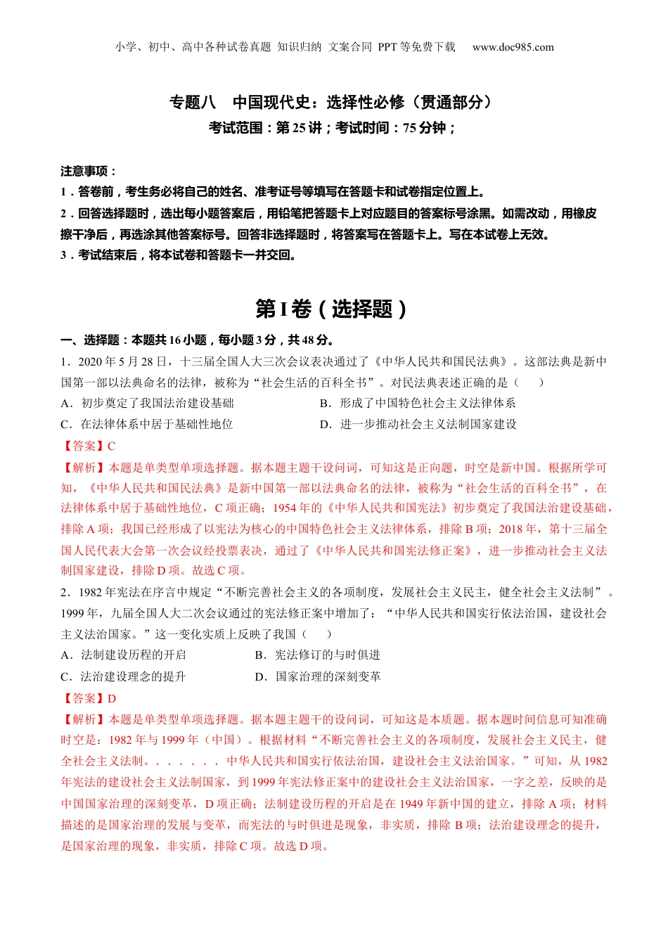 小学、初中、高中各种试卷真题知识归纳文案合同PPT等免费下载www.doc985.com专题八中国现代史:选择性必修(贯通部分)考试范围:第25讲;考试时间:75分钟;注意事项:1.答卷前,考生务必将自己的姓名、准考证号等填写在答题卡和试卷指定位置上。2.回答选择题时,选出每小题答案后,用铅笔把答题卡上对应题目的答案标号涂黑。如需改动,用橡皮擦干净后,再选涂其他答案标号。回答非选择题时,将答案写在答题卡上。写在本试卷上无效。3.考试结束后,将本试卷和答题卡一并交回。第I卷(选择题)一、选择题:本题共16小题,每小题3分,共48分。1.2020年5月28日,十三届全国人大三次会议表决通过了《中华人民共和国民法典》。这部法典是新中国第一部以法典命名的法律,被称为“社会生活的百科全书”。对民法典表述正确的是()A.初步奠定了我国法治建设基础B.形成了中国特色社会主义法律体系C.在法律体系中居于基础性地位D.进一步推动社会主义法制国家建设【答案】C【解析】本题是单类型单项选择题。据本题主题干设问词,可知这是正向题,时空是新中国。根据所学可知,《中华人民共和国民法典》是新中国第一部以法典命名的法律,被称为“社会生活的百科全书”,在法律体系中居于基础性地位,C项正确;1954年的《中华人民共和国宪法》初步奠定了我国法治建设基础,排除A项;我国已经形成了以宪法为核心的中国特色社会主义法律体系,排除B项;2018年,第十三届全国人民代表大会第一次会议经投票表决,通过了《中华人民共和国宪法修正案》,进一步推动社会主义法制国家建设,排除D项。故选C项。2.1982年宪法在序言中规定“不断完善社会主义的各项制度,发展社会主义民主,健全社会主义法制”。1999年,九届全国人大二次会议通过的宪法修正案中增加了:“中华人民共和国实行依法治国,建设社会主义法治国家。”这一变化实质上反映了我国()A.法制建设历程的开启B.宪法修订的与时俱进C.法治建设理念的提升D.国家治理的深刻变革【答案】D【解析】本题是单类型单项选择题。据本题主题干的设问词,可知这是本质题。据本题时间信息可知准确时空是:1982年与1999年(中国)。根据材料“不断完善社会主义的各项制度,发展社会主义民主,健全社会主义法制。......中华人民共和国实行依法治国,建设社会主义法治国家。”可知,从1982年宪法的建设社会主义法制国家,到1999年宪法修正案中的建设社会主义法治国家,一字之差,反映的是中国国家治理的深刻变革,D项正确;法制建设历程的开启是在1949年新中国的建立,排除A项;材料描述的是国家治理的发展与变革,而宪法的与时俱进是现象,非实质,排除B项;法治建设理念的提升,是国家治理的现象,非实质,排除C项。故选D项。小学、初中、高中各种试卷真题知识归纳文案合同PPT等免费下载www.doc985.com3.新中国成立后的几部宪法的结构都是四章。1982年以前的宪法的结构顺序都是“序言”“总纲”“国家机构”“公民的基本权利和义务”,1982年宪法则把“公民的基本权利和义务”放在“国家机构”之前。宪法结构的这一变动表明我国()A.更加重视保障公民权利B.法制体系日趋完善C.经济体制改革逐步深入D.依法治国稳步推进【答案】A【解析】结合所学知识可知,1982年宪法把“公民的基本权利和义务”一章放在“国家机构”之前,体现出改革开放以来,我国更加重视保障公民权利,A项正确;仅宪法发展一项不足以说明法制体系日趋完善,排除B项;材料并未体现经济体制改革的逐步深入,排除C项;依法治国稳步推进与材料内容和主旨不符,排除D项。故选A项。4.1949年9月,中国人民政治协商会议第一届全体会议决定建立人民英雄纪念碑。此后,各地纷纷响应。至1959年,全国兴修了5200多座烈士陵园、公墓等纪念性设施。此外,还积极举行纪念仪式、开展拥军优属活动,并制定烈士褒扬抚恤的政策法规。这些举措()①践行了“五讲四美三热爱”的号召②激发了人民保家卫国、建设祖国的热情③有助于培育爱国奉献的社会价值观④初步奠定我国社会主义法治建设的基础A.①②B.②④C.③④D.②③【答案】D【解析】新中国成立前后,全国各地纷纷开展...