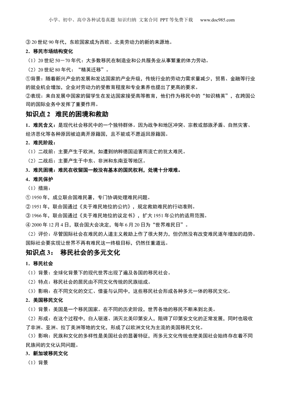 小学、初中、高中各种试卷真题知识归纳文案合同PPT等免费下载www.doc985.com专题十六:世界现代史:选择性必修(贯通部分)第47讲:现代世界的人口迁徙、战争和文化的传承与保护目录考情分析复习目标网络构建梳理预测考点一现代世界的人口迁徙(选必三)【夯基·知识梳理】知识点1经济全球化和劳动力的全球流动知识点2难民的困境和救助知识点3移民社会的多元文化【提升·考向预测】考向1现代社会移民和多元文化考点二现代战争与不同文化的碰撞交流(选必三)【夯基·知识梳理】知识点1第一次世界大战与民族民主意识的觉醒知识点2第二次世界大战与世界殖民体系的瓦解知识点3第二次世界大战后新兴民族国家的文化发展【提升·考向预测】考向1现代战争与不同文化的碰撞交流考点三全人类共同的财富(选必三)【夯基·知识梳理】知识点1文化遗产的保护与利用知识点2《世界遗产公约》的制定知识点3各国的历史遗迹与文化遗产【提升·考向预测】考向1文化传承的多种载体和发展真题感悟考点要求考题统计考情分析现代社会移民和多元文化2023江苏卷选择题,3分复习时关注现代社会移民的原因以及移民过程中的多元文化出现带来的影响。现代战争与不同文化的碰撞交流2023全国甲卷选择题,4分近三年考查少,但是战争带来的影响除了灾难还有文化的传播,这些都是复习需要关注的部分。小学、初中、高中各种试卷真题知识归纳文案合同PPT等免费下载www.doc985.com文化传承的多种载体和发展2023浙江卷选择题,2分2022辽宁卷选择题,3分2022福建卷非选择题,20分这部分是新加入内容,和现代文化发展贴近,复习时联系人类文化遗产作为重点关注目标。1、了解20世纪以来劳动力流动带来人口流动的表现,劳动力市场人口流动的结构特点,劳动力带来人口迁移的特点,理解移民社会多元文化的交流与融合,多元文化的创新,多元文化的冲突与矛盾。2、了解历史上重大战争对人类文化的破坏,以及战争带来的不同文化的交锋,认识战争在客观上为不同文化的碰撞、交流与重构提供了契机。3、通过对《世界遗产公约》主旨的学习,了解文化遗产与非物质文化遗产的定义。考点一现代世界的人口迁徙(选必三)知识点1经济全球化和劳动力的全球流动1.劳动力的全球流动(1)背景:全球化加速发展过程中,国际分工日益深化,生产的国际化加强,全球劳动力市场逐渐形成。(2)阶段①二战后:西欧、北美和大洋洲等发达地区从南欧、北非、东南亚、拉丁美洲等地吸收了大量劳动力,推动了发达地区资本主义经济的发展。②20世纪七八十年代:中东地区石油工业快速发展,大量非洲劳动力涌向中东产油国。日本以及亚洲新兴工业国家和地区也吸引了许多亚非移民。小学、初中、高中各种试卷真题知识归纳文案合同PPT等免费下载www.doc985.com③20世纪90年代,东欧国家成为西欧、北美劳动力的新的来源地。2.移民市场结构变化(1)20世纪50-70年代:大多数移民在制造业和公共服务业从事繁重的体力劳动。(2)20世纪80年代:“精英迁移”。①背景:随着新兴产业的发展和发达国家的产业升级,传统行业的劳动力需求量减少,贸易、金融等行业的就业机会增加,企业对劳动力的受教育程度和专业素养也提出了更高的要求。②表现:来自发展中国家的留学生在发达国家接受高等教育,他们作为移民中的“知识精英”,在跨国公司的国际业务中发挥了重要作用。知识点2难民的困境和救助1.难民含义:是现代社会移民中的一个独特群体。因为战争和地区冲突、宗教或部族矛盾、自然灾害、经济恶化等各种原因被迫离开原籍国,且不能或不愿返回原籍国。2.难民阶段:(1)二战前:主要产生于欧洲,如遭到纳粹德国迫害而流亡的犹太难民。(2)二战后:主要产生于中东、非洲和东南亚等地区。3.难民困境:难民在收留国一般没有基本的国民权利,处境十分艰难。4.难民保护(1)措施:①1950年,成立联合国难民署,专门协调处理难民问题。②1951年,联合国通过《关于难民地位的公约》,规定救助难民的行动准则。③1966年,联合国通过《关于难民地位的议定书》,扩大1951年公约的适用范围。④2000年12月4日,联合国大会决定,每年6月20日为“世界难民日”。(2)评价:尽管国...