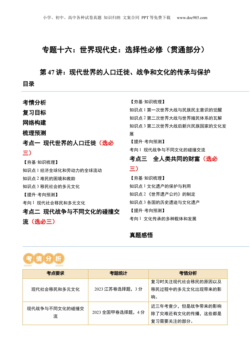 小学、初中、高中各种试卷真题知识归纳文案合同PPT等免费下载www.doc985.com专题十六:世界现代史:选择性必修(贯通部分)第47讲:现代世界的人口迁徙、战争和文化的传承与保护目录考情分析复习目标网络构建梳理预测考点一现代世界的人口迁徙(选必三)【夯基·知识梳理】知识点1经济全球化和劳动力的全球流动知识点2难民的困境和救助知识点3移民社会的多元文化【提升·考向预测】考向1现代社会移民和多元文化考点二现代战争与不同文化的碰撞交流(选必三)【夯基·知识梳理】知识点1第一次世界大战与民族民主意识的觉醒知识点2第二次世界大战与世界殖民体系的瓦解知识点3第二次世界大战后新兴民族国家的文化发展【提升·考向预测】考向1现代战争与不同文化的碰撞交流考点三全人类共同的财富(选必三)【夯基·知识梳理】知识点1文化遗产的保护与利用知识点2《世界遗产公约》的制定知识点3各国的历史遗迹与文化遗产【提升·考向预测】考向1文化传承的多种载体和发展真题感悟考点要求考题统计考情分析现代社会移民和多元文化2023江苏卷选择题,3分复习时关注现代社会移民的原因以及移民过程中的多元文化出现带来的影响。现代战争与不同文化的碰撞交流2023全国甲卷选择题,4分近三年考查少,但是战争带来的影响除了灾难还有文化的传播,这些都是复习需要关注的部分。小学、初中、高中各种试卷真题知识归纳文案合同PPT等免费下载www.doc985.com文化传承的多种载体和发展2023浙江卷选择题,2分2022辽宁卷选择题,3分2022福建卷非选择题,20分这部分是新加入内容,和现代文化发展贴近,复习时联系人类文化遗产作为重点关注目标。1、了解20世纪以来劳动力流动带来人口流动的表现,劳动力市场人口流动的结构特点,劳动力带来人口迁移的特点,理解移民社会多元文化的交流与融合,多元文化的创新,多元文化的冲突与矛盾。2、了解历史上重大战争对人类文化的破坏,以及战争带来的不同文化的交锋,认识战争在客观上为不同文化的碰撞、交流与重构提供了契机。3、通过对《世界遗产公约》主旨的学习,了解文化遗产与非物质文化遗产的定义。考点一现代世界的人口迁徙(选必三)知识点1经济全球化和劳动力的全球流动1.劳动力的全球流动(1)背景:全球化加速发展过程中,国际分工日益深化,生产的国际化加强,全球劳动力市场逐渐形成。(2)阶段①二战后:西欧、北美和大洋洲等发达地区从南欧、北非、东南亚、拉丁美洲等地吸收了大量劳动力,推动了发达地区资本主义经济的发展。②20世纪七八十年代:中东地区石油工业快速发展,大量非洲劳动力涌向中东产油国。日本以及亚洲新兴工业国家和地区也吸引了许多亚非移民。小学、初中、高中各种试卷真题知识归纳文案合同PPT等免费下载www.doc985.com③20世纪90年代,东欧国家成为西欧、北美劳动力的新的来源地。2.移民市场结构变化(1)20世纪50-70年代:大多数移民在制造业和公共服务业从事繁重的体力劳动。(2)20世纪80年代:“精英迁移”。①背景:随着新兴产业的发展和发达国家的产业升级,传统行业的劳动力需求量减少,贸易、金融等行业的就业机会增加,企业对劳动力的受教育程度和专业素养也提出了更高的要求。②表现:来自发展中国家的留学生在发达国家接受高等教育,他们作为移民中的“知识精英”,在跨国公司的国际业务中发挥了重要作用。知识点2难民的困境和救助1.难民含义:是现代社会移民中的一个独特群体。因为战争和地区冲突、宗教或部族矛盾、自然灾害、经济恶化等各种原因被迫离开原籍国,且不能或不愿返回原籍国。2.难民阶段:(1)二战前:主要产生于欧洲,如遭到纳粹德国迫害而流亡的犹太难民。(2)二战后:主要产生于中东、非洲和东南亚等地区。3.难民困境:难民在收留国一般没有基本的国民权利,处境十分艰难。4.难民保护(1)措施:①1950年,成立联合国难民署,专门协调处理难民问题。②1951年,联合国通过《关于难民地位的公约》,规定救助难民的行动准则。③1966年,联合国通过《关于难民地位的议定书》,扩大1951年公约的适用范围。④2000年12月4日,联合国大会决定,每年6月20日为“世界难民日”。(2)评价:尽管国...