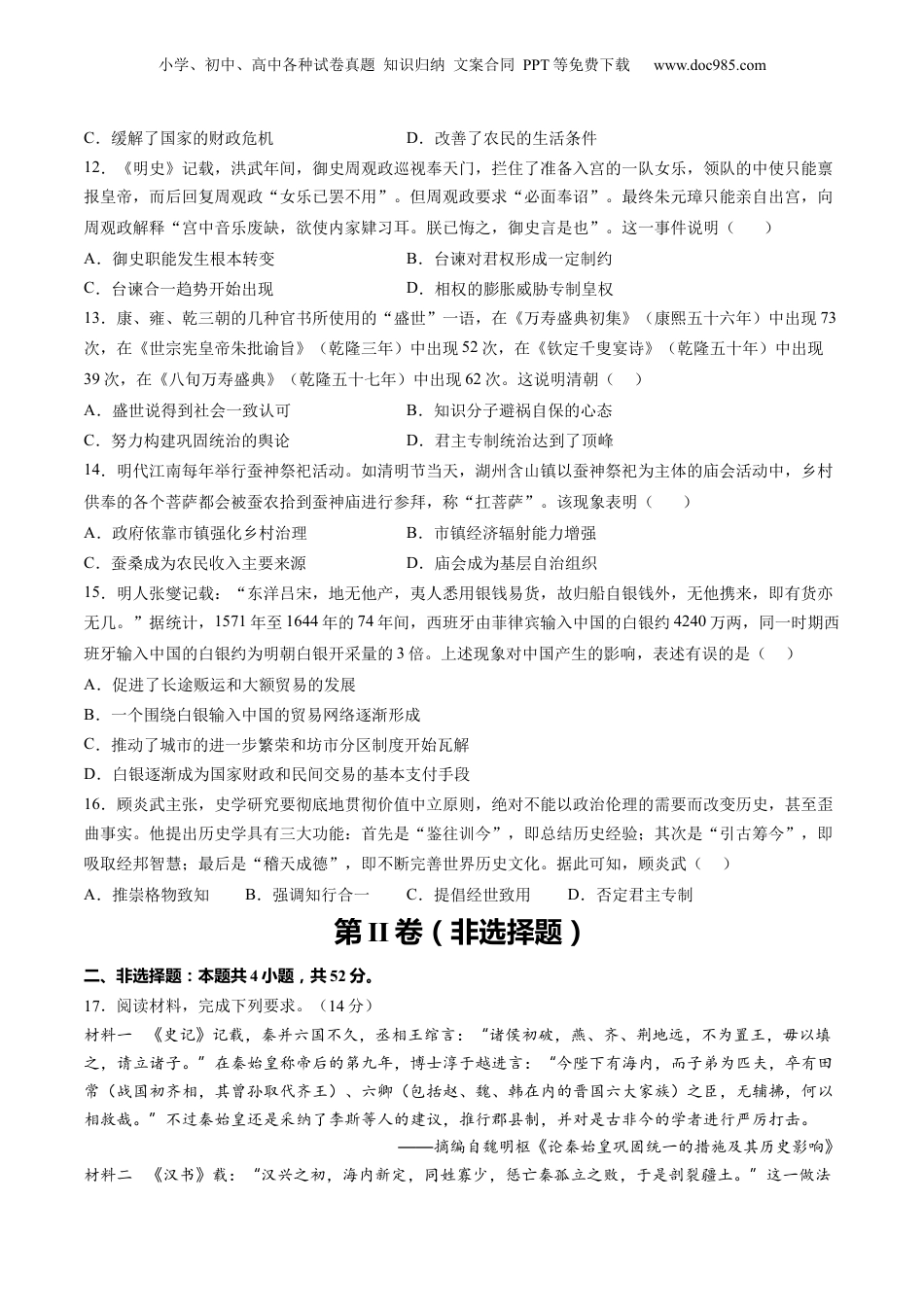 小学、初中、高中各种试卷真题知识归纳文案合同PPT等免费下载www.doc985.com模块检测卷中国古代史考试范围:第1—3讲;考试时间:100分钟;注意事项:1.答卷前,考生务必将自己的姓名、准考证号等填写在答题卡和试卷指定位置上。2.回答选择题时,选出每小题答案后,用铅笔把答题卡上对应题目的答案标号涂黑。如需改动,用橡皮擦干净后,再选涂其他答案标号。回答非选择题时,将答案写在答题卡上。写在本试卷上无效。3.考试结束后,将本试卷和答题卡一并交回第I卷(选择题)一、选择题:本题共16小题,每小题3分,共48分。1.距今约4500年的陶寺古城,拥有宫城、宫殿建筑、高等级墓地、“天文台”、祭天遗迹等;距今约4300年的陕北神木石峁石城,也存在精美石雕、内外瓮城、巨大墩台等文化遗存。这说明新石器时代晚期()A.社会具有较强的组织能力B.中华文明呈现统一性特征C.区域经济文化交流较频繁D.进入早期国家的形成时期2.在孔子看来,统治者应以身作则、率先垂范,教化万民,使之“有耻且格”。孟子认为人如果仅仅“饱食、暖衣、逸居而无教”,就跟禽兽没有什么区别,国家必须要“教以人伦”。这反映出,当时他们()A.注重维护封建统治秩序B.强调思想教化的重要性C.迎合贵族阶层政治诉求D.主张恢复西周礼乐制度3.下表是史书中关于秦国君主的部分记载。据此可推知()秦国君主记载秦穆公“益国十二,开地千里,遂霸西戎”秦孝公提出要“成帝王之业”秦惠文王张仪劝惠文王“以成伯王之名”秦武王“欲车通三川,以窥周室”A.秦国逐渐完成了国家统一B.秦国历代君主尚贤尊王C.秦统一天下具有历史基础D.秦国战略中心向西转移4.汉初儒家代表人物陆贾的《新语》云:“昔舜治天下也,弹五弦之琴,歌南风之诗,寂若无治国之意,小学、初中、高中各种试卷真题知识归纳文案合同PPT等免费下载www.doc985.com漠若无忧天下之心,然而天下大治……故无为者乃有为也。”对陆贾的上述思想,理解有误的一项是()A.吸取了秦朝灭亡的历史教训B.符合了西汉初年的生产实际C.不利于加强中央的集权统治D.契合了外儒内法的治国理念5.北魏在均田制的实施过程中,荫附户问题突出。孝文帝采纳大臣李冲实行三长制的建议,“应效法古制,五家设一邻长,五邻设一里长,五里设一党长……三年无过失者则升一等”。多数农民拥护新制度,“于是海内安之”。据此推断,三长制的推行()A.是古代地方行政机构的演变B.有利于加强国家的基层治理C.加速了北方的民族交融趋势D.促进了租庸调制的广泛推广6.乾陵是唐高宗与武则天的合葬墓,陵园神墙朱雀门外两侧有六十一尊真人大小的蕃臣像,这些人是疏勒国王裴夷健密施、于阗王尉迟墩、波斯王卑路斯、石国王子石忽那、吐火罗王子特勒羯达健等,还可能有新罗文武王金法敏。蕃臣像反映了唐朝()A.开放与包容的气象B.边疆与内地一体化C.胡化与汉化的并存D.中华文化圈的形成7.据史料记载:“自国家置两税以来,天下之财限为三品:一曰上供(中央),二曰留使(节度、观察使),三曰留州。皆量出以为入,定额以给资。”这种财政分配制度()A.有利于地方经济发展B.解决了藩镇割据问题C.加强了中央政府权力D.使中央政府职能转变8.魏晋南北朝时期政权更迭、社会动荡,但是这一时期书籍、绘画作品的传抄、创作和流通,个人书信往来并没有停滞,反而呈现出一派繁荣的景象。这一现象的出现得益于()A.民族交融交流的加强B.印刷术的发明与使用C.宽松包容的社会环境D.造纸术的改进与推广9.两宋时期,选拔县令有两种途径:一为科举,二为从基层选拔。一般进士高科可以直接授京官,担任知县;除此之外,其他人须从主簿、县尉等做起,积累够规定的资格,才能注授县令职务。这反映出,两宋()A.重视对县级政权的建设B.政治风气日趋因循保守C.地方行政层级管理变化D.进士高科享有政治特权10.元朝实行行省制度,除中央设中书省,地方设行省外,还有若干军事征伐型行省的设置,如征交趾行省、征缅行省等,但随着战争的结束,这些行省就被废除了。这说明元朝行省()A.兼有政治和军事的双重功能B.有利于元朝加强中央集权C.废立与否取决...