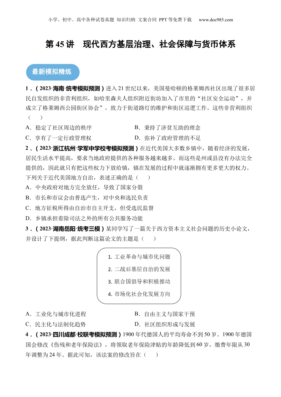 小学、初中、高中各种试卷真题知识归纳文案合同PPT等免费下载www.doc985.com第45讲现代西方基层治理、社会保障与货币体系1.(2023·海南·统考模拟预测)进入21世纪以来,美国曼哈顿的格莱姆西社区出现了很多居民自发组织的非营利组织,如哈里森夫人组织附近街坊加入了市里的“社区安全运动”,并成立了格莱姆西公园街区协会”,致力于街道路灯的维护和街区巡逻工作。这些非营利组织()A.稳定了社区周边的秩序B.秉持了济贫互助的理念C.享有了一定行政管理权D.弥补了政府管理的不足2.(2023·浙江杭州·学军中学校考模拟预测)在近代美国大多数乡镇中,随着经济的发展,居民生活水平提高,要求当地政府提供的各种服务越来越多。而这些是州或县没有办法完全提供的,因此就只有把这些权力下放给镇,镇在发展的过程中就逐渐拥有更多更大的权力。下列关于近代美国地方自治,表述正确的是()A.中央政府对地方完全放任,导致了国家分裂B.市长和市议会由普选产生,对中央和选民负责C.地方征税所得由自治市自主开支,但受选民监督D.乡镇承担着除司法之外的所有公共服务功能3.(2023·湖南岳阳·统考三模)某同学写了一篇关于西方资本主义社会问题的历史小论文,并设计了下提纲,据此判断这篇论文的主题是()A.工业化与城市化进程B.自由主义与国家干预C.民主化与法制化趋势D.社区组织形成与发展4.(2023·四川成都·校联考模拟预测)1900年代德国人的平均寿命不到50岁。1900年德国国会修改《伤残和老年保险法》,将领取老年保险津贴的年龄降低到60岁,缴费年限从30年调整为24年。据此可知,该法案的修改旨在()最新模拟精炼小学、初中、高中各种试卷真题知识归纳文案合同PPT等免费下载www.doc985.comA.提供基本生存保障B.实行自由放任政策C.防范国内工人运动D.缩小社会贫富差距5.(2023·福建·模拟预测)1933年德国出台“莱因哈特纲领”,把5亿马克用于维修住宅和农业用房,对私人经济进行资助和减税优惠,增加对铁路邮局的投资,鼓励妇女去过专门同儿童、厨房、教堂打交道的生活。德国此举意在()A.缓解社会危机B.提升妇女地位C.彰显制度优势D.增加社会福利6.(2023·海南·统考模拟预测)1984年,日本修订了二战前制定并实施的《健康保险法》,设立了退休职工医疗制度,并将健康保险被保险人的待遇降低。1992年,日本对《老人保健法》进行了重大修改,设立了老年人访问看护制度,1997年通过了“介护保险制度”,向老年人提供集生活、保健、护理、医疗一体化的保障和服务。日本的举措()A.适应了内向型战略的需要B.实现了地方社区管理行政化C.推动了社会保障制度完善D.促进了福利国家制度的出现7.(2023·浙江·模拟预测)1934年1月,美国国会通过《黄金储备法案》,美国将美元兑换黄金的价格固定在35美元一盎司。该法案将美联储持有的全部黄金所有权转移给了政府。这一举措()A.为美元和黄金挂钩提供了重要的基础B.帮助银行恢复了信用C.使美国迅速摆脱了经济大危机的冲击D.使美元成为世界货币8.(2023·湖南娄底·统考模拟预测)1961年10月,美国联合英国、瑞士等国建立了黄金总库,在伦敦黄金市场上买卖黄金,以便将金价维持在35.20美元1盎司的水平上,但售出黄金越来越多。1968年3月15日,伦敦黄金市场被迫关闭,不再按官价干预黄金自由市场。由此可知,当时()A.固定汇率制被浮动汇率制取代B.资本主义世界货币体系面临挑战C.西方各国调控经济的手段失灵D.政府过度干预经济导致通货膨胀9.(2023·安徽滁州·校考二模)早在1944年的布雷顿森林会议上,就曾提出了建立世界贸易组织的设想:在成立世界银行和国际货币基金组织的同时,成立一个国际性贸易组织,从而使它们成为二战后左右世界经济的“货币一金融一贸易”三位一体的机构。由此可知,该设想A.表明美国在该经济体系中居主导地位B.反映了世贸组织是该经济体系的核心C.说明资本主义世界经济体系已经形成D.有利于资本主义世界经济体系制度化10.(2023·山西·模拟预测)材料一战使英国付出了巨大的代价,参军的800万人中,有2090212人受伤。如何救助这小学、初中、高中各种...