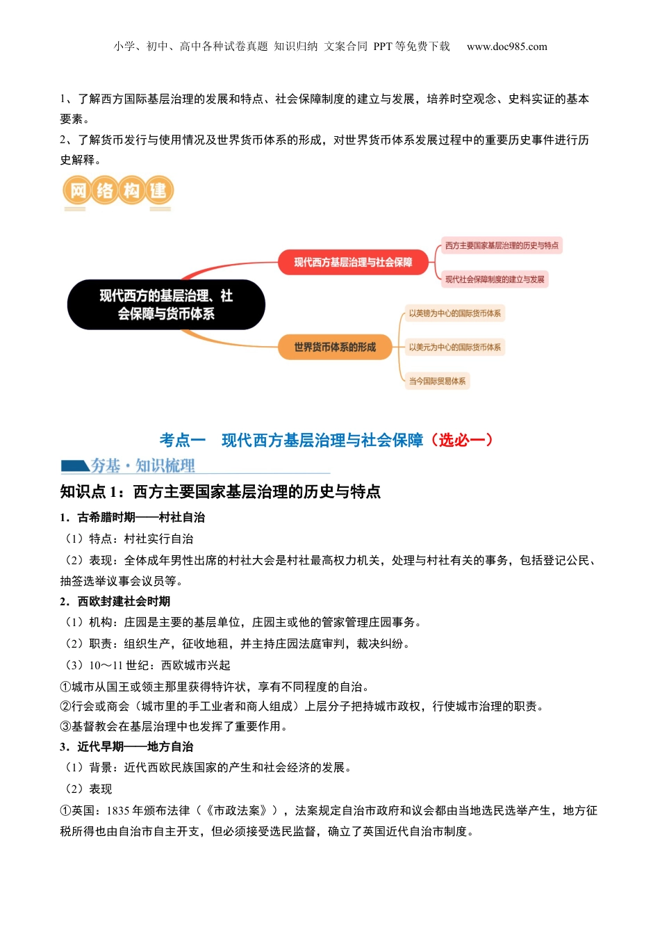 小学、初中、高中各种试卷真题知识归纳文案合同PPT等免费下载www.doc985.com专题十六:世界现代史:选择性必修(贯通部分)第45讲:现代西方的基层治理、社会保障与货币体系目录考情分析复习目标网络构建梳理预测考点一现代西方基层治理与社会保障(选必一)【夯基·知识梳理】知识点1西方主要国家基层治理的历史与特点知识点2现代社会保障制度的建立与发展【提升·考向预测】考向1西方基层治理与社会保障考点二世界货币体系的形成(选必一)【夯基·知识梳理】知识点1以英镑为中心的国际货币体系知识点2以美元为中心的国际货币体系知识点3当今国际贸易体系【提升·考向预测】考向1以美元为中心的国际货币体系真题感悟考点要求考题统计考情分析西方基层治理与社会保障2022河北卷选择题,3分2021河北卷选择题,3分近三年考查少,内容是新增加出来的,复习时和当时的时代背景相结合,尤其罗斯福新政后的社会保障体系的建立是重点。以美元为中心的国际货币体系2023广东卷选择题,3分2023湖北卷非选择题,20分2022广东卷选择题,3分2021广东卷选择题,3分近三年考查少,布雷顿森林体系是国际货币体系中的重要内容,复习时结合国际金融背景关注。小学、初中、高中各种试卷真题知识归纳文案合同PPT等免费下载www.doc985.com1、了解西方国际基层治理的发展和特点、社会保障制度的建立与发展,培养时空观念、史料实证的基本要素。2、了解货币发行与使用情况及世界货币体系的形成,对世界货币体系发展过程中的重要历史事件进行历史解释。考点一现代西方基层治理与社会保障(选必一)知识点1:西方主要国家基层治理的历史与特点1.古希腊时期——村社自治(1)特点:村社实行自治(2)表现:全体成年男性出席的村社大会是村社最高权力机关,处理与村社有关的事务,包括登记公民、抽签选举议事会议员等。2.西欧封建社会时期(1)机构:庄园是主要的基层单位,庄园主或他的管家管理庄园事务。(2)职责:组织生产,征收地租,并主持庄园法庭审判,裁决纠纷。(3)10~11世纪:西欧城市兴起①城市从国王或领主那里获得特许状,享有不同程度的自治。②行会或商会(城市里的手工业者和商人组成)上层分子把持城市政权,行使城市治理的职责。③基督教会在基层治理中也发挥了重要作用。3.近代早期——地方自治(1)背景:近代西欧民族国家的产生和社会经济的发展。(2)表现①英国:1835年颁布法律(《市政法案》),法案规定自治市政府和议会都由当地选民选举产生,地方征税所得也由自治市自主开支,但必须接受选民监督,确立了英国近代自治市制度。小学、初中、高中各种试卷真题知识归纳文案合同PPT等免费下载www.doc985.com②美国:建国后基本保持了地方自治的传统,乡镇是最基本的地方自治单位,承担着除司法之外的所有公共服务功能。③法国:大革命后形成了以自治市镇为基层单位的制度,每个市镇的市长和市议会都由普选产生,市长同时对中央政府和本地选民负责。(3)改革①背景:随着工业革命的发展,城市人口激增,失业、贫困等社会问题使传统的社会救济方式遭遇瓶颈,各国不得不探索社会救济的新方法。②措施:把城市分成若干小区,每个小区组织志愿者,负责救济的分配,并协调慈善团体和救济机构的工作,社区组织开始形成。4.第二次世界大战后——社区的发展(1)原因:西方各国政府认识到,要提高生活品质,改善人民生活,不能单靠政府,必须组织和鼓励当地居民参与,建立自下而上的机制解决社会问题。(2)表现:①社区很快发展为基层自治的主要方式。②社区在政府不同程度的管理和组织下,实行居民自我管理。③社区不仅提供生活服务、教育、休闲娱乐、福利、卫生保健等,还参与相关的城市规划、土地政策等地方政府的决策。(3)意义:缓和了社会矛盾,维护了社会秩序和政治稳定。5.20世纪80年代以后新发展(1)表现①西方国家的基层治理,更加强调政府、社区和非政府组织的共同作用。②社区承担了更多的政府功能。③公众、志愿者和私人部门提供了越来越多的公共服务。(2)影响:使基层治理的效率更高、成本更低。知识点2:现代社会保障制度的建立与发展1.西方国家的社会保障制度(...