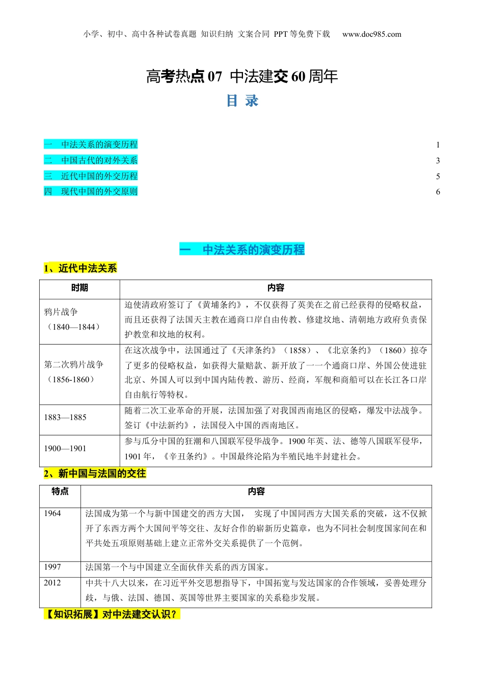 小学、初中、高中各种试卷真题知识归纳文案合同PPT等免费下载www.doc985.com考点高热07交中法建60周年目录一中法关系的演变历程1二中国古代的对外关系3三近代中国的外交历程5四现代中国的外交原则6一中法关系的演变历程1、近代中法关系时期内容鸦片战争(1840—1844)迫使清政府签订了《黄埔条约》,不仅获得了英美在之前已经获得的侵略权益,而且还获得了法国天主教在通商口岸自由传教、修建坟地、清朝地方政府负责保护教堂和坟地的权利。第二次鸦片战争(1856-1860)在这次战争中,法国通过了《天津条约》(1858)、《北京条约》(1860)掠夺了更多的侵略权益,如获得大量赔款、新开放了一一个通商口岸、外国公使进驻北京、外国人可以到中国内陆传教、游历、经商,军舰和商船可以在长江各口岸自由航行等特权。1883—1885随着二次工业革命的开展,法国加强了对我国西南地区的侵略,爆发中法战争。签订《中法新约》,法国侵入中国的西南地区。1900—1901参与瓜分中国的狂潮和八国联军侵华战争。1900年英、法、德等八国联军侵华,1901年,《辛丑条约》。中国最终沦陷为半殖民地半封建社会。2、新中国与法国的交往特点内容1964法国成为第一个与新中国建交的西方大国,实现了中国同西方大国关系的突破,这不仅掀开了东西方两个大国间平等交往、友好合作的崭新历史篇章,也为不同社会制度国家间在和平共处五项原则基础上建立正常外交关系提供了一个范例。1997法国第一个与中国建立全面伙伴关系的西方国家。2012中共十八大以来,在习近平外交思想指导下,中国拓宽与发达国家的合作领域,妥善处理分歧,与俄、法国、德国、英国等世界主要国家的关系稳步发展。【知识拓展】对中法建交认识?小学、初中、高中各种试卷真题知识归纳文案合同PPT等免费下载www.doc985.com原因①美国企图控制欧洲,欧洲开始走向一体化;②法国实力增强,开始谋求独立自主的外交;③中苏关系破裂;④中国外交思想的完善;⑤新中国国力增强,国际地位提高。意义①中法建交打破了美国长期以来孤立中国的政策;②有利于中国外交局面的改善;③冲击了两极格局,推动了世界格局多极化趋势的出现;④有助于提升新中国的国际地位;有助于法国实现独立自主的外交目标⑤有利于不同社会制度国家的合作和世界和平。启示①不同政治制度和意识形态国家可以友好相处;②中法关系经历的波折,也体现出改革开放的艰难与曲折;③新时期的中法关系将更好造福于世界人民,共同构筑更美好、更和谐的世界。【知识拓展】对国家间关系的规律性认识?1.国家间关系的根本出发点是维护本国利益,一切外交活动都围绕国家利益展开。共同利益是国家间合作的基础,利益相悖是国家间摩擦的根源。2.国家间关系的发展变化还受到国家综合实力和国际形势等的影响。3.国家间关系表现形式多种多样,既有敌对和战争,也有各种形式的友好往来。4.国家间关系的演变还受制于各国的历史传统、意识形态、地缘政治以及国内政治势力的斗争等。1.(2024·吉林·校联考模拟预测)1843年签订的《虎门条约》规定,如果中国政府对其他各国有权利让与,“亦应准英人一体均沾,用示平允”。中美《望厦条约》、中法《黄埔条约》也有同样规定。这是一条损害中国主权特别严重的条款。此条款应为()A.协定关税B.片面最惠国待遇C.领事裁判权D.投资设厂2.(2023·江苏·校考模拟预测)中英《南京条约》、中美《望厦条约》和中法《黄埔条约》于“平行之礼”一条无不详为备列,西方人孜孜注目于此。但他们要求的“平行之礼”对传统中国来说,同天朝大国对待外夷历来的不平等是直接对立的。它的实现,会使王朝体制裂开一个大洞并促成夷夏之防的逐渐崩溃。这表明清政府()A.拒绝列强的平等诉求B.外交转型中的观念冲突C.抵抗外来侵略的决心D.朝贡外交体系遭到破坏3.(2023·北京房山·统考一模)从新中国成立到改革开放前的外交成就具有开创性、奠基性的意义。下列属于这一阶段的是()A独立自主和平外交政策抗美援朝战争同美国正式建立外交关系B和平共处五项原则中法正式建交恢复中国在联合国的合法权利C“求同存异”原则中日两国建交与苏联关系正常化小学、初...