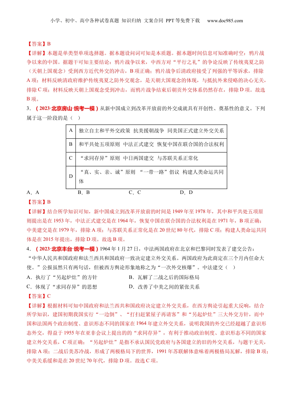 小学、初中、高中各种试卷真题知识归纳文案合同PPT等免费下载www.doc985.com考点高热07交中法建60周年目录一中法关系的演变历程1二中国古代的对外关系4三近代中国的外交历程7四现代中国的外交原则9一中法关系的演变历程1、近代中法关系时期内容鸦片战争(1840—1844)迫使清政府签订了《黄埔条约》,不仅获得了英美在之前已经获得的侵略权益,而且还获得了法国天主教在通商口岸自由传教、修建坟地、清朝地方政府负责保护教堂和坟地的权利。第二次鸦片战争(1856-1860)在这次战争中,法国通过了《天津条约》(1858)、《北京条约》(1860)掠夺了更多的侵略权益,如获得大量赔款、新开放了一一个通商口岸、外国公使进驻北京、外国人可以到中国内陆传教、游历、经商,军舰和商船可以在长江各口岸自由航行等特权。1883—1885随着二次工业革命的开展,法国加强了对我国西南地区的侵略,爆发中法战争。签订《中法新约》,法国侵入中国的西南地区。1900—1901参与瓜分中国的狂潮和八国联军侵华战争。1900年英、法、德等八国联军侵华,1901年,《辛丑条约》。中国最终沦陷为半殖民地半封建社会。2、新中国与法国的交往特点内容1964法国成为第一个与新中国建交的西方大国,实现了中国同西方大国关系的突破,这不仅掀开了东西方两个大国间平等交往、友好合作的崭新历史篇章,也为不同社会制度国家间在和平共处五项原则基础上建立正常外交关系提供了一个范例。1997法国第一个与中国建立全面伙伴关系的西方国家。2012中共十八大以来,在习近平外交思想指导下,中国拓宽与发达国家的合作领域,妥善处理分歧,与俄、法国、德国、英国等世界主要国家的关系稳步发展。【知识拓展】对中法建交认识?小学、初中、高中各种试卷真题知识归纳文案合同PPT等免费下载www.doc985.com原因①美国企图控制欧洲,欧洲开始走向一体化;②法国实力增强,开始谋求独立自主的外交;③中苏关系破裂;④中国外交思想的完善;⑤新中国国力增强,国际地位提高。意义①中法建交打破了美国长期以来孤立中国的政策;②有利于中国外交局面的改善;③冲击了两极格局,推动了世界格局多极化趋势的出现;④有助于提升新中国的国际地位;有助于法国实现独立自主的外交目标⑤有利于不同社会制度国家的合作和世界和平。启示①不同政治制度和意识形态国家可以友好相处;②中法关系经历的波折,也体现出改革开放的艰难与曲折;③新时期的中法关系将更好造福于世界人民,共同构筑更美好、更和谐的世界。【知识拓展】对国家间关系的规律性认识?1.国家间关系的根本出发点是维护本国利益,一切外交活动都围绕国家利益展开。共同利益是国家间合作的基础,利益相悖是国家间摩擦的根源。2.国家间关系的发展变化还受到国家综合实力和国际形势等的影响。3.国家间关系表现形式多种多样,既有敌对和战争,也有各种形式的友好往来。4.国家间关系的演变还受制于各国的历史传统、意识形态、地缘政治以及国内政治势力的斗争等。1.(2024·吉林·校联考模拟预测)1843年签订的《虎门条约》规定,如果中国政府对其他各国有权利让与,“亦应准英人一体均沾,用示平允”。中美《望厦条约》、中法《黄埔条约》也有同样规定。这是一条损害中国主权特别严重的条款。此条款应为()A.协定关税B.片面最惠国待遇C.领事裁判权D.投资设厂【答案】B【详解】本题是单类型单项选择题。据本题主题干的设问词,可知这是推断题。据本题时间信息可知准确时空是近代(中国)。根据“如果中国政府对其他各国有权利让与,‘亦应准英人一体均沾,用示平允’”并结合所学内容可知,中国政府给于第三国有关权利,英人也同样享有,所以这一权利应该是片面最惠国待遇,B项正确;协定关税是英国首先享有,并不是英国享有清政府给予他国的特权,排除A项;英国获得了领事裁判权是在《虎门条约》,但他是司法主权,排除C项;1895年《马关条约》签订后,列强获得了在通商口岸投资设厂的权利,排除D项。故选B项。2.(2023·江苏·校考模拟预测)中英《南京条约》、中美《望厦条约》和中法《黄埔条约》于“平行之礼”一条无不详为备列,西方人孜孜注目于此。但他们要求的...