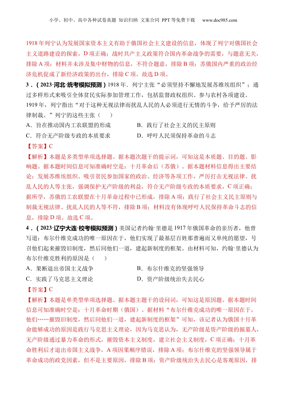 小学、初中、高中各种试卷真题知识归纳文案合同PPT等免费下载www.doc985.com第39讲十月革命的胜利与苏联的社会主义实践1.(2023·浙江宁波·宁海知恩中学校考模拟预测)列宁在1919年撰写的《苏维埃政权的成就和困难》中郑重地提出:“我们没有别的材料。我们要立刻用资本主义昨天留下来可供我们今天用的那些材料来建设社会主义……我们有资产阶级专家,此外再没有别的了。我们没有别的砖头,我们没有什么东西可用来建设。社会主义必定要胜利、我们社会主义者和共产主义者应当用行动证明,我们能够用这些砖头、用这些材料来建成社会主义。”材料反映了列宁强调()A.战时共产主义政策已经不符合经济发展的要求B.新生的苏维埃政权需要借鉴资本主义国家经验C.学会整合运用历史资源和技术来建设社会主义D.运用资本主义市场手段为新经济政策提供参照【答案】C【解析】本题是单类型单项选择题。据本题主题干的设问词,可知这是本质题。据本题时间信息可知准确时空是:1919年(苏俄)。根据材料中的“我们要立刻用资本主义昨天留下来可供我们今天用的那些材料来建设社会主义”可知列宁主张用资本主义创造的材料来建设社会主义,说明要学会整合运用历史资源和技术来建设社会主义,C项正确;1919年依然为战时共产主义政策,集中有限的力量集中起来保证战争的胜利,排除A项;材料强调的是借鉴本国资产阶级的做法建设苏维埃政权,不是其他资本主义国家的经验,排除B项;1919年还没有提出新经济政策,排除D项。故选C项。2.(2023·江苏南京·统考三模)1918年,列宁在分析了俄国经济的具体状况后,提出“国家资本主义较之我们苏维埃共和国目前的情况,将是一个进步。如果国家资本主义在半年左右能在我国建立起来,那将是一个很大的胜利,那将极其可靠地保证社会主义一年以后在我国最终地巩固起来而立于不败之地。”这一主张()A.符合国内革命战争的需要B.集中财物推动政权巩固C.促成新经济政策即时出台D.体现社会主义道路探索【答案】D【解析】本题是单类型单项选择题。据设问可知,这是本质类题目,时空是1918年的俄国。根据材料“国家资本主义较之我们苏维埃共和国目前的情况,将是一个进步。……保证社会主义一年以后在我国最终地巩固起来而立于不败之地”及所学可知,国家资本主义指的是资本主义制度下由国家政权直接控制这些或那些资本主义企业的一种资本主义。材料反映的是最新模拟精炼小学、初中、高中各种试卷真题知识归纳文案合同PPT等免费下载www.doc985.com1918年列宁认为发展国家资本主义有助于俄国社会主义建设的信息,体现了列宁对俄国社会主义道路建设的探索,D项正确;战时共产主义政策符合国内革命战争的需要,与题意无关,排除A项;材料并未涉及集中财物的信息,不符合题意,排除B项;苏俄国内严重的政治经济危机促成了新经济政策的出台,排除C项。故选D项。3.(2023·河北·统考模拟预测)1918年.列宁主张“必须坚持不懈地发展苏维埃组织”;通过多样形式来吸引全体贫民实际参加管理工作,包括监督政权组织、参与农村各项建设。1919年,列宁指出“对于这种无视法律而扰乱人民的人必须进行无情的斗争,给予严厉的法律制裁。”列宁的这些主张()A.旨在推动国内工农联盟的形成B.践行了社会主义的民主原则C.符合无产阶级专政的本质要求D.呼吁人民须保持革命的斗志【答案】C【解析】本题是多类型单项选择题。据本题次题干的提示词,可知这是本质题、目的题、影响题。据本题时间信息可知准确时空是:十月革命后(苏俄)。据本题材料信息得出主要结论:发展苏维埃组织、吸引贫民参加国家的政治、经济等各项工作,严厉打击无视法律、扰乱人民的人等主张,强调保护无产阶级的利益,符合无产阶级专政的本质要求,C项正确;据所学,苏俄的工农联盟在十月革命过程中已形成,排除A项;践行了社会主义民主原则与制裁无视法律、扰乱人民的人等不符,排除B项;材料没有体现呼吁人民保持革命斗志的信息,排除D项。故选C项。4.(2023·辽宁大连·校考模拟预测)美国记者约翰·里德是1917年俄国革命的亲历者,他曾写道:布尔什维克成功的唯一原因在于,他们实现了最基层百姓...