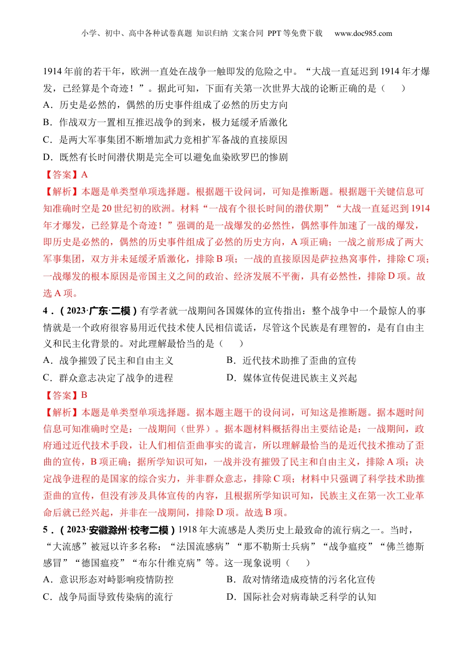 小学、初中、高中各种试卷真题知识归纳文案合同PPT等免费下载www.doc985.com第38讲第一次世界大战与战后国际秩序1.(2023·河北·校联考三模)1914年7月,德皇威廉二世问他的将军们:这场战争能不能仅限于东欧?回答:可以。英国《金融时报》指出:“不管我们可能对大不列颠政府有什么想法,我们至少可以相信它会置身于冲突地区之外。”这说明欧洲一些国家()A.重视战前的思想动员工作B.认为战争爆发不具有必然性C.具有短期取胜的侥幸心理D.对战争规模与进程预估不足【答案】D【解析】本题是单类型单项选择题。根据主题干的设问词,可知是本质题。时空是:一战前夕(欧洲)。由材料信息可知,一战前夕,很多人认为,如果欧洲爆发战争,会控制在一定的范围之内,不认为会爆发波及整个欧洲乃至整个世界的大战,可见对战争的规模与进程预估不足,D项正确;材料内容不是对军队和民众进行思想动员,而是对战争规模的预想和推测,排除A项;20世纪初,欧洲形成“同盟国”、“协约国”两大敌对的军事集团,很多人都认识到战争爆发的可能性很大,材料中的观点就是对战争爆发后如何进展的设想,排除B项;材料所述主要体现对战争规模而非战争时长和结局的看法,排除C项。故选D项。2.(2023·山西晋城·统考三模)从1870年到1913年,德国工业生产总值增长4.6倍,法国增长1.6倍,英国仅增长1.3倍;各国工业生产总额占世界工业生产总值的比重,英国从30%下降到14%,法国从10%下降到6%,德国从13%上升到16%;英国殖民地人口有3.9亿,法国为6235万,德国为1307万。这意味着()A.英法经济逐渐陷入“滞胀”状态B.欧洲局势可能出现重大危机C.德国成为世界上最发达的国家D.广阔殖民地制约了英国发展【答案】B【解析】本题是单类型单项选择题。据本题主题干的设问词,可知这是推断题。据本题时间信息可知准确时空是:1870年到1913年(德国、法国、英国)。根据材料信息并结合所学可知,第二次工业革命后,欧洲主要资本主义国家的经济发展出现严重不平衡,英、法相对“衰落”,德国快速“崛起”,但殖民地状况却出现“倒挂”现象,这意味着欧洲列强重新争夺霸权和殖民地的战争可能出现,B项正确;“滞胀”是20世纪70年代西方资本主义国家出现的经济现象,排除A项;当时英国仍然是世界上综合实力最为发达的国家,排除C项;广阔殖民地总体上有利于英国的发展,D项说法错误,排除D项。故选B项。3.(2023·广东东莞·校考三模)美国前国务卿基辛格曾说,一战有个很长时间的潜伏期。最新模拟精炼小学、初中、高中各种试卷真题知识归纳文案合同PPT等免费下载www.doc985.com1914年前的若干年,欧洲一直处在战争一触即发的危险之中。“大战一直延迟到1914年才爆发,已经算是个奇迹!”。据此可知,下面有关第一次世界大战的论断正确的是()A.历史是必然的,偶然的历史事件组成了必然的历史方向B.作战双方一置相互推迟战争的到来,极力延缓矛盾激化C.是两大军事集团不断增加武力竞相扩军备战的直接原因D.既然有长时间潜伏期是完全可以避免血染欧罗巴的惨剧【答案】A【解析】本题是单类型单项选择题。根据题干设问词,可知是推断题。根据题干关键信息可知准确时空是20世纪初的欧洲。材料“一战有个很长时间的潜伏期”“大战一直延迟到1914年才爆发,已经算是个奇迹!”强调的是一战爆发的必然性,偶然事件加速了一战的爆发,即历史是必然的,偶然的历史事件组成了必然的历史方向,A项正确;一战之前形成了两大军事集团,双方并未延缓矛盾激化,排除B项;一战的直接原因是萨拉热窝事件,排除C项;一战爆发的根本原因是帝国主义之间的政治、经济发展不平衡,具有必然性,排除D项。故选A项。4.(2023·广东·二模)有学者就一战期间各国媒体的宣传指出:整个战争中一个最惊人的事情就是一个政府很容易用近代技术使人民相信谎话,尽管这个民族是有理智的,是有自由主义和民主化背景的。对此理解最恰当的是()A.战争摧毁了民主和自由主义B.近代技术助推了歪曲的宣传C.群众意志决定了战争的进程D.媒体宣传促进民族主义兴起【答案】B【解析】本题是单类型单项选择题。据本题主题干的设问词,可...