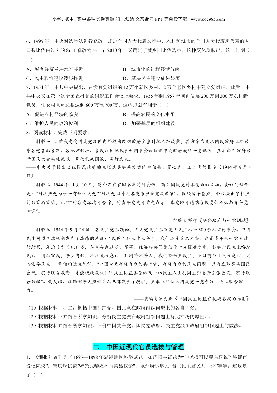 小学、初中、高中各种卷真知文案合同试题识归纳PPT等免下费载www.doc985.com高考点热03制度自信,家治理国考点练·考卷练目录一、中国近现代政治制度的演变二中国近现代官员选拔与管理三当代中国法治与精神文明建设四当代中国的外交政策16+4模式试卷一、中国近现代政治制度的演变1.1937年8月,中国共产党提出要建立“廉洁政府”。抗战期间,各根据地积极开展廉政建设,如太行山根据地开展整风运动,完善各项规章制度;淮北根据地通过传唱歌谣、编排戏剧的方式向群众进行宣传。这些做法()A.利于塑造党在局部地区的执政形象B.形成了完善的廉政制度体系C.摆脱了国民党对根据地的政治影响D.旨在巩固抗日民族统一战线2.从20世纪40年代起,中国农民由“被启蒙”变为启蒙者,他们再也不是愚蠢落后和麻木狭隘的代表,而是获得了独立身份,有价值尊严、理想抱负的主体。出现这种转变的主要原因是()A.民族危机下的意识觉醒B.国民政府进入宪政时期C.中国共产党工作重心转移D.根据地民主运动的发展3.1935年11月,国民党第五次全国代表大会通过的《拟定宪法草案修正要点请公决案》说“在总统职权章应规定总统总揽治权,使五种治权之行使,均得由总统率而调节之”。这一规定()A.体现了国民党行宪的实质B.满足了抗日战争的需要C.标志着民国进入宪政时期D.推动了政党政治的发展4.下表所示为1912年12月至到1913年3月中华民国第一届国会选举情况。据此可知,这次选举()选民占比4000万选民参与,仅占当时全国人口的9.98%议员阶层来源选出的议员主要由政治家、官僚、自由职业者、原清朝官僚构成国民党党员占比国民党占了议员总数的45%左右,成为第一大党A.照搬了西方议会民主B.实现了国民党的政治理想C.具有一些近代化色彩D.反映出民众对政治的淡漠5.1950年5月1日,明清太庙被改造为北京市劳动人民文化宫,许多在旧社会出身贫苦的人,在文化宫的培养下成为文艺界的骨干力量。这一改造()A.适应了社会主义文化建设的需要B.有利于国民经济的恢复和发展C.体现出人民真正成为国家的主人D.旨在破除人民群众的迷信思想小学、初中、高中各种卷真知文案合同试题识归纳PPT等免下费载www.doc985.com6.1995年,中央对选举法进行修改,规定全国人大代表选举中,农村和城市的全国人大代表所代表的人口数比例由过去的8:1修改为4:1;2010年,又确定了城乡同比例选举。这种变化反映出,这一时期()A.城乡经济发展水平接近B.城市化的进程逐渐放缓C.民主政治建设逐步推进D.基层民主建设成果显著7.1954年,中共中央提出,在没有党组织的12万个新区乡村、2万个老区乡村中建立党组织。此后,中共中央又在第一次全国农村党的组织工作会议上要求,1955年到1957年间再发展200万到300万农村新党员,使农村党员总数达到600万至700万。这些规划有利于()A.促进农村经济的恢复B.提高农民的文化水平C.维护人民的政治权利D.加强基层的组织建设8.阅读材料,完成下列要求。材料一目前我党向国民党及国内外提出改组政府主张时机已经成熟,其方案为要求国民政府立即召集各党各派各军、各地方政府、各民众团体代表开国事会议改组中央政府废除一党统治,然后由新政府召开国民大会实施宪政,贯彻抗战国策,实行反攻。——中央关于提出改组图民政府的主张及其实施方案给林伯渠、董必武、王若飞的指示(1944年9月4日)材料二1944年11月10日,蒋介石在官邸召集特种会议,商讨国民党对各党派的立场。会议的结论是:“对共产党为唯一有敌性之党”“对共党以外之各党派应采宽放政策”。围绕这个基点,会议提出了相应的政策与策略,此即“对各党派均可合作,对青年党更可首先表示,本党即可通饬各级党部不必与青年党冲突”。——摘编自邓野《联合政府与一党训政》材料三1944年9月24日,各民主党派领袖、国民党民主派及爱国民主人士500余人举行集会。中国民主同盟主席张澜发表了激昂的演说:“民国已经三十三年了,我们还是有名无实。这是多年来一党专政的结果,是治日少而乱日多,如今弄到政治、军事、经济各部门都陷于十分困难之中,非实行民主来唤起民众,团结官民,修明内政,不足挽救危亡,时...