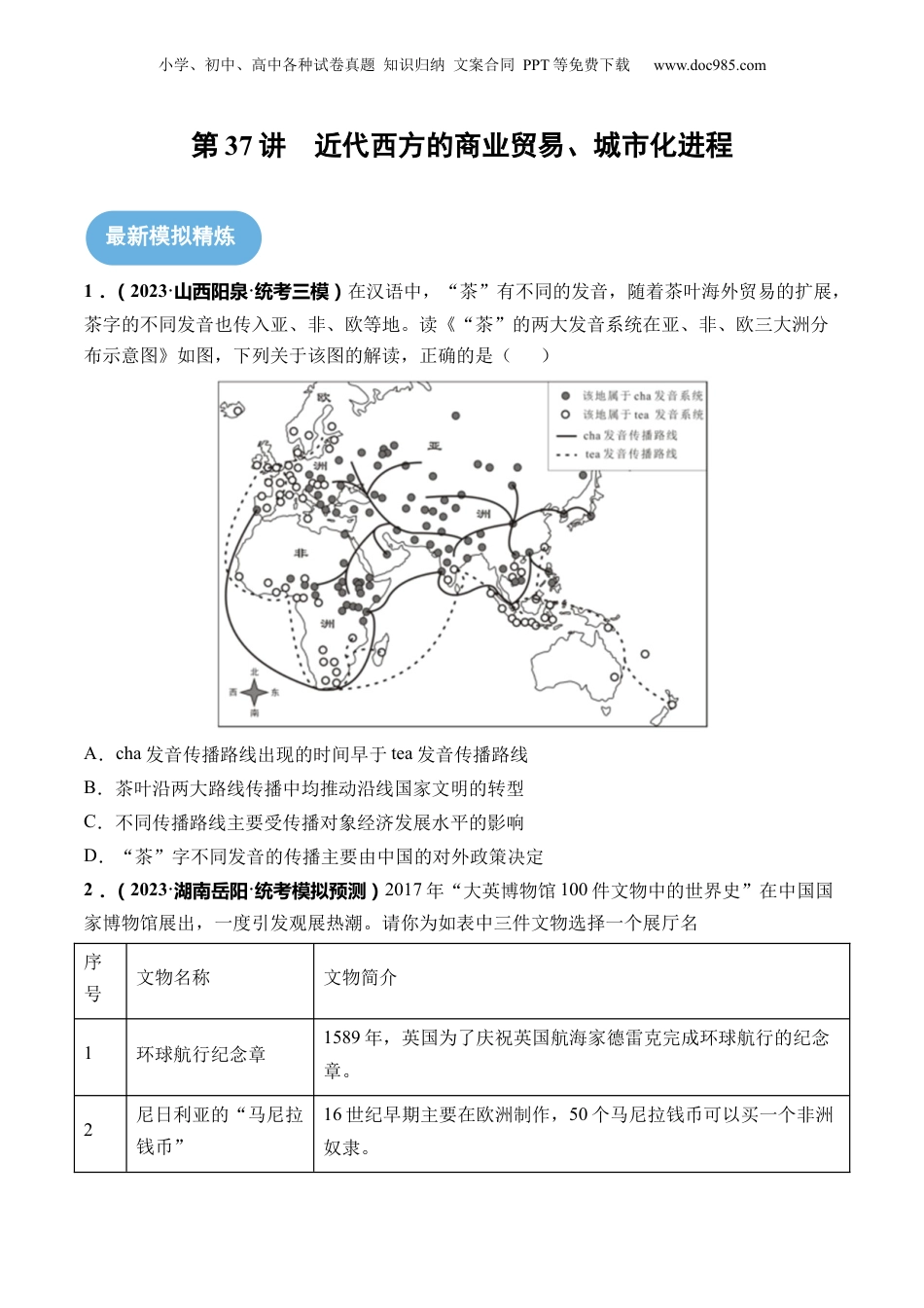 小学、初中、高中各种试卷真题知识归纳文案合同PPT等免费下载www.doc985.com第37讲近代西方的商业贸易、城市化进程1.(2023·山西阳泉·统考三模)在汉语中,“茶”有不同的发音,随着茶叶海外贸易的扩展,茶字的不同发音也传入亚、非、欧等地。读《“茶”的两大发音系统在亚、非、欧三大洲分布示意图》如图,下列关于该图的解读,正确的是()A.cha发音传播路线出现的时间早于tea发音传播路线B.茶叶沿两大路线传播中均推动沿线国家文明的转型C.不同传播路线主要受传播对象经济发展水平的影响D.“茶”字不同发音的传播主要由中国的对外政策决定2.(2023·湖南岳阳·统考模拟预测)2017年“大英博物馆100件文物中的世界史”在中国国家博物馆展出,一度引发观展热潮。请你为如表中三件文物选择一个展厅名序号文物名称文物简介1环球航行纪念章1589年,英国为了庆祝英国航海家德雷克完成环球航行的纪念章。2尼日利亚的“马尼拉钱币”16世纪早期主要在欧洲制作,50个马尼拉钱币可以买一个非洲奴隶。最新模拟精炼小学、初中、高中各种试卷真题知识归纳文案合同PPT等免费下载www.doc985.com3复式显微镜1650—1700年,出现在荷兰,英国人胡克借助该发明发现了植物细胞结构。A.文明的碰撞和融合B.地理大发现的时代C.血与火的年代D.现实与浪漫的碰撞3.(2023·福建宁德·校考三模)18世纪以来,西欧“潘趣酒文化”盛行。贵族喜欢参加潘趣酒会,用定制于中国、绘有十三行等中国元素图案的巨型潘趣碗(下图),将调制好的酒分享给同伴并送上祝福。“潘趣酒文化”的盛行反映了()A.西欧殖民范围不断扩大B.明清对外贸易繁荣兴盛C.启蒙思想得以广泛传播D.中西文化的交流与杂糅4.(2023·浙江温州·校考模拟预测)1790年到1890年,美国城市(City)和市镇(Tom)的数量由24座猛增至1348座,生活在其中的人口占全国总人口的比重上升到351%。这反映了美国()A.工业化与城市化相伴成长B.地方自治模式的转变C.经济结构发生根本性变化D.城乡发展差距的扩大5.(2023·山东日照·统考三模)近代开埠之前,上海周边农村最著名的农家手工业当推手工棉纺织。但20世纪以后,无以为生的农民逐渐放弃手工棉纺织,改行从事收益更高的以毛巾、织袜、花边、轧花等为主要内容的新兴农家手工业。这一变化表明()A.农村经济获得新生长点B.个体经济促进城市化进程C.农业经济结构发生变化D.手工业被动卷入世界市场6.(2023·贵州毕节·校考模拟预测)蒸汽机被发明后,其动力优势逐渐显露,英国工厂主们发现以蒸汽机为动力的工厂可以选择建在人口密集、交通便利的城镇,不需要像以水力机为动力的工厂那样只能建在河边,而这摧毁了工业乡村的优势,使得人口逐渐向工业城镇聚集成为可能。这说明()A.技术进步破坏乡村生态环境B.蒸汽动力优势改变产业结构C.生产方式变化促进人口增长D.工业革命助推了城市化进程7.(2023·湖南·校联考模拟预测)古代中国重要传统城市,大都因其政治地位而获得发展,或者是缘于地处交通枢纽与军事要塞。到近代,沿海沿江出现了一些新型城市的崛起,其城小学、初中、高中各种试卷真题知识归纳文案合同PPT等免费下载www.doc985.com市功能发生质的变化。造成这一变化的主要原因是()A.新的商业贸易迅速发展B.近代造船业的兴盛C.传统城市发展遭遇瓶颈D.国家治理模式调整8.(2023·天津滨海新·统考模拟预测)有研究表表明,中国在1842年前,农村的制度、生产情况决定城市的制度、生活情况,是农村领导城市。1842年以后,新的生产力、新的生产关系、新的经济组织等首先在城市产生,然后扩展到农村,形成城市领导农村的局面。1842年前后城乡经济地位的变化体现的实质问题是()A.农村经济的凋敝B.城市地位上升C.经济结构的变动D.城乡地位易位9.(2023·湖北·校联考模拟预测)1960年,新加坡政府组建了建屋发展局(HDB),专门解决严峻的住房问题。1964年,市区重建局(URA)成立。起初,URA并不完全独立,而是隶属于HDB1974年,URA从HDB脱离,成为一个拥有独立事权的专职中央政府机构,其职能拓展至用地规划和建设管理等方面。这反映了新加坡()A....