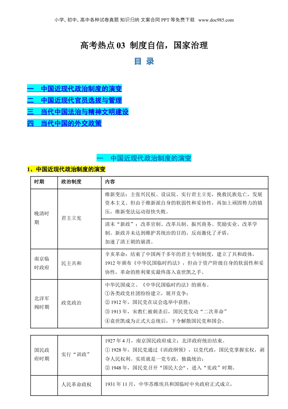 小学、初中、高中各种卷真知文案合同试题识归纳PPT等免下费载www.doc985.com高考热点03制度自信,国家治理目录一中国近现代政治制度的演变二中国近现代官员选拔与管理三当代中国法治与精神文明建设四当代中国的外交政策一中国近现代政治制度的演变1、中国近现代政治制度的演变时期政治制度内容晚清时期君主立宪维新变法:主张兴民权、设议院、实行君主立宪,挽救民族危亡,发展资本主义。但由于维新派自身的软弱性和妥协性,再加上顽固势力的镇压,维新变法运动很快失败。清末“新政”:改革官制、改革兵制、振兴商务、奖励实业、改革学制。新政并未达到维护其统治的目的,反而激化了矛盾,加速了清王朝的崩溃。南京临时政府民主共和辛亥革命:结束了中国两千多年的君主专制制度,建立了共和政体,1912年颁布《中华民国临时约法》,但由于资产阶级自身的软弱性和妥协性,革命的胜利果实最终落入袁世凯之手。北洋军阀时期政党政治中华民国成立、《中华民国临时约法》的颁布。①各类政党社团纷纷建立,展开竞争;②1912年,国民党在议会选举中获胜;③1913年,宋教仁被刺杀后,国民党发动“二次革命”④袁世凯成为正式大总统后,下令解散国民党和国会。国民政府时期实行“训政”1927年4月,南京国民政府成立;北洋政府统治结束。①1928年,国民党通过《训政纲领》,以党代政,国民党掌握实权,剥夺人民权利。实质就是一党专政,独裁统治;②1948年,国民党召开“国民大会",进入“宪政”时期。人民革命政权1931年11月,中华苏维埃共和国临时中央政府正式成立,小学、初中、高中各种卷真知文案合同试题识归纳PPT等免下费载www.doc985.com中国共产党民主政治探索这是创建人民革命政权的尝试。抗日民主政权抗日战争爆发后,中国共产党通过“三三制"原则,与党外人士实行民主合作,建立了包括地主阶级在内的抗日民主政权,设立边区政府,作为民国地方政府,巩固了抗日民族统一战线,推动了抗战的最终胜利。解放区政权建设设置行政区,巩固人民政权,为新中国的政权建设奠定了基础。中华人民共和国民主政权建设新民主主义政权中华人民共和国成立至社会主义过渡时期,实行工人阶级领导的以工农联盟为基础、团结各民主阶级和国内各民族的人民民主专政。社会主义政权①1954年第一届全国人大制定了第一部社会主义类型的宪法;②基本政治制度:中国共产党领导的多党合作和政治协商制度、民族区域自治制度、基层群众自治制度。③1982年宪法成为新时期治国安邦的总章程;④“中国共产党领导的多党合作和政治协商制度将长期存在和发展”被写入宪法;⑤2019年10月,中共十九届四中全会突出强调了中国共产党领导是中国特色社会主义最本质的特征,是中国特色社会主义制度的最大优势。1.(2022·全国乙卷)维新变法期间,湖南巡抚陈宝箴推行变法改革,但在上《请厘正学术造就人才折》中称“康有为平日所著《孔子改制考》一书……其徒和之,持之愈坚,失之愈远,嚣然自命,号为‘康学’,而民权平等之说炽矣”,并奏请销毁《孔子改制考》。这种主张()A.推动了新旧势力的合流B.试图突破“中体西用”束缚C.有助于减少变法的阻力D.意在彻底否定变法理论基础2.(2023·全国卷新课标)1910年,长沙爆发抢米风潮。具有地方议会性质的湖南谘议局致电军机处,请求朝廷撤换处置失当的巡抚,谘议局议长和士绅联名致电湖广总督瑞澂。瑞澂认为该士绅等“迹近干预”,上奏朝廷:“巡抚乃系疆臣,用舍尤应钦定。”这表明()A.新政强化了清廷权威B.谘议局架空了督抚权力C.地方势力控制了官场D.士绅阶层民主意识增强3.(2022·全国甲卷)1939年,朱德指出,“在中国,由议会选举政府,决定施政方针,边区是第一个”。1940年,毛泽东再次强调,这种政权“是一切赞成抗日又赞成民主的人们的政权,是几个革命阶级联合起来对于汉奸和反动派的民主专政”。这说明,边区政府()A.具备了新民主主义的特征B.脱离了国民政府管辖C.代表根据地社会全体意志D.仿行苏联的政治制度4.(2023·天津卷)1945年9月,陕甘宁边区参议会和政府决定将乡参议会改为乡人民代表会议,1946年4月,又规定边区、县、乡人民代表会...