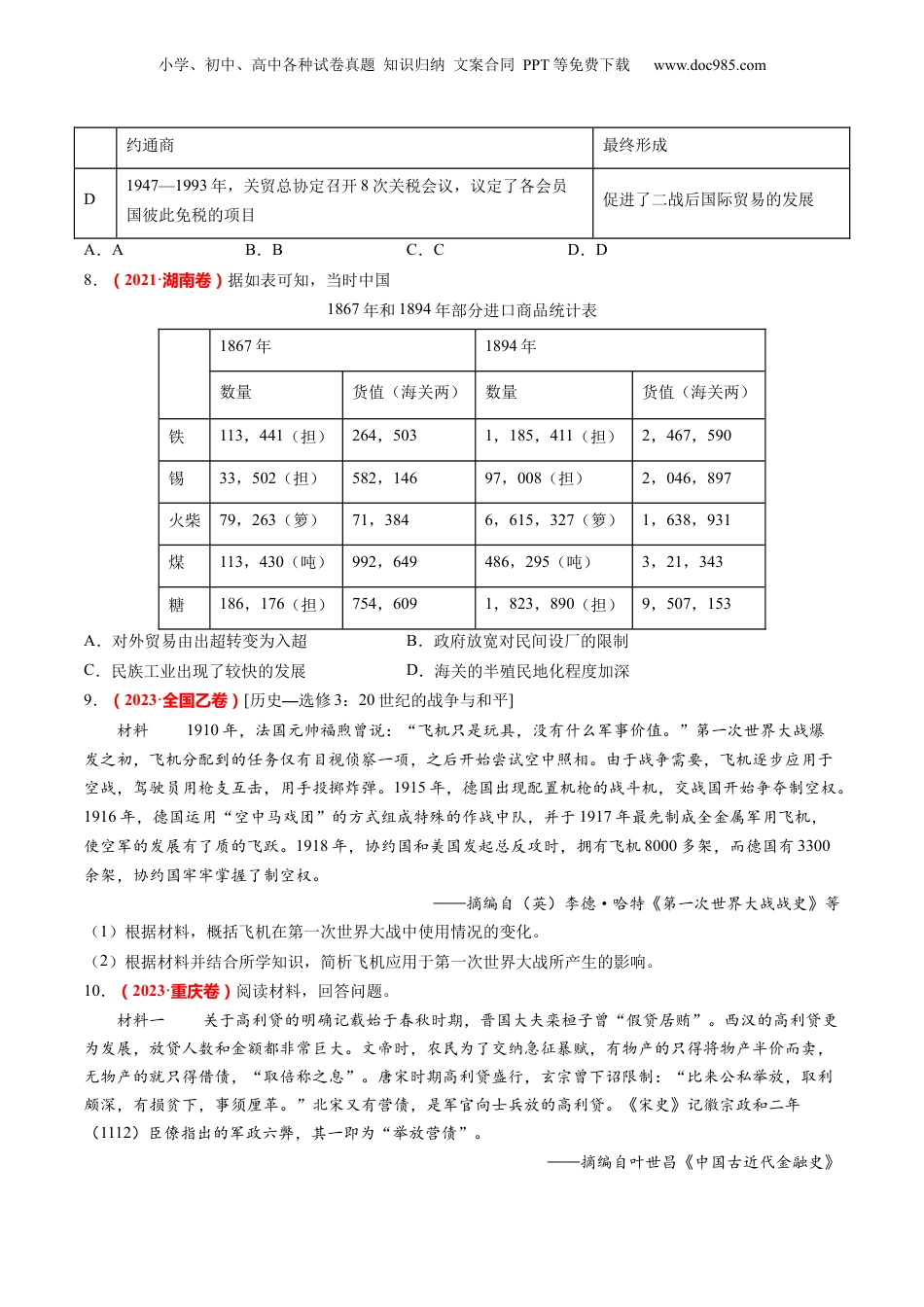 小学、初中、高中各种试卷真题知识归纳文案合同PPT等免费下载www.doc985.com专题09从分散到整体—工业革命与全球联系的建立与发展练考点·练考卷目录考点一新航路开辟与全球联系的建立与发展1真题回归1考题预测13考点二影响世界的工业革命17真题回归17考题预测26高考模拟卷(16+4)30按住ctrl键,同时点击目录,即可跳转到对应内容考点一新航路开辟与全球联系的建立与发展1.(2022·山东卷)如图为世界物种交流过程中两种作物的传播路线示意图,两种作物是A.小麦、玉米B.玉米、水稻C.小麦、甘蔗D.水稻、甘蔗2.(2022·全国甲卷)进口货物占总货物的价值比(%)1664-16701731-1740年胡椒20.14.3茶叶0.029.26小学、初中、高中各种试卷真题知识归纳文案合同PPT等免费下载www.doc985.com咖啡0.635.35棉纺织品62.5965.35该表是学者统计的17-18世纪英国东印度公司进口的部分亚洲货物价值占比。据表可知,该时期()A.生产方式决定进口货物价值占比B.英国确立海上贸易的霸主地位C.殖民扩张推动了消费结构的变化D.工业革命促进东西方贸易增长3.(2023·浙江卷6月)1694年,英格兰银行获准成立,在伦敦商人中大受欢迎,但贵族却对它不感兴趣。尽管英国国王带头认股,成为最早的一批股东,但贵族院却只有两人追随其后。直到1749年,一位英国政党领袖还说:国家是一条船,地主是船主,商人只是乘客。这说明(“”)A.英国的君主立宪制还未确立B.银行的商业经营方式最早出现于英国C.新的资本价值观念尚未普及D.光荣革命改变了英国的政权结构“”4.(2023·浙江卷1月)1896年,盛宣怀上奏:银行昉(开始)于泰西各国通商以来,华人不知务此“……,英、法、德、俄、日本之银行乃推行来华,攘我大利。近年中外士大夫灼见本末,亦多建开设银行之议”合天下之商力,以办天下之银行,但使华行多获一分之利,即从洋行收回一分之权。据此可知,盛宣怀“”建议开设银行的主要目的是()A.实现对外贸易垄断B.与外商争夺利权C.抵制洋货、提倡国货D.刺激民族资本主义的产生5.(2022·河北卷)19世纪50年代后,各地商人争相到上海采购,逐渐形成若干帮别,其中比较大的有北京帮、东北帮、川帮等,还有来自西北、西南边远省份的规模较小的帮别。各地客帮采购贩运,推动了转批分销业务的发展,材料主要反映了()A.区域经济水平存在差别B.口岸幅射效应显著C.列强资本深入中国内地D.传统商路日趋衰落6.(2022·辽宁卷)18世纪下半叶,欧洲国家邮政业务的主要服务对象由政府逐步扩大到民间,各国邮局数量普遍增加,邮政体系进一步完善。如普鲁士地区的信件传递速度在24小时内可达150千米,邮递范围遍及欧洲。据此可知邮政业()A.推动了工业革命的深入发展B.成为欧洲各国重点发展行业C.适应了资本主义发展的需求D.促进了人们文化素养的提高7.(2021·北京卷)下列选项中,史实与结论相符的是史实结论A16世纪,葡萄牙占据了好望角、马六甲、澳门等地葡萄牙垄断了整个欧亚大陆的贸易B1670年,荷兰商船总吨位达568万吨,超过了法、英、西、葡等国的总和17世纪末,荷兰开始成为海上霸主C19世纪,德国开通了通往非洲和澳大利亚的航线,还与美国缔标志着以德国为中心的世界市场小学、初中、高中各种试卷真题知识归纳文案合同PPT等免费下载www.doc985.com约通商最终形成D1947—1993年,关贸总协定召开8次关税会议,议定了各会员国彼此免税的项目促进了二战后国际贸易的发展A.AB.BC.CD.D8.(2021·湖南卷)据如表可知,当时中国1867年和1894年部分进口商品统计表1867年1894年数量货值(海关两)数量货值(海关两)铁113,441(担)264,5031,185,411(担)2,467,590锡33,502(担)582,14697,008(担)2,046,897火柴79,263(箩)71,3846,615,327(箩)1,638,931煤113,430(吨)992,649486,295(吨)3,21,343糖186,176(担)754,6091,823,890(担)9,507,153A.对外贸易由出超转变为入超B.政府放宽对民间设厂的限制C.民族工业出现了较快的发展D.海关的半殖民地化程度加深9.(2023·全国乙卷)[历史选修—3:20世纪的战争与和平]材料1910年,法...