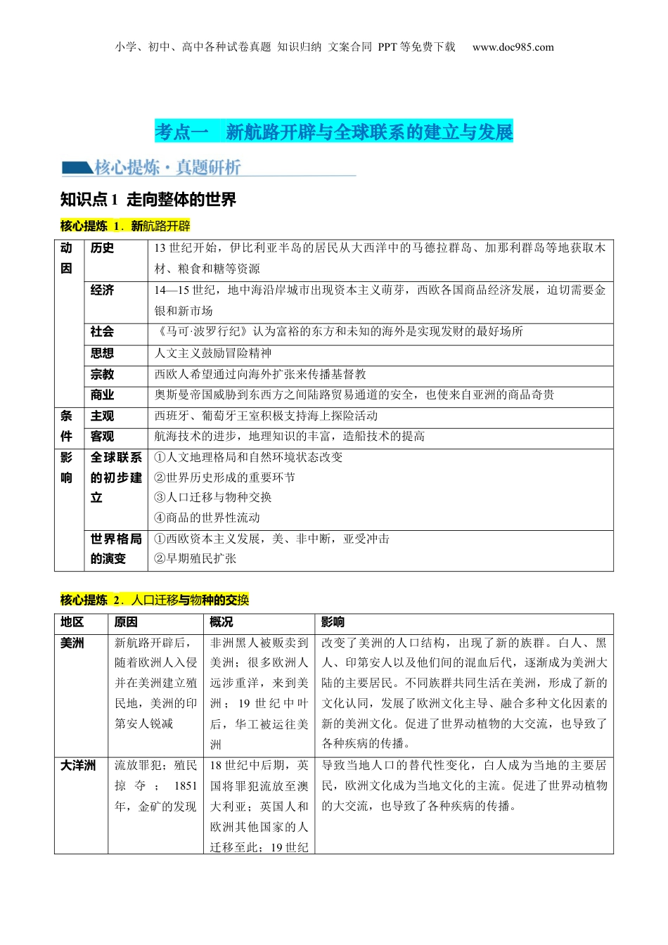 小学、初中、高中各种试卷真题知识归纳文案合同PPT等免费下载www.doc985.com题专09分整体工业革命与全球联系的建立与从散到—发展目录考情分析1网络构建2考点一新航路开辟与全球联系的建立与发展3核心提炼·真题研析3知识点1走向整体的世界3知识点2世界市场与商业贸易8题型特训·命题预测13考点二影响世界的工业革命17核心提炼·真题研析17知识点1两次工业革命17知识点2近代崭新的社会生活20题型特训·命题预测22按住ctrl键,同时点击目录,即可跳转到对应内容考点要求考题(统计2021—2023)考建备议新航路开辟与全球联系的建立与发展走向整体的世界3年13考(选择题6次,非选择题7次)3年考查较多,复习关注新航路开辟前后世界贸易的变化,理解世界经济联系的加强;重点把握早期殖民扩张的历程,认识欧、亚、非、美洲相互关系的变化世界市场与商业贸易3年14考(选择题11次,非选择题3次)影响世界的工业革命两次工业革命3年19考(选择题13次,非选择题6次)两次工业革命间的关系;理解第二次是第一次的深入发展是考查重点,复习时多关注。近代崭新的社会生活3年2考(选择题2次)小学、初中、高中各种试卷真题知识归纳文案合同PPT等免费下载www.doc985.com考点一新航路开辟与全球联系的建立与发展知识点1走向整体的世界核心提炼1新.航路开辟动因历史13世纪开始,伊比利亚半岛的居民从大西洋中的马德拉群岛、加那利群岛等地获取木材、粮食和糖等资源经济14—15世纪,地中海沿岸城市出现资本主义萌芽,西欧各国商品经济发展,迫切需要金银和新市场社会《马可·波罗行纪》认为富裕的东方和未知的海外是实现发财的最好场所思想人文主义鼓励冒险精神宗教西欧人希望通过向海外扩张来传播基督教商业奥斯曼帝国威胁到东西方之间陆路贸易通道的安全,也使来自亚洲的商品奇贵条件主观西班牙、葡萄牙王室积极支持海上探险活动客观航海技术的进步,地理知识的丰富,造船技术的提高影响全球联系的初步建立①人文地理格局和自然环境状态改变②世界历史形成的重要环节③人口迁移与物种交换④商品的世界性流动世界格局的演变①西欧资本主义发展,美、非中断,亚受冲击②早期殖民扩张核心提炼2与种的交.人口迁移物换地区原因概况影响美洲新航路开辟后,随着欧洲人入侵并在美洲建立殖民地,美洲的印第安人锐减非洲黑人被贩卖到美洲;很多欧洲人远涉重洋,来到美洲;19世纪中叶后,华工被运往美洲改变了美洲的人口结构,出现了新的族群。白人、黑人、印第安人以及他们间的混血后代,逐渐成为美洲大陆的主要居民。不同族群共同生活在美洲,形成了新的文化认同,发展了欧洲文化主导、融合多种文化因素的新的美洲文化。促进了世界动植物的大交流,也导致了各种疾病的传播。大洋洲流放罪犯;殖民掠夺;1851年,金矿的发现18世纪中后期,英国将罪犯流放至澳大利亚;英国人和欧洲其他国家的人迁移至此;19世纪导致当地人口的替代性变化,白人成为当地的主要居民,欧洲文化成为当地文化的主流。促进了世界动植物的大交流,也导致了各种疾病的传播。小学、初中、高中各种试卷真题知识归纳文案合同PPT等免费下载www.doc985.com中页后,华工到来非洲从16世纪开始的三四百年间,非洲失去了大约1亿人口,深刻改变了非洲的人口结构,严重影响了非洲的社会发展。另一方面,为殖民者在美洲的种植园和矿山提供了劳动力亚洲亚洲等地区也有族群混合现象美洲物种外传:15C末16C初,原产于美洲的玉米、马铃薯、甘薯、番茄、辣椒、花生、可可、南瓜等,由西班牙人和葡萄牙人带到欧洲,后来传播到亚洲、非洲等其他洲作物入美洲:小麦、大麦、水稻、苹果、葡萄、甜橙、柠檬、黄瓜、豌豆、甘蔗、咖啡等传入美洲玉米等:初供观赏,16C中叶起,南欧广泛种植;17C,仅次于小麦的粮食作物,传遍欧洲各国。16C末,马铃薯作为食用作物开始在欧洲推广。甘薯传播较慢。玉米等:明朝时多途径(西北、西南、东南)传入;丘陵山地到平原地区;乾嘉年间,大规模推广;鸦片战争前,已遍布全国。马铃薯和甘薯在中国的传播历程与玉米相似。(番麦、西天麦、玉蜀黍)小麦:由欧洲移民带到美洲,初仅供富人享用,后成为美洲的主要粮食作物。水...