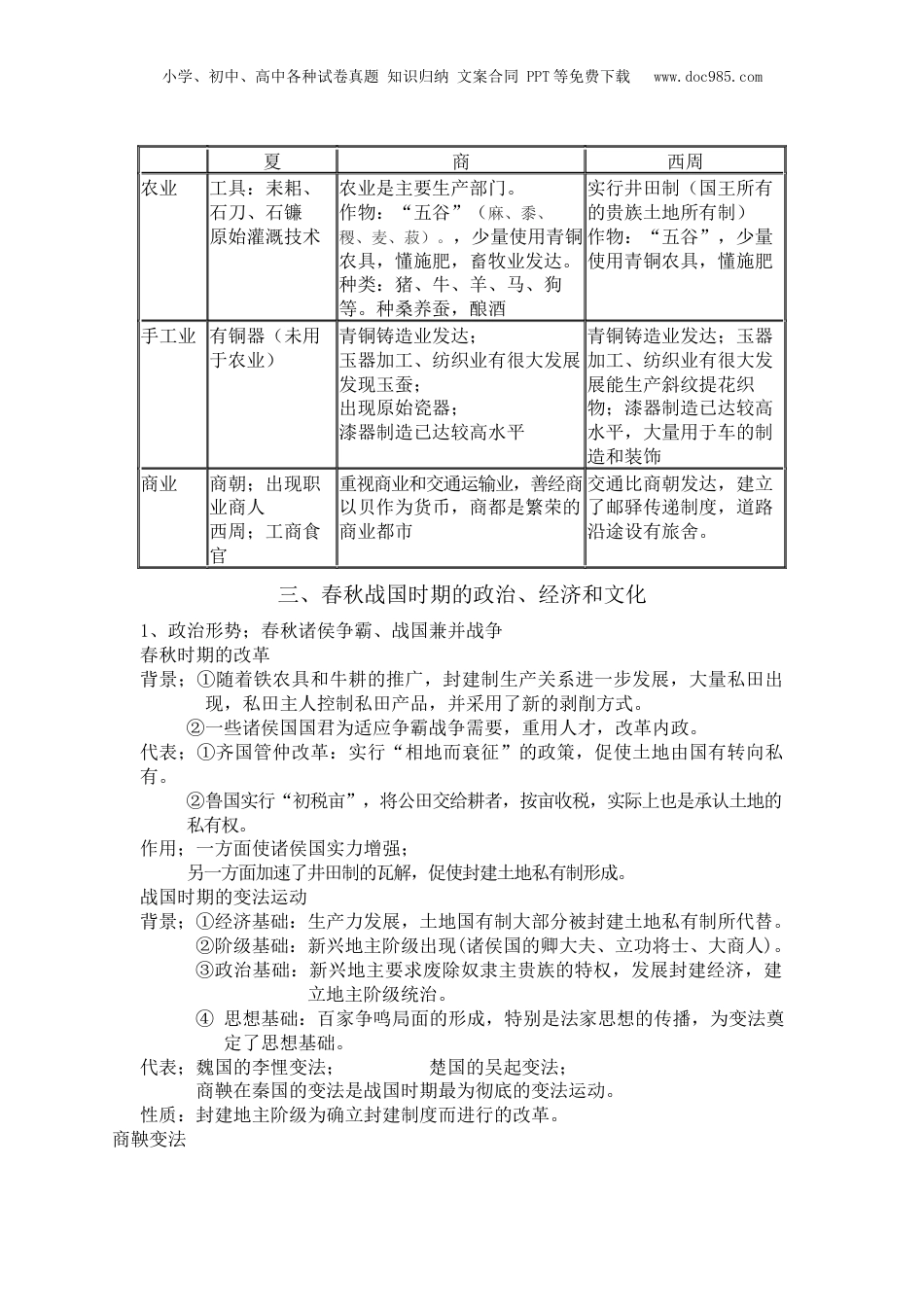 小学、初中、高中各种试卷真题知识归纳文案合同PPT等免费下载www.doc985.com一、原始社会1、农业始祖;“神农氏”制耒耜(我国最早的松土工具)教民农作2、农耕格局;南稻北粟3、耕作方式;刀耕火种4、土地制度;氏族公社所有5、手工业发展;以掌握制铜技术纺织技术已经萌芽,纺织原料是麻、葛和家蚕丝,开始人工育蚕彩陶和蛋壳黑陶工艺水平较高二、夏商西周时期的政治经济(一)夏朝和商朝1、夏朝始创王位世袭制建立;约公元前2070年,禹建立我国历史上第一个王朝---夏概念;是指王位在一家一姓中传承,父子相传或兄终弟及评价;是社会生产力的进步,私有制的发展,阶级对立下的产物,顺应了历史发展潮流,推动了人类社会的进步2、商朝;制度;内服和外服制度特点;神权和王权相结合;以血缘关系为纽带,实行宗法制(汉字已经形成完整体系)汉字按照甲骨文、大篆、小篆、隶书、楷书的脉络演变发展(二)西周的政治制度1、西周的分封制;(分配权力的制度)含义;封邦建国目的;巩固周王朝的奴隶制统治对象;同姓王族、异姓功臣、先代贵族分封的诸侯国;鲁、齐、燕、宋,晋主要内容:权利;诸侯在封国内享有世袭统治权义务;定期朝贡,提供军赋和力役演变;开始于周武王,破坏于西周后期,崩溃于春秋战国影响;积极;扩大统治区域,有利于稳定当时的政治秩序,为华夏族的形成奠定基础消极;使周天子的权威逐渐消弱2、西周宗法制(分配权利的原则)核心;嫡长子继承制。目的;保证王权的稳定实质;用父子血缘亲情来维系王权的威严和稳定。作用:有利于凝聚宗族,防止内部纷争,强化王权,把“国”和“家”密切地结合在一起。3、西周礼乐制度----维护等级制度,防止僭越行为的工具,有利于统治制度的稳定(三)夏商西周的经济小学、初中、高中各种试卷真题知识归纳文案合同PPT等免费下载www.doc985.com夏商西周农业工具:耒耜、石刀、石镰原始灌溉技术农业是主要生产部门。作物:“五谷”(麻、黍、稷、麦、菽)。,少量使用青铜农具,懂施肥,畜牧业发达。种类:猪、牛、羊、马、狗等。种桑养蚕,酿酒实行井田制(国王所有的贵族土地所有制)作物:“五谷”,少量使用青铜农具,懂施肥手工业有铜器(未用于农业)青铜铸造业发达;玉器加工、纺织业有很大发展发现玉蚕;出现原始瓷器;漆器制造已达较高水平青铜铸造业发达;玉器加工、纺织业有很大发展能生产斜纹提花织物;漆器制造已达较高水平,大量用于车的制造和装饰商业商朝;出现职业商人西周;工商食官重视商业和交通运输业,善经商以贝作为货币,商都是繁荣的商业都市交通比商朝发达,建立了邮驿传递制度,道路沿途设有旅舍。三、春秋战国时期的政治、经济和文化1、政治形势;春秋诸侯争霸、战国兼并战争春秋时期的改革背景;①随着铁农具和牛耕的推广,封建制生产关系进一步发展,大量私田出现,私田主人控制私田产品,并采用了新的剥削方式。②一些诸侯国国君为适应争霸战争需要,重用人才,改革内政。代表;①齐国管仲改革:实行“相地而衰征”的政策,促使土地由国有转向私有。②鲁国实行“初税亩”,将公田交给耕者,按亩收税,实际上也是承认土地的私有权。作用;一方面使诸侯国实力增强;另一方面加速了井田制的瓦解,促使封建土地私有制形成。战国时期的变法运动背景;①经济基础:生产力发展,土地国有制大部分被封建土地私有制所代替。②阶级基础:新兴地主阶级出现(诸侯国的卿大夫、立功将士、大商人)。③政治基础:新兴地主要求废除奴隶主贵族的特权,发展封建经济,建立地主阶级统治。④思想基础:百家争鸣局面的形成,特别是法家思想的传播,为变法奠定了思想基础。代表;魏国的李悝变法;楚国的吴起变法;商鞅在秦国的变法是战国时期最为彻底的变法运动。性质:封建地主阶级为确立封建制度而进行的改革。商鞅变法小学、初中、高中各种试卷真题知识归纳文案合同PPT等免费下载www.doc985.com时间公元前356~前350年,秦孝公任用商鞅两次进行变法内容①政治:为防范人民反抗,加强专制统治,实行“令民为什伍”的连坐法;废分封,行县制。②经济:重农抑商,奖励耕织;统一秦国的度量衡。③废除井田制,以法律形...