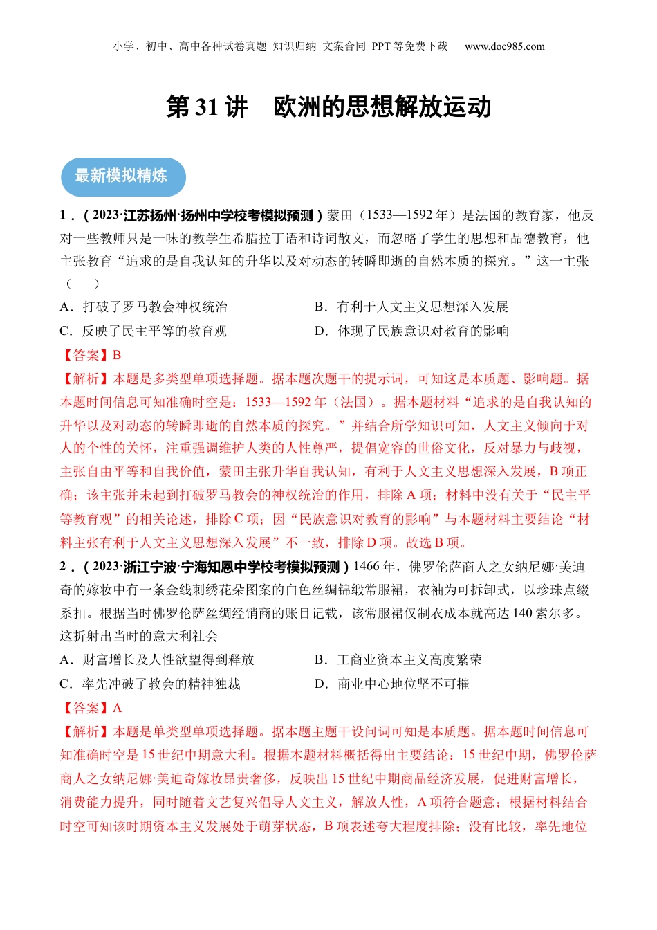 小学、初中、高中各种试卷真题知识归纳文案合同PPT等免费下载www.doc985.com第31讲欧洲的思想解放运动1.(2023·江苏扬州·扬州中学校考模拟预测)蒙田(1533—1592年)是法国的教育家,他反对一些教师只是一味的教学生希腊拉丁语和诗词散文,而忽略了学生的思想和品德教育,他主张教育“追求的是自我认知的升华以及对动态的转瞬即逝的自然本质的探究。”这一主张()A.打破了罗马教会神权统治B.有利于人文主义思想深入发展C.反映了民主平等的教育观D.体现了民族意识对教育的影响【答案】B【解析】本题是多类型单项选择题。据本题次题干的提示词,可知这是本质题、影响题。据本题时间信息可知准确时空是:1533—1592年(法国)。据本题材料“追求的是自我认知的升华以及对动态的转瞬即逝的自然本质的探究。”并结合所学知识可知,人文主义倾向于对人的个性的关怀,注重强调维护人类的人性尊严,提倡宽容的世俗文化,反对暴力与歧视,主张自由平等和自我价值,蒙田主张升华自我认知,有利于人文主义思想深入发展,B项正确;该主张并未起到打破罗马教会的神权统治的作用,排除A项;材料中没有关于“民主平等教育观”的相关论述,排除C项;因“民族意识对教育的影响”与本题材料主要结论“材料主张有利于人文主义思想深入发展”不一致,排除D项。故选B项。2.(2023·浙江宁波·宁海知恩中学校考模拟预测)1466年,佛罗伦萨商人之女纳尼娜·美迪奇的嫁妆中有一条金线刺绣花朵图案的白色丝绸锦缎常服裙,衣袖为可拆卸式,以珍珠点缀系扣。根据当时佛罗伦萨丝绸经销商的账目记载,该常服裙仅制衣成本就高达140索尔多。这折射出当时的意大利社会A.财富增长及人性欲望得到释放B.工商业资本主义高度繁荣C.率先冲破了教会的精神独裁D.商业中心地位坚不可摧【答案】A【解析】本题是单类型单项选择题。据本题主题干设问词可知是本质题。据本题时间信息可知准确时空是15世纪中期意大利。根据本题材料概括得出主要结论:15世纪中期,佛罗伦萨商人之女纳尼娜·美迪奇嫁妆昂贵奢侈,反映出15世纪中期商品经济发展,促进财富增长,消费能力提升,同时随着文艺复兴倡导人文主义,解放人性,A项符合题意;根据材料结合时空可知该时期资本主义发展处于萌芽状态,B项表述夸大程度排除;没有比较,率先地位最新模拟精炼小学、初中、高中各种试卷真题知识归纳文案合同PPT等免费下载www.doc985.com凸显不了,根据材料结合史实可知,当时人们仍受教会束缚,冲破表述过于绝对,排除C项;材料只能反映该时期人们消费能力欲望的增强,与商业中心地位无直接关联,逻辑不符,排除D项。故选A项。3.(2023·河北·统考模拟预测)15世纪,英国法律规定,教会不得垄断教育,任何个人或团体经过政府批准备案都有权建立学校,家长也有权为子女自由选择学校。同时,欧洲新兴的市民阶级摒弃了对《圣经》单调的研习,而是热衷于创办拉丁文法学校,还新开设了读写算术、逻辑学和哲学等课程。这说明()A.基督教会的神权统治被摧毁B.普通民众的政治经济地位得到提高C.商品经济发展助推制度变革D.文艺复兴推动了欧洲教育的世俗化【答案】D【解析】本题是单类型单项选择题。据本题主题干的设问词,可知这是本质题。据本题时间信息可知准确时空是:15世纪(欧洲)。根据材料“15世纪”“任何个人或团体经过政府批准备案都有权建立学校”“热衷于创办拉丁文法学校,还新开设了读写算术、逻辑学和哲学等课程”等信息并结合所学知识可知,这一时期由于文艺复兴的兴起和人文主义思想的传播,社会较为重视教育的发展。拉了文法学校有利于学者对文化知识的传播,同时可以打破基督教会神学一统天下、垄断文化教育的局面,写作和算学学校有利于为商业培养专门的技术人才,使商业朝着专业化方向发展,这些都在说明文艺复兴推动了欧洲教育的世俗化趋向,D项正确;A项说法过于绝对,基督教会的神权统治并没有被摧毁,排除A项;材料反映了文艺复兴推动了欧洲教育的世俗化,并不能说明普通民众的政治经济地位得到提高,排除B项;材料反映了欧洲教育的世俗化,未涉及制度变革,排除C项。故选D项。4.(2023·福建宁德·福建省宁...