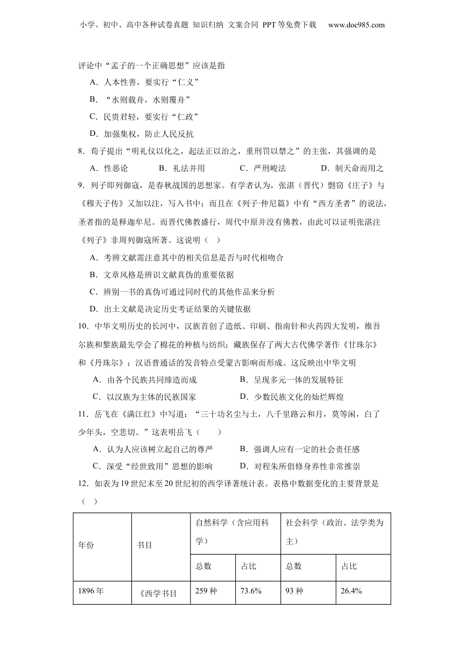 小学、初中、高中各种试卷真题知识归纳文案合同PPT等免费下载www.doc985.com中华优秀传统文化的内涵与特点专项练习--2024届高三历史统编版二轮复习1.孔子说“周监于二代,郁郁乎文哉!吾从周。”意思是说:周在借鉴夏、商的基础上发展出非常丰富完备的制度,所以我遵从周。在这里,孔子表达了要“从”周的A.诗B.礼C.义D.乐2.我国早在春秋战国时就把农历九月九日作为重阳,重阳节的求寿之俗始于汉代。唐代,重阳被政府定为正式节日。宋代,重阳节朝廷拜先帝、祀三皇,普通百姓则上坟祭奠祖先,这一习俗延续至明清。1989年,我国政府将农历九月初九正式定为“中国老人节”“敬老节”。这主要说明()A.儒家思想渗入日常生活B.传统节日文化内涵不断丰富C.中华传统美德源远流长D.中国历代政府推崇尊老敬老3.“仁、义、礼、智、信、恕、忠、孝、悌”的主张出自()A.儒家B.道家C.法家D.佛教4.1707年,因礼仪之争,罗马教廷引发了西方传教士与中国士大夫激烈的矛盾,康熙针锋相对,对凡不尊重中国风俗的西方传教士一概驱逐。1775年,在华耶稣会接到罗马教廷命令正式解散,这意味着明清之际西方文化大规模输入中国的终结。这说明当时()A.东西方制度冲突严重B.中国本土宗教已觉醒C.清朝君主专制达顶峰D.儒家思想的特殊地位5.有学者指出:“由于历史的和地理的条件,汉字伴随着汉文化东传朝鲜、日本,南被越南,形成‘汉字文化圈’。”该文化圈又因汉字所承载的中华文明,被称为“中国文化圈”。下边可以佐证这一说法的是()①朝鲜许多学者的汉文造诣深厚②日本曾把儒家经典作为教科书③越南在汉字基础上创造出谚文④首尔景福宫的门均以汉字命名A.①②③B.①②④C.①③④D.②③④6.春联在古代属骈文文学,一开始具有消灾辟邪的神秘特质,随着时间推移,春联消灾辟邪的神秘特质逐渐弱化,而具有了人间祈福和吉庆的功能。这反映了A.平民化、世俗化的趋势B.古代人文主义思想发展C.由人性向神性根本逆转D.民俗文化推动社会发展7.历史学家费正清在评论秦朝灭亡时说:“在证明了法家思想有效的同时,秦王朝也从反面体现了孟子的一个正确思想——政府最终还是要依靠被统治者的默认。”这一小学、初中、高中各种试卷真题知识归纳文案合同PPT等免费下载www.doc985.com评论中“孟子的一个正确思想”应该是指A.人本性善,要实行“仁义”B.“水则载舟,水则覆舟”C.民贵君轻,要实行“仁政”D.加强集权,防止人民反抗8.荀子提出“明礼仪以化之,起法正以治之,重刑罚以禁之”的主张,其强调的是A.性恶论B.礼法并用C.严刑峻法D.制天命而用之9.列子即列御寇,是春秋战国的思想家。有学者认为,张湛(晋代)剽窃《庄子》与《穆天子传》又加以注,写入书中;而且在《列子·仲尼篇》中有“西方圣者”的说法,圣者指的是释迦牟尼。而晋代佛教盛行,周代中原并没有佛教,由此可以证明张湛注《列子》非周列御寇所著。这说明()A.考辨文献需注意其中的相关信息是否与时代相吻合B.文章风格是辨识文献真伪的重要依据C.辨别一书的真伪可通过同时代的其他作品来分析D.出土文献是决定历史考证结果的关键依据10.中华文明历史的长河中,汉族首创了造纸、印刷、指南针和火药四大发明,维吾尔族和黎族最先学会了棉花的种植与纺织;藏族保存了两大古代佛学著作《甘珠尔》和《丹珠尔》;汉语普通话的发音特点受蒙古影响而形成。这反映出中华文明A.由各个民族共同缔造而成B.呈现多元一体的发展特征C.以汉族为主体的民族国家D.少数民族文化的灿烂辉煌11.岳飞在《满江红》中写道:“三十功名尘与土,八千里路云和月,莫等闲,白了少年头,空悲切。”这表明岳飞()A.认为人应该树立起自己的尊严B.强调人应有一定的社会责任感C.深受“经世致用”思想的影响D.对程朱所倡修身养性非常推崇12.如表为19世纪末至20世纪初的西学译著统计表。表格中数据变化的主要背景是()年份书目自然科学(含应用科学)社会科学(政治、法学类为主)总数占比总数占比1896年《西学书目259种73.6%93种26.4%小学、初中、高中各种试卷真题知识归纳文案合同PPT等免费下载www.doc985.com表》19...