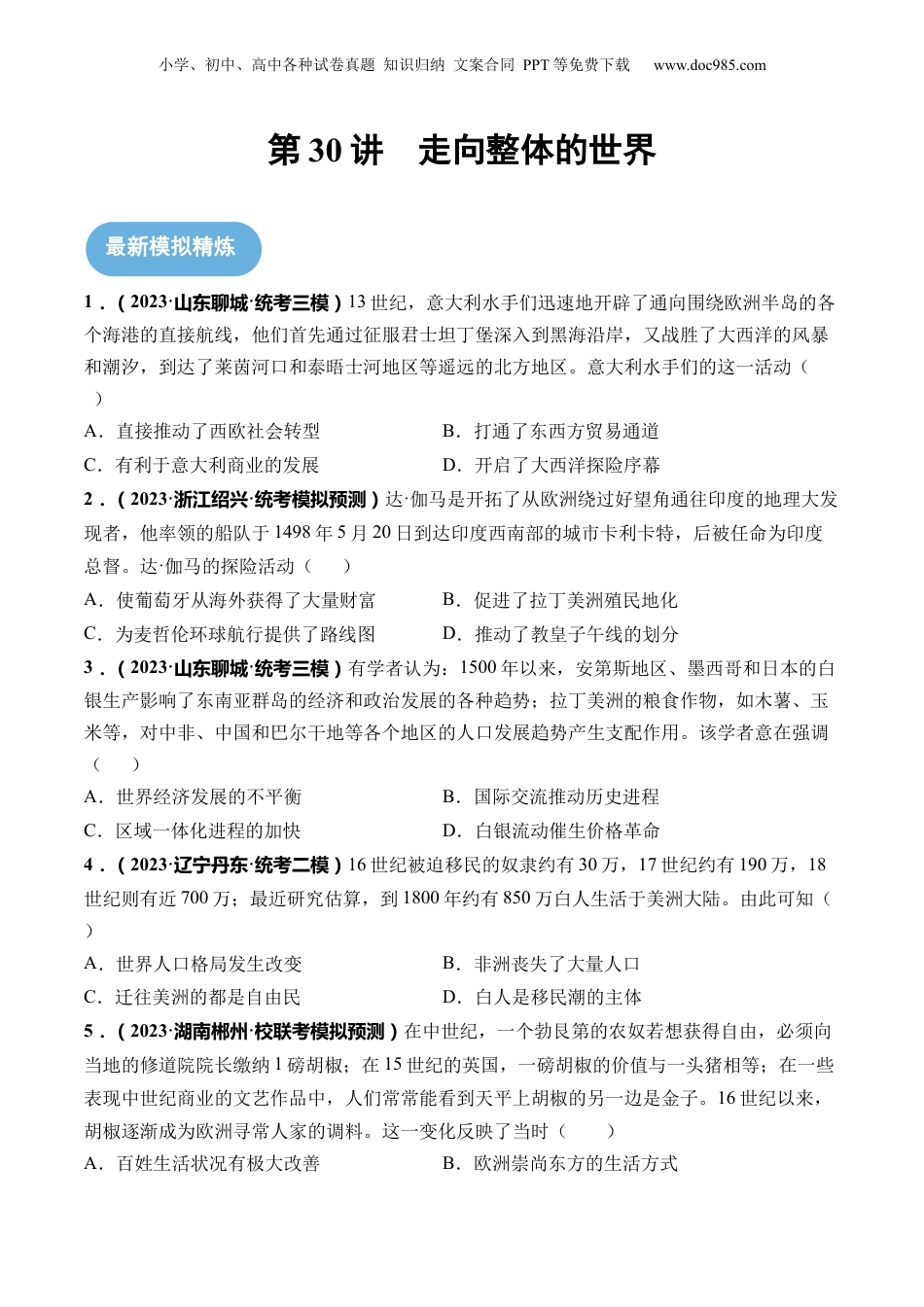小学、初中、高中各种试卷真题知识归纳文案合同PPT等免费下载www.doc985.com第30讲走向整体的世界1.(2023·山东聊城·统考三模)13世纪,意大利水手们迅速地开辟了通向围绕欧洲半岛的各个海港的直接航线,他们首先通过征服君士坦丁堡深入到黑海沿岸,又战胜了大西洋的风暴和潮汐,到达了莱茵河口和泰晤士河地区等遥远的北方地区。意大利水手们的这一活动()A.直接推动了西欧社会转型B.打通了东西方贸易通道C.有利于意大利商业的发展D.开启了大西洋探险序幕2.(2023·浙江绍兴·统考模拟预测)达·伽马是开拓了从欧洲绕过好望角通往印度的地理大发现者,他率领的船队于1498年5月20日到达印度西南部的城市卡利卡特,后被任命为印度总督。达·伽马的探险活动()A.使葡萄牙从海外获得了大量财富B.促进了拉丁美洲殖民地化C.为麦哲伦环球航行提供了路线图D.推动了教皇子午线的划分3.(2023·山东聊城·统考三模)有学者认为:1500年以来,安第斯地区、墨西哥和日本的白银生产影响了东南亚群岛的经济和政治发展的各种趋势;拉丁美洲的粮食作物,如木薯、玉米等,对中非、中国和巴尔干地等各个地区的人口发展趋势产生支配作用。该学者意在强调()A.世界经济发展的不平衡B.国际交流推动历史进程C.区域一体化进程的加快D.白银流动催生价格革命4.(2023·辽宁丹东·统考二模)16世纪被迫移民的奴隶约有30万,17世纪约有190万,18世纪则有近700万;最近研究估算,到1800年约有850万白人生活于美洲大陆。由此可知()A.世界人口格局发生改变B.非洲丧失了大量人口C.迁往美洲的都是自由民D.白人是移民潮的主体5.(2023·湖南郴州·校联考模拟预测)在中世纪,一个勃艮第的农奴若想获得自由,必须向当地的修道院院长缴纳1磅胡椒;在15世纪的英国,一磅胡椒的价值与一头猪相等;在一些表现中世纪商业的文艺作品中,人们常常能看到天平上胡椒的另一边是金子。16世纪以来,胡椒逐渐成为欧洲寻常人家的调料。这一变化反映了当时()A.百姓生活状况有极大改善B.欧洲崇尚东方的生活方式最新模拟精炼小学、初中、高中各种试卷真题知识归纳文案合同PPT等免费下载www.doc985.comC.东西方商品贸易快速发展D.胡椒充当了等价物的角色6.(2023·吉林·统考模拟预测)有作家描写16世纪70年代外国的社会生活时,这样写道:“没过多久,中国的丝织品就传遍了京都和利马的大街小巷,中国的棉纺织品也被卖到菲律宾和和墨西哥的市场上,而中国的瓷器也被从堺市(日本大阪府的城市)到伦敦的家庭广泛使用。”由材料可以推知该时期()A.大量白银流入中国市场B.中国已经形成全国性市场C.中国是世界的贸易中心D.中国是世界上最发达国家7.(2023·江苏镇江·江苏省镇江中学校考模拟预测)大航海时代,西班牙人用陆军占领的方式直接统治殖民地,英国人通过公司来经营管理殖民地。英国通过贵族和商人一起开公司把殖民主义和资本主义融为一体,既为未来美国社会涂上民主底色,又使后来国内革命没有必要血洗贵族。由此可知()A.特权公司的民主管理促进北美社会进步B.治理模式影响社会发展C.西班牙的殖民统治方式体现其国力落后D.经济基础决定上层建筑8.(2023·湖北·统考模拟预测)在新大陆的金银被大量开采之前,欧洲可用于国际贸易交换的值钱商品很少。后来,欧洲人把美洲出产的白银运到亚洲和欧洲,从亚洲购买商品,转运到欧洲和美洲高价卖出;运到欧洲的白银也被投入到中国市场,以购买丝绸、茶叶和瓷器。这表明()A.欧洲在与东方的贸易中长期处于出超地位B.工业革命密切了世界经济联系C.贵金属的流入加速了欧洲资本的原始积累D.欧洲的原工业化处于起步阶段9.(2023·湖北·统考模拟预测)16世纪中叶,葡萄牙人开始在巴西大量种植热带经济作物。17世纪,巴西发现了大量黄金矿藏,大量淘金客涌向巴西,导致该地的人口迅速增长。巴西因此成为葡萄牙最有价值的海外属地。据此推知,当时()A.殖民扩张改变了地域经济格局B.价格革命使全球联系紧密C.葡萄牙与西班牙之间矛盾激化D.商业革命使贫富差距扩大10.(2023·安徽阜阳·安徽省临泉第一中学校考模拟预测)阅读材料,...