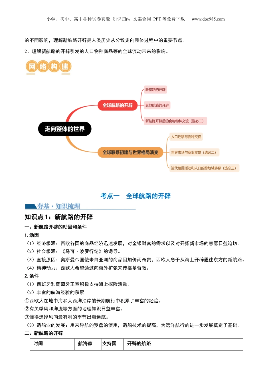 小学、初中、高中各种试卷真题知识归纳文案合同PPT等免费下载www.doc985.com专题十一工场手工业时期:近代早期的西方世界第30讲走向整体的世界目录考情分析复习目标网络构建梳理预测考点一全球航路的开辟【夯基·知识梳理】知识点1新航路的开辟知识点2其他航路的开辟知识点3新航路开辟后的食物物种交流(选必二)【提升·考向预测】考向1全球航路的开辟考点二全球联系初建与世界格局演变【夯基·知识梳理】知识点1人口迁移与物种交换知识点2世界市场与商业贸易(选必二)知识点3近代殖民活动和人口的跨地域转移(选必三)【提升·考向预测】考向1早期殖民扩张真题感悟考点要求考题统计考情分析全球航路的开辟2023广东卷选择题,3分2023北京卷非选择题,12分这部分内容是近代史开端,是高考关注的重点,结合地图进行复习。早期殖民扩张2023海南卷非选择题,15分2023全国甲卷非选择题,15分2022福建卷非选择题,12分2022全国甲卷选择题,4分近三年考查较多,早期殖民扩张和世界市场是构成全球联系的主要内容,重点复习。1、通过了解新航路开辟所引发的全球流动、人类认识世界的视野和能力的改变,以及对世界各区域文明小学、初中、高中各种试卷真题知识归纳文案合同PPT等免费下载www.doc985.com的不同影响,理解新航路开辟是人类历史从分散走向整体过程中的重要节点。2、理解新航路的开辟引发的人口物种商品等的全球流动带来的影响。考点一全球航路的开辟知识点1:新航路的开辟一、新航路开辟的动因和条件1.动因(1)经济根源:西欧各国的商品经济迅速发展,对金银财富的需求以及对开拓新市场的意愿日益迫切。(2)社会根源:《马可·波罗行纪》的诱导。(3)直接原因:奥斯曼帝国使来自亚洲的商品因加价而奇贵,西欧人急于从海上开辟通往东方的新航路。(4)精神动力:西欧人希望通过向海外扩张来传播基督教。2.条件(1)西班牙和葡萄牙王室积极支持海上探险活动。(2)丰富的航海经验的积累①西欧人在地中海和大西洋沿岸的长期航行中积累了丰富的经验。②有关季风和洋流等方面的地理知识日益丰富。③懂得选择风向最有利的季节出海远航。(3)造船业的发展:用来导航的罗盘的使用,造船技术的提高,为远洋航行的进一步发展奠定了基础。二、新航路的开辟时间航海家支持国开辟的航路小学、初中、高中各种试卷真题知识归纳文案合同PPT等免费下载www.doc985.com1487年迪亚士葡萄牙绕过非洲西南端的好望角,到达非洲东海岸1497—1498年达·伽马葡萄牙绕过非洲西南端的好望角,驶达印度1492年哥伦布西班牙横渡大西洋的往返远航,开辟了从欧洲到美洲的新航路1519—1522年麦哲伦(船队)西班牙绕过南美洲,进入太平洋,到达菲律宾群岛,完成了人类历史上第一次环球航行三、多角度理解新航路开辟的影响1.对世界(1)人类开始由分散孤立走向整体世界。(2)地区性贸易开始向世界性贸易扩展,以西欧为中心的世界市场的雏形开始出现。2.对欧洲(1)促进封建制度的解体和资本主义的发展,西欧开始崛起。(2)欧洲的贸易中心由原来的地中海地区转移到大西洋沿岸。(3)促使西、葡、荷、英、法等国走上殖民扩张道路3.对亚非拉地区(1)对美洲:掠夺财富,屠杀印第安人,给美洲的传统社会带来灭顶之灾(2)对亚洲:掠夺财富,大量白银流入中国,客观上刺激了中国经济的发展(3)对非洲:成为猎获黑人奴隶的场所,给非洲传统社会带来深重的灾难。知识点2:其他航路的开辟1.背景:(1)新航路开辟后,西班牙和葡萄牙占据了欧洲至亚洲和美洲最有利的通商航路。(2)英国、荷兰等国为发展海上贸易,开始在北大西洋的高纬度地区寻找通往亚洲的航路。2.过程(1)探索和开辟到北冰洋的航线①1497年,英国卡伯特父子发现了一块“新发现的大陆”,即纽芬兰岛。②16世纪,法国人卡蒂埃到达拉布拉多半岛。③荷兰航海家巴伦支三次航行北冰洋地区,留下了详细的航行记录和准确的航海图。④17世纪初,效力于荷兰的英国人哈得逊曾多次向西北航行,探索经北冰洋通向亚洲的航路。⑤俄罗斯人在北太平洋和西伯利亚地区进行了多次海上和陆上探险,开辟了北太平洋到北冰洋的航线。(2)不断探寻南半球的新世界。①1578年,...