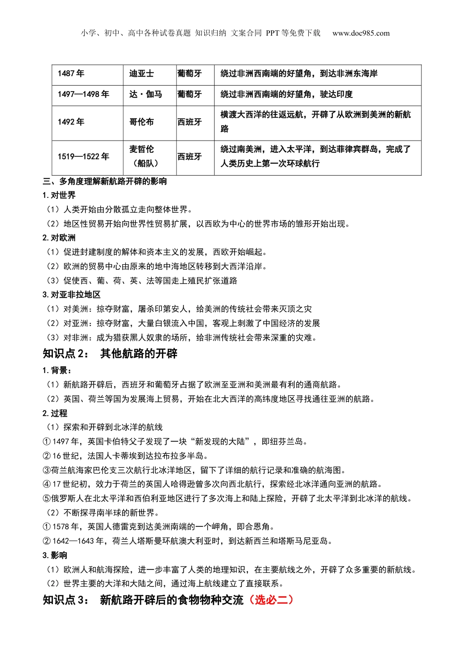 小学、初中、高中各种试卷真题知识归纳文案合同PPT等免费下载www.doc985.com专题十一工场手工业时期:近代早期的西方世界第30讲走向整体的世界目录考情分析复习目标网络构建梳理预测考点一全球航路的开辟【夯基·知识梳理】知识点1新航路的开辟知识点2其他航路的开辟知识点3新航路开辟后的食物物种交流(选必二)【提升·考向预测】考向1全球航路的开辟考点二全球联系初建与世界格局演变【夯基·知识梳理】知识点1人口迁移与物种交换知识点2世界市场与商业贸易(选必二)知识点3近代殖民活动和人口的跨地域转移(选必三)【提升·考向预测】考向1早期殖民扩张真题感悟考点要求考题统计考情分析全球航路的开辟2023广东卷选择题,3分2023北京卷非选择题,12分这部分内容是近代史开端,是高考关注的重点,结合地图进行复习。早期殖民扩张2023海南卷非选择题,15分2023全国甲卷非选择题,15分2022福建卷非选择题,12分2022全国甲卷选择题,4分近三年考查较多,早期殖民扩张和世界市场是构成全球联系的主要内容,重点复习。1、通过了解新航路开辟所引发的全球流动、人类认识世界的视野和能力的改变,以及对世界各区域文明小学、初中、高中各种试卷真题知识归纳文案合同PPT等免费下载www.doc985.com的不同影响,理解新航路开辟是人类历史从分散走向整体过程中的重要节点。2、理解新航路的开辟引发的人口物种商品等的全球流动带来的影响。考点一全球航路的开辟知识点1:新航路的开辟一、新航路开辟的动因和条件1.动因(1)经济根源:西欧各国的商品经济迅速发展,对金银财富的需求以及对开拓新市场的意愿日益迫切。(2)社会根源:《马可·波罗行纪》的诱导。(3)直接原因:奥斯曼帝国使来自亚洲的商品因加价而奇贵,西欧人急于从海上开辟通往东方的新航路。(4)精神动力:西欧人希望通过向海外扩张来传播基督教。2.条件(1)西班牙和葡萄牙王室积极支持海上探险活动。(2)丰富的航海经验的积累①西欧人在地中海和大西洋沿岸的长期航行中积累了丰富的经验。②有关季风和洋流等方面的地理知识日益丰富。③懂得选择风向最有利的季节出海远航。(3)造船业的发展:用来导航的罗盘的使用,造船技术的提高,为远洋航行的进一步发展奠定了基础。二、新航路的开辟时间航海家支持国开辟的航路小学、初中、高中各种试卷真题知识归纳文案合同PPT等免费下载www.doc985.com1487年迪亚士葡萄牙绕过非洲西南端的好望角,到达非洲东海岸1497—1498年达·伽马葡萄牙绕过非洲西南端的好望角,驶达印度1492年哥伦布西班牙横渡大西洋的往返远航,开辟了从欧洲到美洲的新航路1519—1522年麦哲伦(船队)西班牙绕过南美洲,进入太平洋,到达菲律宾群岛,完成了人类历史上第一次环球航行三、多角度理解新航路开辟的影响1.对世界(1)人类开始由分散孤立走向整体世界。(2)地区性贸易开始向世界性贸易扩展,以西欧为中心的世界市场的雏形开始出现。2.对欧洲(1)促进封建制度的解体和资本主义的发展,西欧开始崛起。(2)欧洲的贸易中心由原来的地中海地区转移到大西洋沿岸。(3)促使西、葡、荷、英、法等国走上殖民扩张道路3.对亚非拉地区(1)对美洲:掠夺财富,屠杀印第安人,给美洲的传统社会带来灭顶之灾(2)对亚洲:掠夺财富,大量白银流入中国,客观上刺激了中国经济的发展(3)对非洲:成为猎获黑人奴隶的场所,给非洲传统社会带来深重的灾难。知识点2:其他航路的开辟1.背景:(1)新航路开辟后,西班牙和葡萄牙占据了欧洲至亚洲和美洲最有利的通商航路。(2)英国、荷兰等国为发展海上贸易,开始在北大西洋的高纬度地区寻找通往亚洲的航路。2.过程(1)探索和开辟到北冰洋的航线①1497年,英国卡伯特父子发现了一块“新发现的大陆”,即纽芬兰岛。②16世纪,法国人卡蒂埃到达拉布拉多半岛。③荷兰航海家巴伦支三次航行北冰洋地区,留下了详细的航行记录和准确的航海图。④17世纪初,效力于荷兰的英国人哈得逊曾多次向西北航行,探索经北冰洋通向亚洲的航路。⑤俄罗斯人在北太平洋和西伯利亚地区进行了多次海上和陆上探险,开辟了北太平洋到北冰洋的航线。(2)不断探寻南半球的新世界。①1578年,...