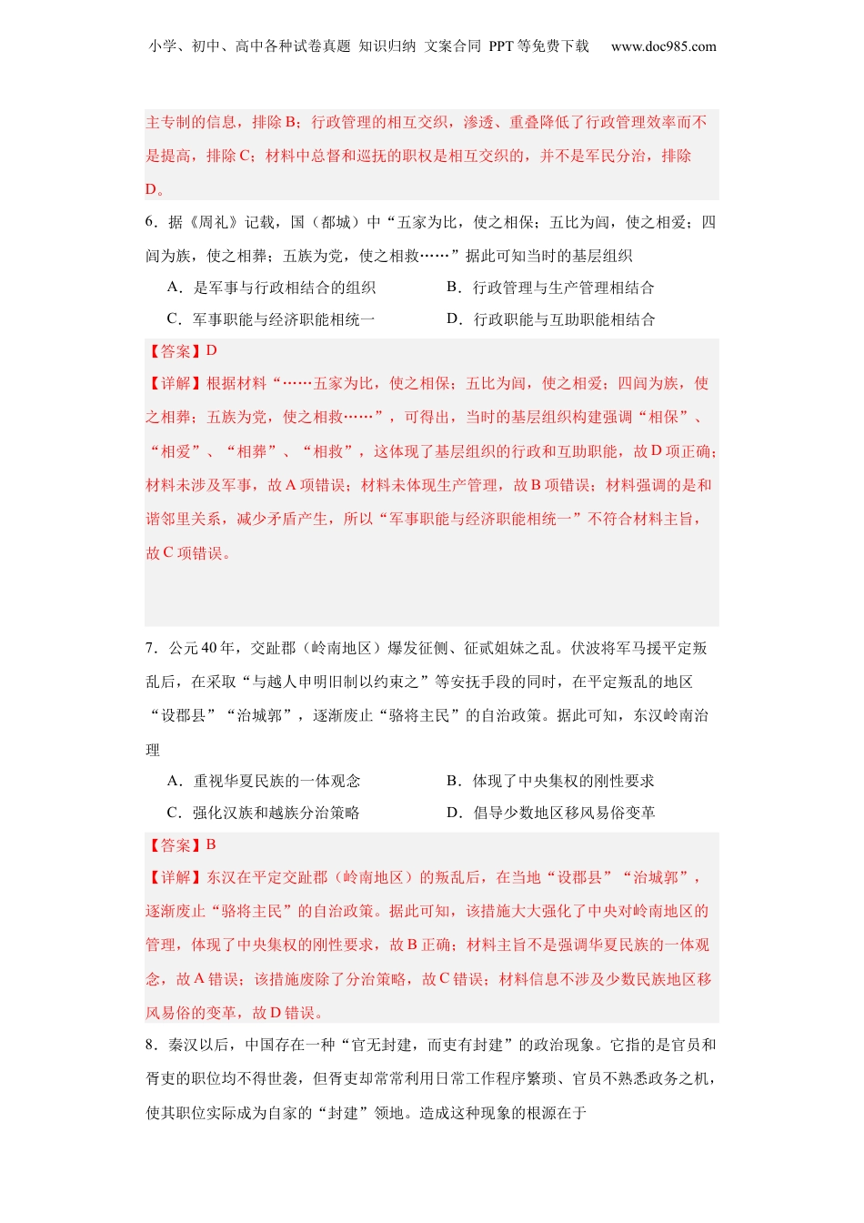 小学、初中、高中各种试卷真题知识归纳文案合同PPT等免费下载www.doc985.com政治类热点--古今中外行政管理制度--2024届高三历史统编版二轮复习1.1939年,国民党政府开始推行所谓“新县制”。据川、康、滇、黔、桂、闽、浙、院、鄂、赣、湘、陕、豫、甘、宁、青16省1942年底的总计,调整县政府1119个,区署1853个,建立乡镇公所3470个,保办公处.379681个,甲4118413个。这说明“新县制”意在A.巩固国民大革命成果B.加强对基层政权的控制C.削弱共产党地方实力D.抵制日本军事侵略扩张【答案】B【详解】依据材料信息可知,国民党政府推行“新县制”主要是为了加强对基层政权的管理和控制,故B项正确;国民革命的时间是1924—1927年,与题干时间不符,A项错误;抗战时期中国共产党统治区域主要为陕甘宁边区和华北敌后根据地,材料中“新县制”推行的省份不是主要针对共产党统治区域,C项错误;抵制日本军事控制主要依靠军队和人民的反侵略斗争,与推行“新县制”关系不大,D项错误。2.有学者在对中国古代政治总结时说,中国古代的政治制度最大的局限性在于它是一个统治性政权,不是一个发展性政权,更不是一个为国民共享的服务性政权。可见中国古代所有制度设计都围绕的一个核心是A.维护统一多民族国家主权B.维护专制主义的中央集权制度C.维护儒家思想的正统地位D.维护以“家天下”为核心的王权【答案】D【详解】根据材料信息“中国古代的政治制度最大的局限性在于它是一个统治性政权,不是一个发展性政权,更不是一个为国民共享的服务性政权”可得出学者认为古代政治不是为国民服务的政权,那反过来自然就是为皇家服务的,D项正确;材料中没有涉及统一多民族国家的内容,排除A项;材料体现的是古代社会的政权都是为王室服务的,排除B项;材料中没有涉及儒家思想,排除C项。3.中华人民共和国成立以来,户籍制度不断改革。1962年政府颁布《关于加强户口管理工作的意见》,1984年颁布《关于农民集镇落户问题的通知》,1985年颁布《关于城镇暂住人口管理的暂行规定》,1997年颁布《关于小城镇户籍改革试点方案》。这些改革的共同目的是为了小学、初中、高中各种试卷真题知识归纳文案合同PPT等免费下载www.doc985.comA.缩小城乡差别B.适应社会发展需要C.发展农村经济D.尽快提高城市化率【答案】B【详解】据题意可以看出,户籍制度不断改革意旨是在加强户籍管理,同时逐渐允许农民进入城镇落户,这适应了我国经济发展和城市化发展的需要,因此目的是适应社会发展需要,B项正确;AD不是户籍制度改革的根本目的,均排除;C项不能反映城市户籍改革的目的,排除。故选B项。【点睛】4.唐朝建立后,在地方控制体系上,分为正州和羁縻府州两大系统。正州县尽可能地实行统一的乡里制度,将民户纳入王朝国家的政治经济与社会控制体系中;而羁縻州则保留边疆地区固有的部族编制或其他固有的社会组织,通过其固有的社会组织方式维持其统治秩序。据此可知,唐朝的羁縻州A.为后来藩镇割据埋下了严重隐患B.本质上是因地制宜的社会管理模式C.尚未纳入国家政治经济控制体系D.实现了中央对边疆地区的直接管理【答案】B【详解】由材料信息“羁縻州则保留边疆地区固有的部族编制或其他固有的社会组织,通过其固有的社会组织方式维持其统治秩序”可知,羁縻州是唐代根据不同地区的政治、经济、社会环境与历史文化背景,而采取的不同的社会控制方式,即本质上是因地制宜的社会管理模式,故选B项;羁縻州的设置与后来的藩镇割据无关,故排除A项;羁縻州虽然保留边疆地区固有的部族编制或其他固有的社会组织,但仍然受到国家政治控制,故排除C项;D项体现的是正州的管理效果,故排除。5.在清代的地方行政管理体制中,巡抚主民政事务,总督主军事。但实际上,二者的职权具有相当的类似性,可以说是相互交织,彼此渗透,且有的督抚其辖地也有局部重叠。这一做法是为了A.打破权力垄断以加强中央集权B.加强君主专制以维护皇权独尊C.提高地方行政管理制度的效率D.军民分治以加强地方的独立性【答案】A【详解】从地方行政管理制度转变的角度看,从明代的三司体制到清代的督抚体制,统治者这样做...