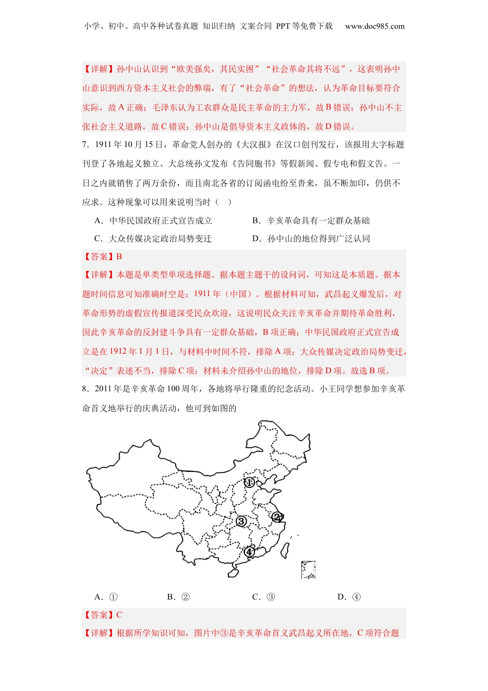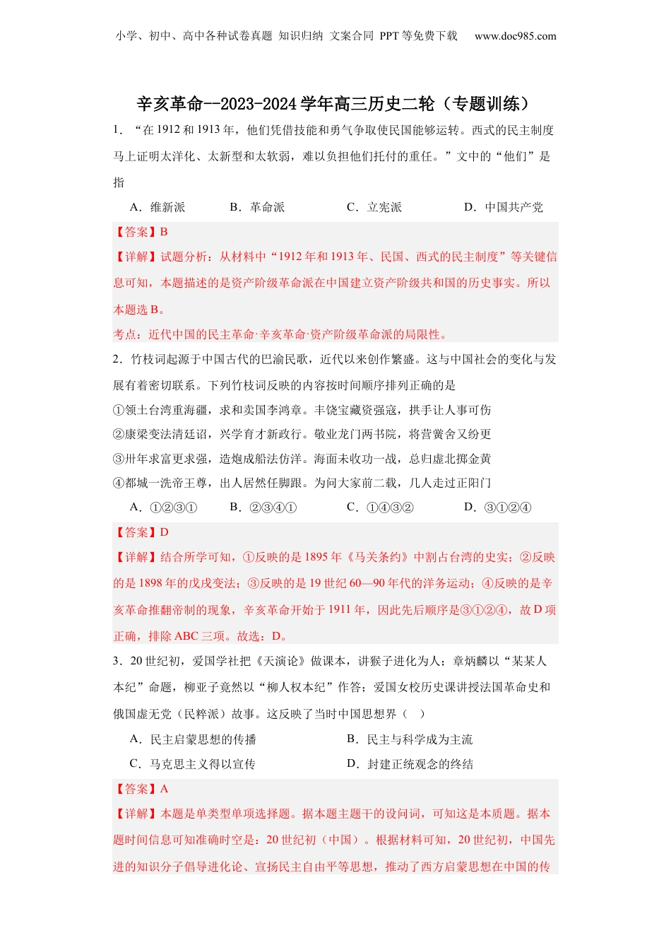 小学、初中、高中各种试卷真题知识归纳文案合同PPT等免费下载www.doc985.com辛亥革命--2023-2024学年高三历史二轮(专题训练)1.“在1912和1913年,他们凭借技能和勇气争取使民国能够运转。西式的民主制度马上证明太洋化、太新型和太软弱,难以负担他们托付的重任。”文中的“他们”是指A.维新派B.革命派C.立宪派D.中国共产党【答案】B【详解】试题分析:从材料中“1912年和1913年、民国、西式的民主制度”等关键信息可知,本题描述的是资产阶级革命派在中国建立资产阶级共和国的历史事实。所以本题选B。考点:近代中国的民主革命·辛亥革命·资产阶级革命派的局限性。2.竹枝词起源于中国古代的巴渝民歌,近代以来创作繁盛。这与中国社会的变化与发展有着密切联系。下列竹枝词反映的内容按时间顺序排列正确的是①领土台湾重海疆,求和卖国李鸿章。丰饶宝藏资强寇,拱手让人事可伤②康梁变法清廷诏,兴学育才新政行。敬业龙门两书院,将营黉舍又纷更③卅年求富更求强,造炮成船法仿洋。海面未收功一战,总归虚北掷金黄④都城一洗帝王尊,出人居然任脚跟。为问大家前二载,几人走过正阳门A.①②③①B.②③④①C.①④③②D.③①②④【答案】D【详解】结合所学可知,①反映的是1895年《马关条约》中割占台湾的史实;②反映的是1898年的戊戌变法;③反映的是19世纪60—90年代的洋务运动;④反映的是辛亥革命推翻帝制的现象,辛亥革命开始于1911年,因此先后顺序是③①②④,故D项正确,排除ABC三项。故选:D。3.20世纪初,爱国学社把《天演论》做课本,讲猴子进化为人;章炳麟以“某某人本纪”命题,柳亚子竟然以“柳人权本纪”作答;爱国女校历史课讲授法国革命史和俄国虚无党(民粹派)故事。这反映了当时中国思想界()A.民主启蒙思想的传播B.民主与科学成为主流C.马克思主义得以宣传D.封建正统观念的终结【答案】A【详解】本题是单类型单项选择题。据本题主题干的设问词,可知这是本质题。据本题时间信息可知准确时空是:20世纪初(中国)。根据材料可知,20世纪初,中国先进的知识分子倡导进化论、宣扬民主自由平等思想,推动了西方启蒙思想在中国的传小学、初中、高中各种试卷真题知识归纳文案合同PPT等免费下载www.doc985.com播,A项正确;当时民主科学思想正在滋长,但并不是思想界主流,排除B项;材料未体现马克思主义的传播,排除C项;当时封建正统思想受到冲击,但并没有终结,排除D项。故选A项。4.孙中山认为清政府已完全腐朽,“必须以一个新的政府代替旧的政府”。为此,他领导了()A.清末新政B.辛亥革命C.新文化运动D.国民革命【答案】B【详解】本题是单类型单项选择题。据本题主题干的设问词,可知这是正向题。据本题时间信息可知准确时空是:19世纪末20世纪初(中国)。根据材料并结合所学,孙中山主张运用革命手段推翻清朝封建统治,为此他领导了辛亥革命,建立了中华民国,B项正确;清末新政是清政府的“自救”运动,排除A项;1915年,以陈独秀等为代表的中国先进知识分子发动了反封建、倡导民主与科学的新文化运动,排除C项;国民革命运动的主要目标是推翻北洋军阀统治,排除D项。故选B项。5.1911年10月中旬,《时报》发表社论《哀哉制造革命之政府》,希冀清廷“知所悔悟”。11月初的社论《论国民今日不可存疑虑之见》宣称,“今日战衅已开,政府与国民决无并存之望”。这反映出A.《时报》的革命立场坚定B.民主共和观念深入人心C.民主革命浪潮难以阻挡D.传媒以救亡图存为己任【答案】C【详解】材料中的”希冀清廷,知所悔悟”“不可存疑虑”“政府与国民决无并存之”等信息反映出,时报的立场经历了从对清政府抱有希望到对清政府失望,再到支持革命的变化。《时报》的立场变化是当时革命形势的反映,即民主革命形势高涨,清政府在全国的统治土崩瓦解,C正确;《时报》的立场有变化,最初对清廷抱有幻想,排除A;民主共和观念深入人心是在辛亥革命以及中华民国颁布一系列文件之后出现的,排除B;题干并未反映出传媒救亡图存的救亡图存的责任,排除D。6.20世纪初,在对欧美社会认真考察后,孙中山认识到只有国家繁荣富强这一个目标是不够的,...