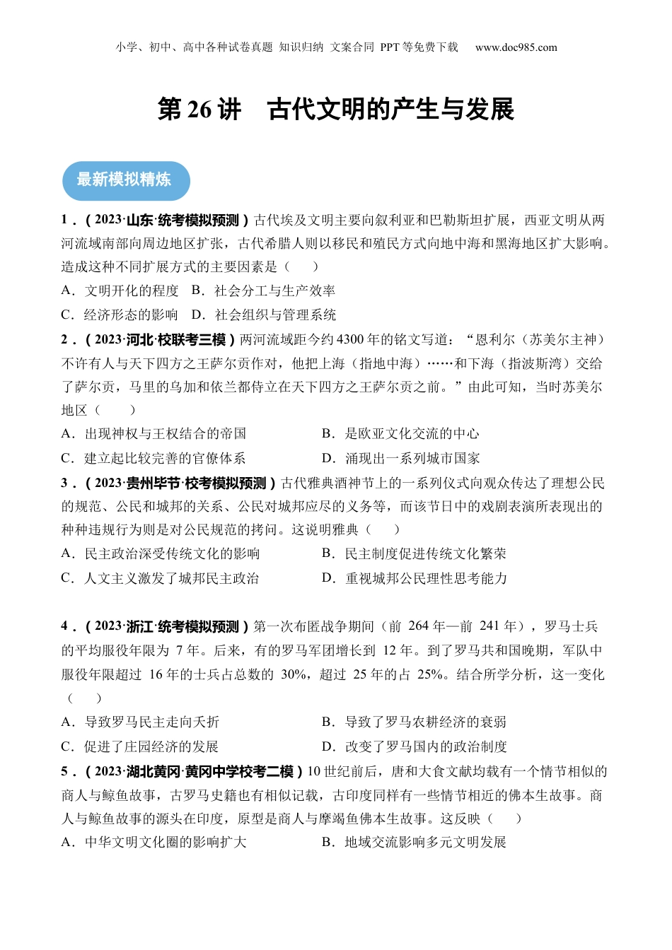 小学、初中、高中各种试卷真题知识归纳文案合同PPT等免费下载www.doc985.com第26讲古代文明的产生与发展1.(2023·山东·统考模拟预测)古代埃及文明主要向叙利亚和巴勒斯坦扩展,西亚文明从两河流域南部向周边地区扩张,古代希腊人则以移民和殖民方式向地中海和黑海地区扩大影响。造成这种不同扩展方式的主要因素是()A.文明开化的程度B.社会分工与生产效率C.经济形态的影响D.社会组织与管理系统2.(2023·河北·校联考三模)两河流域距今约4300年的铭文写道:“恩利尔(苏美尔主神)不许有人与天下四方之王萨尔贡作对,他把上海(指地中海)……和下海(指波斯湾)交给了萨尔贡,马里的乌加和依兰都侍立在天下四方之王萨尔贡之前。”由此可知,当时苏美尔地区()A.出现神权与王权结合的帝国B.是欧亚文化交流的中心C.建立起比较完善的官僚体系D.涌现出一系列城市国家3.(2023·贵州毕节·校考模拟预测)古代雅典酒神节上的一系列仪式向观众传达了理想公民的规范、公民和城邦的关系、公民对城邦应尽的义务等,而该节日中的戏剧表演所表现出的种种违规行为则是对公民规范的拷问。这说明雅典()A.民主政治深受传统文化的影响B.民主制度促进传统文化繁荣C.人文主义激发了城邦民主政治D.重视城邦公民理性思考能力4.(2023·浙江·统考模拟预测)第一次布匿战争期间(前264年—前241年),罗马士兵的平均服役年限为7年。后来,有的罗马军团增长到12年。到了罗马共和国晚期,军队中服役年限超过16年的士兵占总数的30%,超过25年的占25%。结合所学分析,这一变化()A.导致罗马民主走向夭折B.导致了罗马农耕经济的衰弱C.促进了庄园经济的发展D.改变了罗马国内的政治制度5.(2023·湖北黄冈·黄冈中学校考二模)10世纪前后,唐和大食文献均载有一个情节相似的商人与鲸鱼故事,古罗马史籍也有相似记载,古印度同样有一些情节相近的佛本生故事。商人与鲸鱼故事的源头在印度,原型是商人与摩竭鱼佛本生故事。这反映()A.中华文明文化圈的影响扩大B.地域交流影响多元文明发展最新模拟精炼小学、初中、高中各种试卷真题知识归纳文案合同PPT等免费下载www.doc985.comC.古代文明发展进程的共同性D.古代印度文明的引领性发展6.(2023·浙江·统考模拟预测)历法,是为了配合人们日常生活的需要,根据天象而制订的计算时间的方法。数千年来,世界各个地区创造了多姿多彩的文化,其中,历法也是一项重大的文化成就。下列古代文化中,发明了历法的是()①玛雅文化②古代印度③古代埃及④印加文化A.①②③B.①②④C.①③④D.②③④7.(2023·天津河西·天津市新华中学校考模拟预测)《天方夜谭》是一本阿拉伯民间故事集,其中有一则故事讲述了中国的男孩阿拉丁与邪恶的非洲魔法师斗智斗勇,最终取得神灯并成为国王的故事。这反映出()A.阿拉伯文化具有多元性B.阿拉伯文化具有统一性C.两河流域文明历代相承D.两河流域文明历史悠久8.(2023·安徽阜阳·安徽省临泉第一中学校考模拟预测)某学者认为,古代印度十进制带来的简便而精确的小数点计数法,刺激了古代阿拉伯数学家归纳出“代数”的数学运算方法和关系,这与古代希腊数学思想的几何风格大相径庭。该学者意在强调古代阿拉伯人()A.成为东西方文化交流的桥梁B.对数学的理解进入新阶段C.善于整合古代各个地域文明D.具有世界领先的技术成果9.(2023·广东东莞·校考三模)考古发现,古代两河流域居民通过观察牲畜内脏占卜(通称脏卜),出土的占卜文献中就有88%属于脏卜;古埃及人利用一些天象如日食,月食等进行占卜;玛雅人擅长预言和占卜,留下了很多非常准确的预言。这说明()A.占卜是每一个部族的必修课B.可以透视不同地区的人神关系C.人类文明发展交流具有共性D.是研究古代社会的第一手史料10.(2023·黑龙江哈尔滨·哈尔滨市第六中学校校考一模)阅读材料,完成下列要求。材料修昔底德全面继承并改进了希罗多德史学编纂方法,所著《伯罗奔尼撒战争史》被认为是古代史家“如实直书”的典范,受到近现代史家的一致肯定和推崇。修昔底德面对丰富多样、可信度参差不齐的史料,提出了自己处...