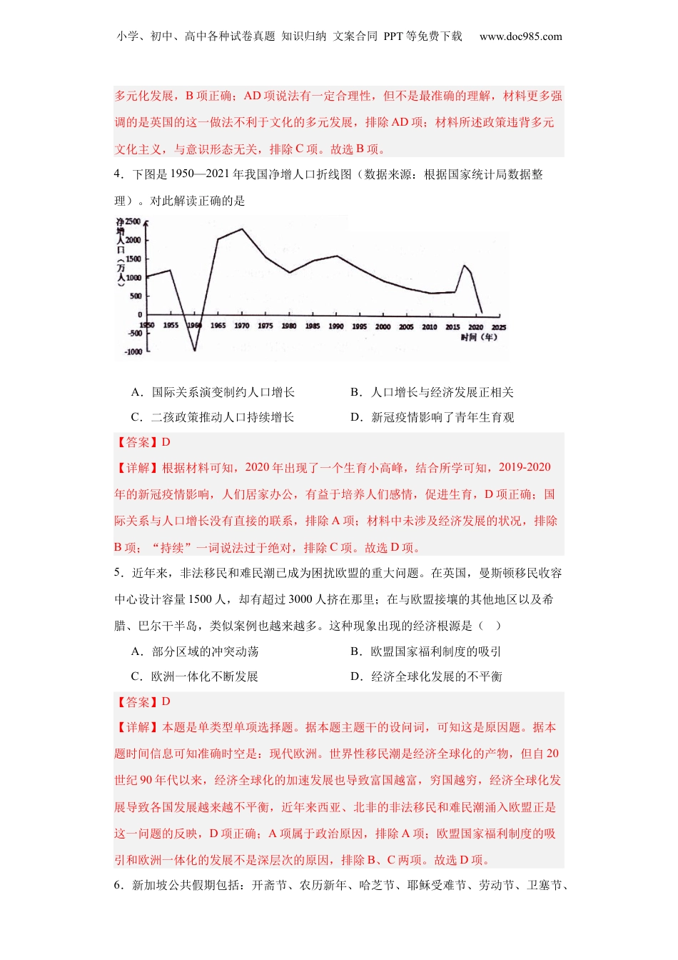 小学、初中、高中各种试卷真题知识归纳文案合同PPT等免费下载www.doc985.com现代社会的“移民”和多元文化专项练习--2024届高三历史统编版二轮复习1.下列各项中,对表格信息解读正确的是1927—1949年我国留学美国学生人数统计表年份男女性别未知总数19272335019302193117033242271935147353021219391044861581943158591921819477803407411941949672297471016A.《中苏友好同盟互助条约》签订,致使1949年留美人数减少B.《中美友好通商航海条约》签订,促进1947年留美人数剧增C.美国彻底走出经济大萧条以后,赴美留学生人数又开始回升D.赴美留学生人数变化趋势中,男女生呈现出同步变化的特征【答案】B【详解】根据材料及所学知识可知,《中美友好通商航海条约》的签订,国民党和美国关系密切,促进1947年留美人数剧增,B项正确;《中苏友好同盟互助条约》于小学、初中、高中各种试卷真题知识归纳文案合同PPT等免费下载www.doc985.com1950年2月14日签订,同年4月11日起生效,排除A项;抗战期间及以后,国民党和美国关系密切,因此赴美留学生人数又开始回升,排除C项;根据材料可知,1931—1939年,男留学生的数量不断下降,女留学生的数量不断上升,因此,两者并不同步变化,排除D项。故选B项。2.下图为1985—2000年中国东西部迁入人口占全国迁移总人口的比例(%)。这反映了当时()A.东部地区经济发展比较快B.西部地区总人口连年下降C.东西部经济发展基本平衡D.东西部工业布局趋于合理【答案】A【详解】根据材料柱状图可知,东部迁入人口占全国迁移总人口的比例(%)逐年增加并且远远大于西部迁入人口占全国迁移总人口的比例,说明东部地区经济发展比较快,A项正确;材料反映的是迁入人口,看不出总人口的变化,排除B项;东西部迁入人口占全国迁移总人口的比例差距大,体现不出经济发展基本平衡,排除C项;材料体现不出工业布局,排除D项。故选A项。3.大英帝国在解体后的很长一段时间内依然持有一种帝国情结,总是以帝国的视角审视本国(公民)与他国(公民)的关系。英国通过通婚等形式实现外来移民的“血统改造”,使其放弃对母国的归属感与认同感,成为真正的“英国人”。对英国此举理解最准确的是()A.稳定了英国的社会秩序B.违背了文化多元主义原则C.反映了意识形态的分歧D.维护了民族文化的优越性【答案】B【详解】本题是单类型单项选择题。据本题主题干的设问词,可知这是正向题。据本题时间信息可知准确时空是:现代(英国)。据本题材料概括得出主要结论是:由材料中“通过通婚等形式实现外来移民的'血统改造',使其放弃对母国的归属感与认同感,成为真正的‘英国人’”可知,英国对外来移民持歧视排斥的态度,这不利于文化的小学、初中、高中各种试卷真题知识归纳文案合同PPT等免费下载www.doc985.com多元化发展,B项正确;AD项说法有一定合理性,但不是最准确的理解,材料更多强调的是英国的这一做法不利于文化的多元发展,排除AD项;材料所述政策违背多元文化主义,与意识形态无关,排除C项。故选B项。4.下图是1950—2021年我国净增人口折线图(数据来源:根据国家统计局数据整理)。对此解读正确的是A.国际关系演变制约人口增长B.人口增长与经济发展正相关C.二孩政策推动人口持续增长D.新冠疫情影响了青年生育观【答案】D【详解】根据材料可知,2020年出现了一个生育小高峰,结合所学可知,2019-2020年的新冠疫情影响,人们居家办公,有益于培养人们感情,促进生育,D项正确;国际关系与人口增长没有直接的联系,排除A项;材料中未涉及经济发展的状况,排除B项;“持续”一词说法过于绝对,排除C项。故选D项。5.近年来,非法移民和难民潮已成为困扰欧盟的重大问题。在英国,曼斯顿移民收容中心设计容量1500人,却有超过3000人挤在那里;在与欧盟接壤的其他地区以及希腊、巴尔干半岛,类似案例也越来越多。这种现象出现的经济根源是()A.部分区域的冲突动荡B.欧盟国家福利制度的吸引C.欧洲一体化不断发展D.经济全球化发展的不平衡【答案】D【详解】本题是单类型单项选择题。据本题主题干的设问词,可知这是原因题。据本题时间信息可知准确...