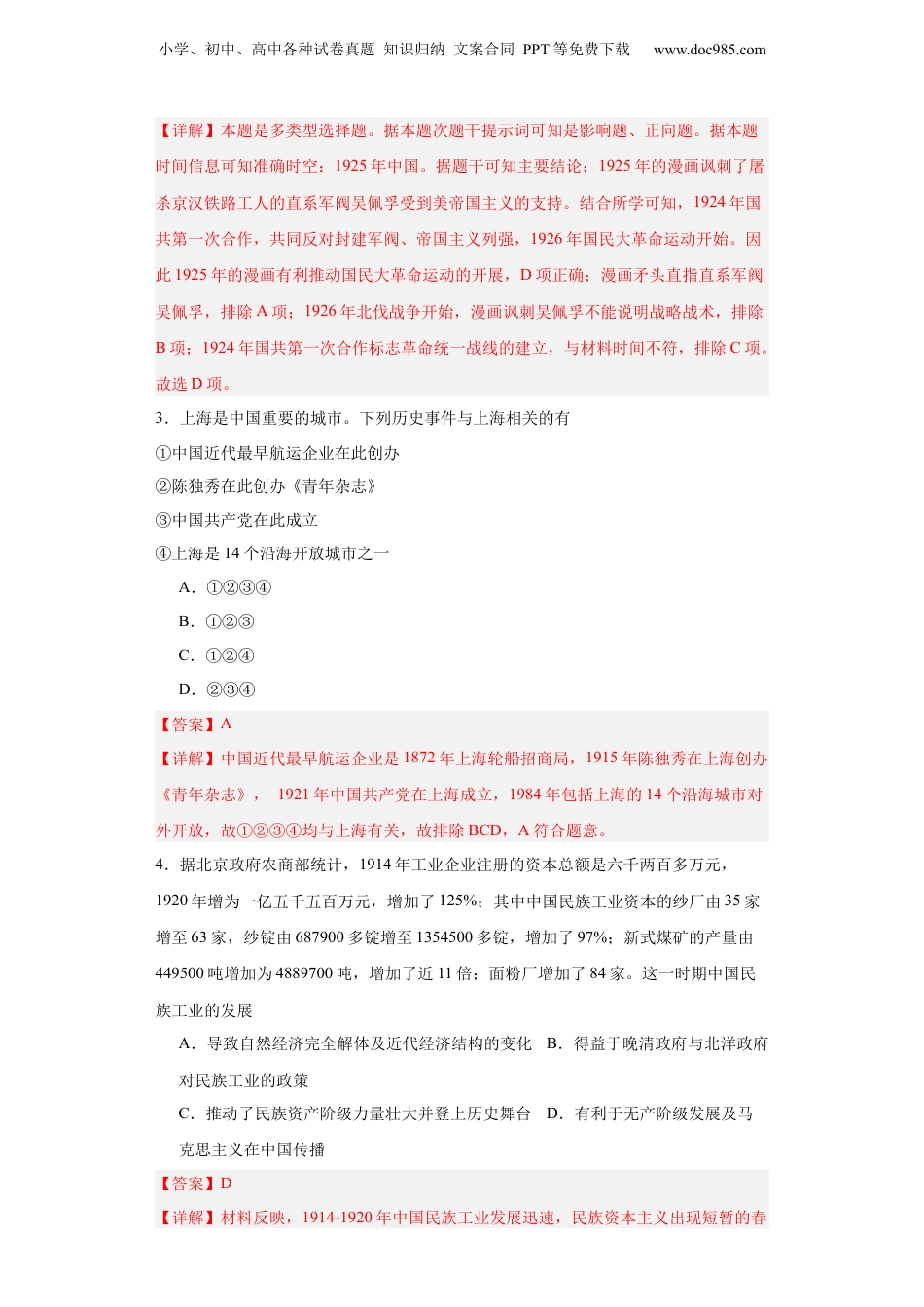 小学、初中、高中各种试卷真题知识归纳文案合同PPT等免费下载www.doc985.com五四运动与中国共产党的诞生--2023-2024学年高三历史二轮(专题训练)1.1919年12月,胡适在《新青年》上发表《新思潮的意义》一文,提出了“研究问题,输入学理,整理国故,再造文明”的主张。胡适的这一主张A.是对五四新文化运动的反思B.反映中西文化矛盾的激化C.促进了新思想的进一步传播D.具有全盘西化的思想倾向【答案】A【详解】依据材料“研究问题,输入学理,整理国故,再造文明”可知胡适在五四之后对本国文化和外来文化的反思,A项正确;“激化”表述错误,排除B项;材料未涉及作用,排除C项;“全盘西化”表述错误,排除D项。故选A项。2.如图是漫画家玄生于1925年发表的漫画《帝国主义和军阀原形写真》,右上角题字:有钱有势的美国人。他左手举着一把剑,右手拉着一根链子,链子的另一头套着被画成狗的军阀形象,写明是“屠杀京汉路工人的吴佩孚”。该漫画()A.矛头直指奉系军阀张作霖B.指明了北伐战争的战略战术C.促进革命统一战线的建立D.助推国民大革命运动的开展【答案】D小学、初中、高中各种试卷真题知识归纳文案合同PPT等免费下载www.doc985.com【详解】本题是多类型选择题。据本题次题干提示词可知是影响题、正向题。据本题时间信息可知准确时空:1925年中国。据题干可知主要结论:1925年的漫画讽刺了屠杀京汉铁路工人的直系军阀吴佩孚受到美帝国主义的支持。结合所学可知,1924年国共第一次合作,共同反对封建军阀、帝国主义列强,1926年国民大革命运动开始。因此1925年的漫画有利推动国民大革命运动的开展,D项正确;漫画矛头直指直系军阀吴佩孚,排除A项;1926年北伐战争开始,漫画讽刺吴佩孚不能说明战略战术,排除B项;1924年国共第一次合作标志革命统一战线的建立,与材料时间不符,排除C项。故选D项。3.上海是中国重要的城市。下列历史事件与上海相关的有①中国近代最早航运企业在此创办②陈独秀在此创办《青年杂志》③中国共产党在此成立④上海是14个沿海开放城市之一A.①②③④B.①②③C.①②④D.②③④【答案】A【详解】中国近代最早航运企业是1872年上海轮船招商局,1915年陈独秀在上海创办《青年杂志》,1921年中国共产党在上海成立,1984年包括上海的14个沿海城市对外开放,故①②③④均与上海有关,故排除BCD,A符合题意。4.据北京政府农商部统计,1914年工业企业注册的资本总额是六千两百多万元,1920年增为一亿五千五百万元,增加了125%;其中中国民族工业资本的纱厂由35家增至63家,纱锭由687900多锭增至1354500多锭,增加了97%;新式煤矿的产量由449500吨增加为4889700吨,增加了近11倍;面粉厂增加了84家。这一时期中国民族工业的发展A.导致自然经济完全解体及近代经济结构的变化B.得益于晚清政府与北洋政府对民族工业的政策C.推动了民族资产阶级力量壮大并登上历史舞台D.有利于无产阶级发展及马克思主义在中国传播【答案】D【详解】材料反映,1914-1920年中国民族工业发展迅速,民族资本主义出现短暂的春小学、初中、高中各种试卷真题知识归纳文案合同PPT等免费下载www.doc985.com天,无产阶级队伍因此得到壮大,这为马克思主义在中国传播奠定了阶级基础,故选D;自然经济在近代中国仍然占主导,排除A;这一时期民族工业发展迅速主要原因是一战期间列强暂时放松了对中国的经济侵略,排除B;戊戌变法是民族资产阶级力量壮大并登上历史舞台的表现,C时间不符合题意,排除。【点睛】5.1925年1月,中共党员人数为994人,10月增至3000人,年底发展到10000人。这一时期中共人数快速增加的原因是A.共产国际的大力支持B.革命根据地的创建C.土地革命高潮的兴起D.国民革命迅速发展【答案】D【分析】试题分析:材料提供的时间是1925年一年内的中共党员人数变化,此时正处于国民大革命时期,由于革命的开展,中共的影响得到扩大,因而吸收党员人数迅速增加。故D正确。考点:中国民主革命的转折•国共合作与北伐战争•北伐战争的开始及成果。【详解】6.1922年5月初,中国共产党在广州召开了第一次全国劳动大会,参加大会的代表共162人,代表12个城...