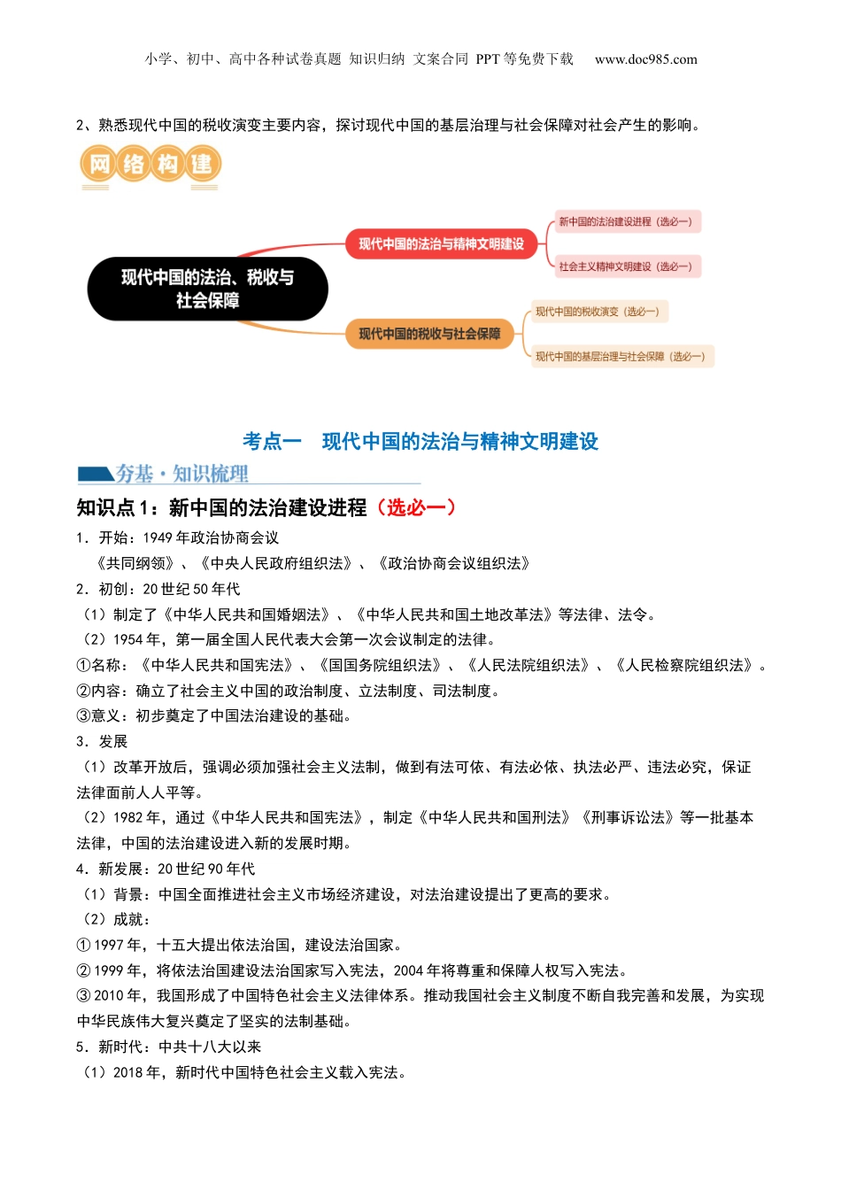 小学、初中、高中各种试卷真题知识归纳文案合同PPT等免费下载www.doc985.com专题八中国现代史:选择性必修(贯通部分)第25讲:现代中国的法治、税收与社会保障目录考情分析复习目标网络构建梳理预测考点一现代中国的法治与精神文明建设【夯基·知识梳理】知识点1新中国的法治建设进程(选必一)知识点2社会主义精神文明建设(选必一)【提升·考向预测】考向1社会主义精神文明建设考点二现代中国的税收与社会保障【夯基·知识梳理】知识点1现代中国的税收演变(选必一)知识点2现代中国的基层治理与社会保障(选必一)【提升·考向预测】考向1现代社会保障制度的建立与发展真题感悟考点要求考题统计考情分析社会主义精神文明建设2022天津卷选择题,3分这部分内容是新增考点,和政治时事贴合紧密,复习时重点关注。现代社会保障制度的建立与发展2022海南卷非选择题,15分往年也有涉及,但多数集中在古代社会保障和基层治理方面,现代内容涉及少,但是也属于复习重点。1、理解新中国的法治建设进程内容,了解社会主义精神文明建设影响。小学、初中、高中各种试卷真题知识归纳文案合同PPT等免费下载www.doc985.com2、熟悉现代中国的税收演变主要内容,探讨现代中国的基层治理与社会保障对社会产生的影响。考点一现代中国的法治与精神文明建设知识点1:新中国的法治建设进程(选必一)1.开始:1949年政治协商会议《共同纲领》、《中央人民政府组织法》、《政治协商会议组织法》2.初创:20世纪50年代(1)制定了《中华人民共和国婚姻法》、《中华人民共和国土地改革法》等法律、法令。(2)1954年,第一届全国人民代表大会第一次会议制定的法律。①名称:《中华人民共和国宪法》、《国国务院组织法》、《人民法院组织法》、《人民检察院组织法》。②内容:确立了社会主义中国的政治制度、立法制度、司法制度。③意义:初步奠定了中国法治建设的基础。3.发展(1)改革开放后,强调必须加强社会主义法制,做到有法可依、有法必依、执法必严、违法必究,保证法律面前人人平等。(2)1982年,通过《中华人民共和国宪法》,制定《中华人民共和国刑法》《刑事诉讼法》等一批基本法律,中国的法治建设进入新的发展时期。4.新发展:20世纪90年代(1)背景:中国全面推进社会主义市场经济建设,对法治建设提出了更高的要求。(2)成就:①1997年,十五大提出依法治国,建设法治国家。②1999年,将依法治国建设法治国家写入宪法,2004年将尊重和保障人权写入宪法。③2010年,我国形成了中国特色社会主义法律体系。推动我国社会主义制度不断自我完善和发展,为实现中华民族伟大复兴奠定了坚实的法制基础。5.新时代:中共十八大以来(1)2018年,新时代中国特色社会主义载入宪法。小学、初中、高中各种试卷真题知识归纳文案合同PPT等免费下载www.doc985.com(2)2020年,通过新中国第一部《民法典》。①中共十八大以来,党领导人民全面依法治国,加强宪法实施和监督,维护宪法权威;推进科学立法、民主立法、依法立法,以良法促进发展、保障善治。②我国切实贯彻落实科学立法、严格执法、公正司法、全民守法的依法治国方针,推进国家治理体系和治理能力现代化,全面依法治国进入一个新阶段。知识点2:社会主义精神文明建设(选必一)1.社会主义革命和建设时期(1)背景:百废待兴、物质匮乏;人民当家作主;中国人民发扬英勇奋斗的革命传统和艰苦奋斗的精神。(2)榜样:全国劳动模范孟泰、时传祥,“铁人”王进喜,党的好干部焦裕禄,解放军好战士雷锋,科学家李四光、华罗庚等是杰出代表。(3)内容:①道德风尚:英勇(艰苦)奋斗,健康向上。②政治氛围:热爱党、热爱社会主义。③行动准则:关心集体、无私奉献、全心全意为人民服务。④新型人际关系:互相关心、互相爱护、互相帮助。2.改革开放以后(1)20世纪80年代:中共中央颁布有关加强社会主义精神文明建设指导方针的决议,号召并鼓励开展群众性精神文明创建活动。讲文明、讲礼貌、讲卫生、讲秩序、讲道德,心灵美、语言美、行为美、环境美,热爱祖国、热爱社会主义、热爱中国共产党,即“五讲四美三热爱”,是20世纪80年代群众性...