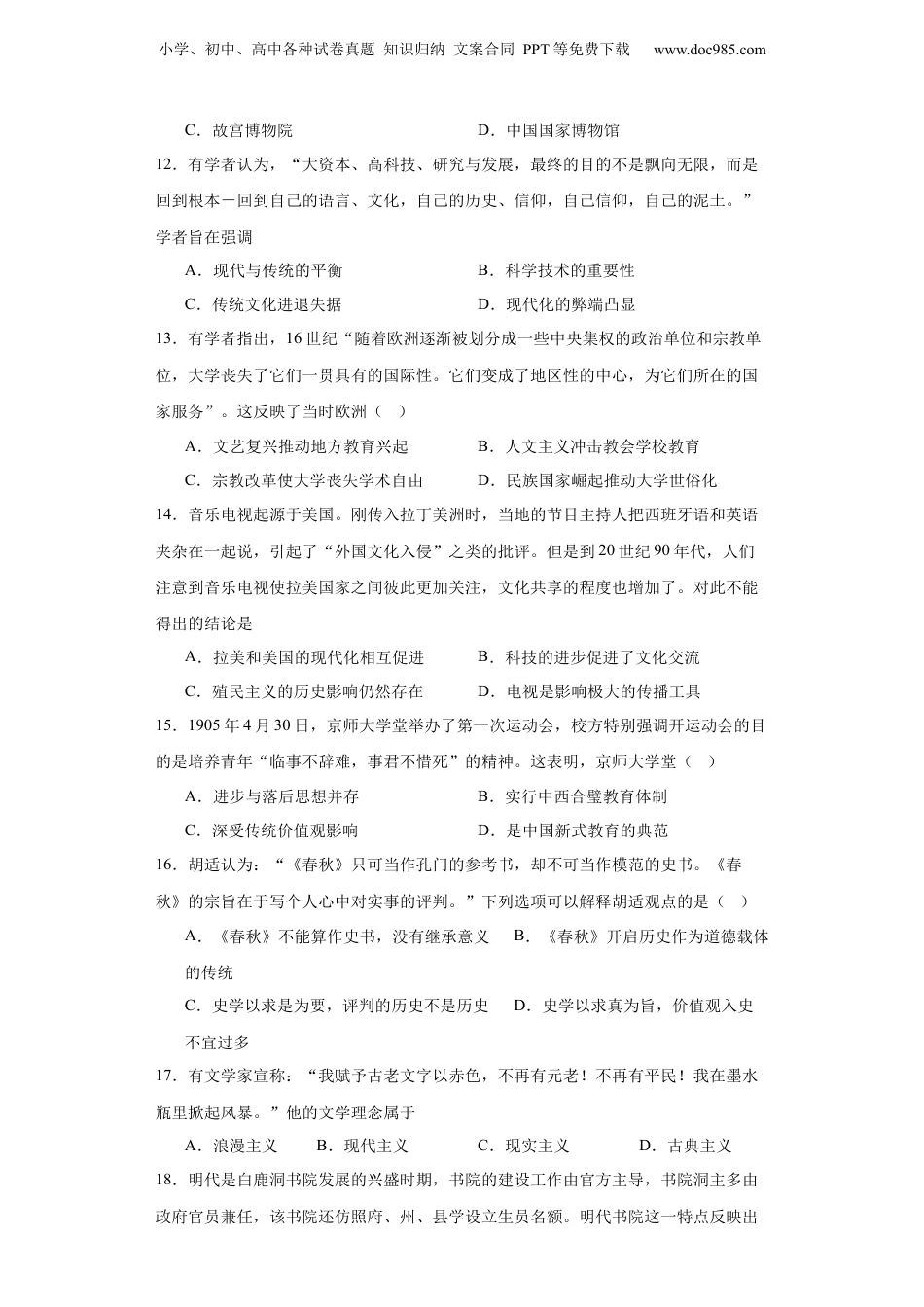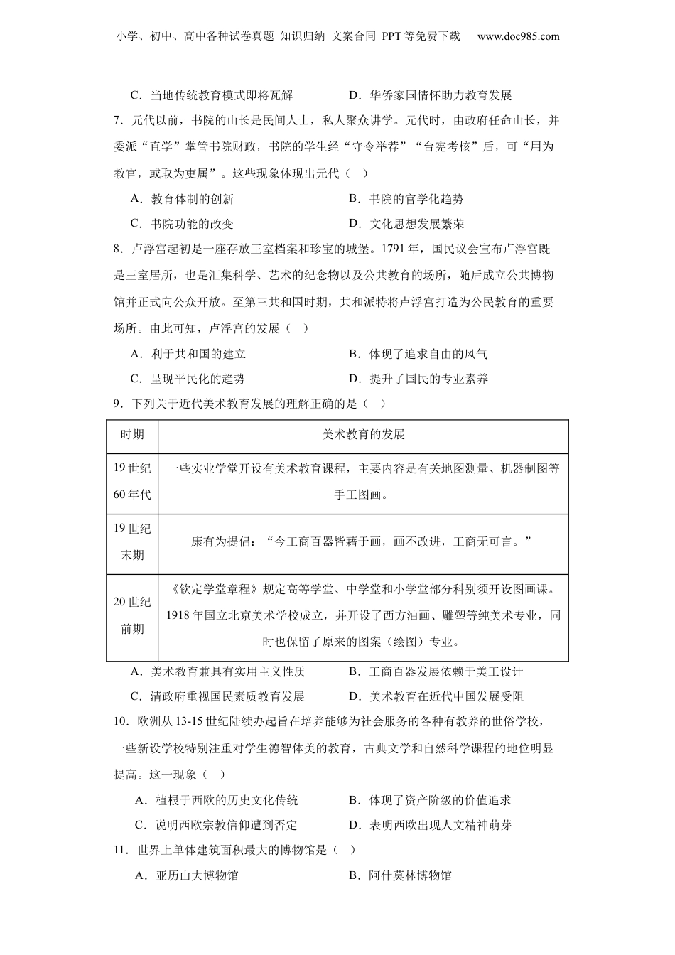 小学、初中、高中各种试卷真题知识归纳文案合同PPT等免费下载www.doc985.com文化传承的多种载体及其发展--2024届高三历史统编版二轮复习1.2021年12月,国家博物馆举办“中国古代饮食文化展”,展出精选文物240余件,涉及食材、器具、技艺、礼仪等诸多方面,呈现出中国古代饮食文化的历史变迁。据此可知,博物馆的功能在于()A.刺激旅游消费的发展B.引导民众转变生活观念C.担负文化传播的使命D.推动学术研究活动开展2.公元前280年左右,古埃及托勒密王朝建成亚历山大博物馆,资助学者进行科学研究和教育活动);并出版荷马、欧几里得和索福克勒斯等学者的著作。亚历山大博物馆的设立有利于()A.保护自然遗产B.传承希腊文化C.推动科学革命D.促进启蒙运动3.秘书监是中国古代中央政府设立的用以收藏、管理和编辑图书典籍的机构。元代秘书监作为中央图籍典藏和文化管理机构,以典藏职能为核心,逐渐形成编修史志、文化监管、司天育才等其他外延职能,是元代民族文化交融和历史文化发展的集中体现。以下关于元代秘书监的结论由材料无法得出的是()A.藏书规模元代最盛B.它是元代民族交融在文化上的反映C.典藏是其核心职能D.政府对思想文化的控制比较严格4.20世纪初,张謇创办了中国第一所公共博物馆——南通博物苑,苑内二楼半圆型的月台上,悬挂着张謇手书的一副著名对联:“设为庠序学校以教,多识鸟兽草木之名。”该对联的宗旨是()A.以实业教育为国育才B.传承中华传统文化C.致力于普及科学知识D.抵制外来文化入侵5.“从人才培养来看,中世纪大学在很大程度上是职业性学校。它们训练学生掌握一定的知识,以后从事法律、医学、教学这些世俗专业或献身教会工作所用。”材料反映了中世纪大学()A.具有实用主义的色彩B.是西欧社会普遍的文化符号C.与现代大学完全相似D.逐渐倾向于世俗化和商业化6.晚清民国时期,由于梅州市松口镇华侨踊跃捐资助学,当地学校不但收费低廉,甚至免费并聘请名师硕儒或留洋归来的学子做老师,出现了“乡村虽偏僻,但无一二里无童声”的盛况。据此可知A.当地教育经费问题得以解决B.科举制瓦解有利于教育革新小学、初中、高中各种试卷真题知识归纳文案合同PPT等免费下载www.doc985.comC.当地传统教育模式即将瓦解D.华侨家国情怀助力教育发展7.元代以前,书院的山长是民间人士,私人聚众讲学。元代时,由政府任命山长,并委派“直学”掌管书院财政,书院的学生经“守令举荐”“台宪考核”后,可“用为教官,或取为吏属”。这些现象体现出元代()A.教育体制的创新B.书院的官学化趋势C.书院功能的改变D.文化思想发展繁荣8.卢浮宫起初是一座存放王室档案和珍宝的城堡。1791年,国民议会宣布卢浮宫既是王室居所,也是汇集科学、艺术的纪念物以及公共教育的场所,随后成立公共博物馆并正式向公众开放。至第三共和国时期,共和派特将卢浮宫打造为公民教育的重要场所。由此可知,卢浮宫的发展()A.利于共和国的建立B.体现了追求自由的风气C.呈现平民化的趋势D.提升了国民的专业素养9.下列关于近代美术教育发展的理解正确的是()时期美术教育的发展19世纪60年代一些实业学堂开设有美术教育课程,主要内容是有关地图测量、机器制图等手工图画。19世纪末期康有为提倡:“今工商百器皆藉于画,画不改进,工商无可言。”20世纪前期《钦定学堂章程》规定高等学堂、中学堂和小学堂部分科别须开设图画课。1918年国立北京美术学校成立,并开设了西方油画、雕塑等纯美术专业,同时也保留了原来的图案(绘图)专业。A.美术教育兼具有实用主义性质B.工商百器发展依赖于美工设计C.清政府重视国民素质教育发展D.美术教育在近代中国发展受阻10.欧洲从13-15世纪陆续办起旨在培养能够为社会服务的各种有教养的世俗学校,一些新设学校特别注重对学生德智体美的教育,古典文学和自然科学课程的地位明显提高。这一现象()A.植根于西欧的历史文化传统B.体现了资产阶级的价值追求C.说明西欧宗教信仰遭到否定D.表明西欧出现人文精神萌芽11.世界上单体建筑面积最大的博物馆是()A.亚历山大博物馆B.阿什莫林博物馆小学、初中、高中...