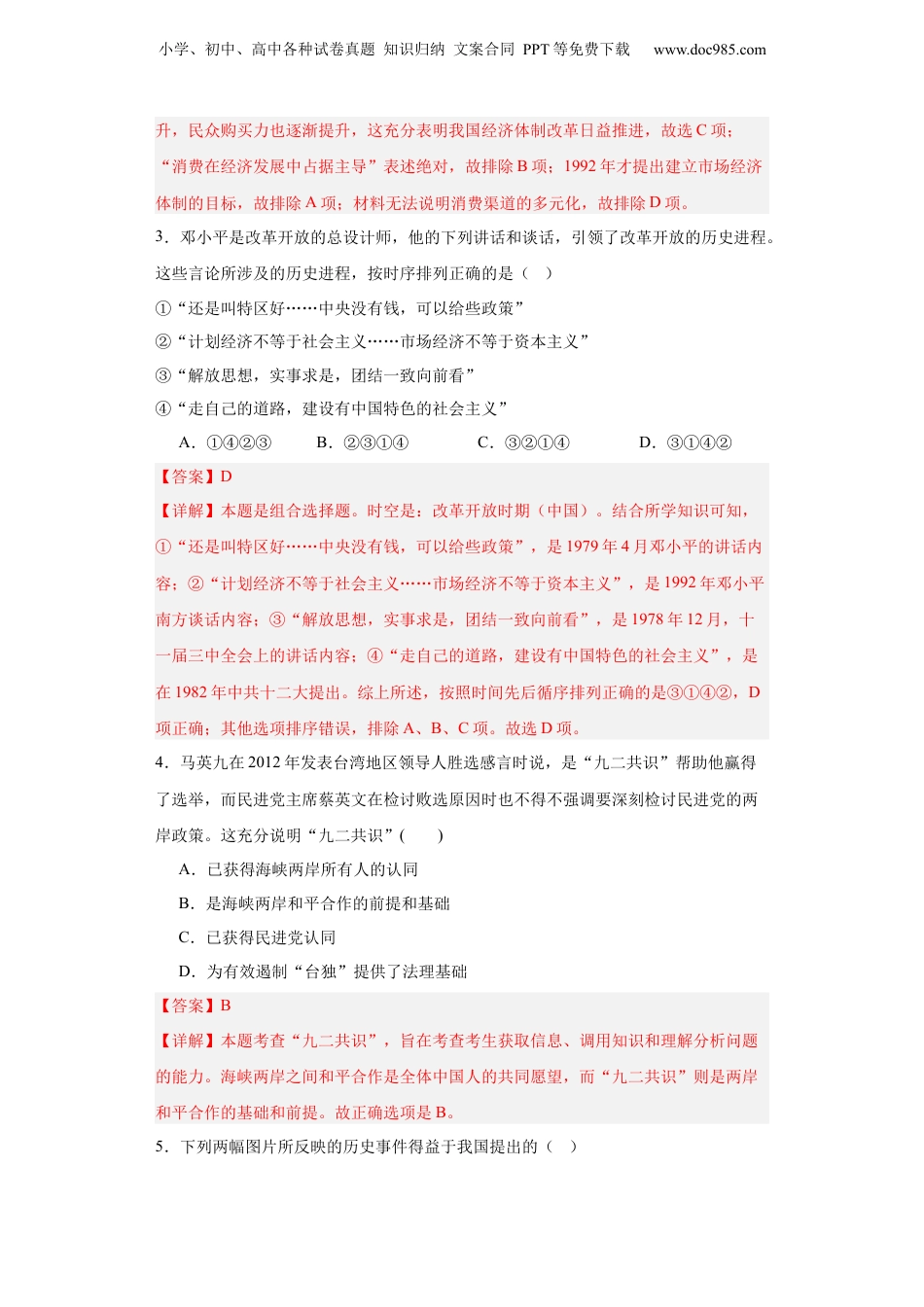 小学、初中、高中各种试卷真题知识归纳文案合同PPT等免费下载www.doc985.com改革开放和社会主义现代化建设的巨大成就专项练习--2024届高三历史统编版二轮复习1.下图为2006、2019年中国经济相关数据示意图(单位:%)。两者数据的变化主要反映了中国()A.外贸质量的提升B.生产总值的飞跃C.经济模式的转变D.产业结构的调整【答案】C【详解】由材料信息可知,相比于2006年,2019年中国的经济总量在世界经济总量中的比重不断上升,而出口额在中国国内生产总值的比重却在降低,说明这段时间内,中国经济的发展对外贸的依赖在逐步降低,说明中国经济由出口拉动向内需拉动转变,实现了经济发展模式的转变,经济结构不断优化,经济效益不断提高,C项正确;材料显示我国外贸在国内生产总值中的比重降低,但没体现出外贸质量的变化,排除A项;生产总值的飞跃,这是对材料的片面解读,排除B项;由材料信息看不出我国产业结构的调整状况,排除D项。故选C项。2.1978~2016年,消费对我国国内生产总值增长贡献率由38.3%上升至64.6%;社会消费品零售总额也一路攀升,从15586亿元上升至3323163亿元。这表明改革开放后我国A.市场经济体制活力不断增强B.消费在经济发展中占据导C.经济体制改革取得显著成效D.国内居民消费渠道日渐多元【答案】C【详解】本题考查改革开放后中国的经济体制改革成效,考查学生获取和解读材料信息的能力。由材料可知,1978~2016年,消费对国内生产总值增长贡献率大幅度提升,社会消费品零售总额一路攀升,这说明改革开放以来,我国社会经济发展水平不断提小学、初中、高中各种试卷真题知识归纳文案合同PPT等免费下载www.doc985.com升,民众购买力也逐渐提升,这充分表明我国经济体制改革日益推进,故选C项;“消费在经济发展中占据主导”表述绝对,故排除B项;1992年才提出建立市场经济体制的目标,故排除A项;材料无法说明消费渠道的多元化,故排除D项。3.邓小平是改革开放的总设计师,他的下列讲话和谈话,引领了改革开放的历史进程。这些言论所涉及的历史进程,按时序排列正确的是()①“还是叫特区好……中央没有钱,可以给些政策”②“计划经济不等于社会主义……市场经济不等于资本主义”③“解放思想,实事求是,团结一致向前看”④“走自己的道路,建设有中国特色的社会主义”A.①④②③B.②③①④C.③②①④D.③①④②【答案】D【详解】本题是组合选择题。时空是:改革开放时期(中国)。结合所学知识可知,①“还是叫特区好……中央没有钱,可以给些政策”,是1979年4月邓小平的讲话内容;②“计划经济不等于社会主义……市场经济不等于资本主义”,是1992年邓小平南方谈话内容;③“解放思想,实事求是,团结一致向前看”,是1978年12月,十一届三中全会上的讲话内容;④“走自己的道路,建设有中国特色的社会主义”,是在1982年中共十二大提出。综上所述,按照时间先后循序排列正确的是③①④②,D项正确;其他选项排序错误,排除A、B、C项。故选D项。4.马英九在2012年发表台湾地区领导人胜选感言时说,是“九二共识”帮助他赢得了选举,而民进党主席蔡英文在检讨败选原因时也不得不强调要深刻检讨民进党的两岸政策。这充分说明“九二共识”()A.已获得海峡两岸所有人的认同B.是海峡两岸和平合作的前提和基础C.已获得民进党认同D.为有效遏制“台独”提供了法理基础【答案】B【详解】本题考查“九二共识”,旨在考查考生获取信息、调用知识和理解分析问题的能力。海峡两岸之间和平合作是全体中国人的共同愿望,而“九二共识”则是两岸和平合作的基础和前提。故正确选项是B。5.下列两幅图片所反映的历史事件得益于我国提出的()小学、初中、高中各种试卷真题知识归纳文案合同PPT等免费下载www.doc985.com中英香港政权交接仪式中葡澳门政权交接仪式A.民族区域自治制度B.和平共处五项原则C.对外开放的政策D.“一国两制”的构想【答案】D【详解】两幅图片反映的历史事件是中国政府解决历史遗留问题的成功范例,20世纪九十年代末我国先后收回了香港、澳门的主权管理,这是“一国两制”构想的成功实践,D项正确;民族区域自治制度是针对少...