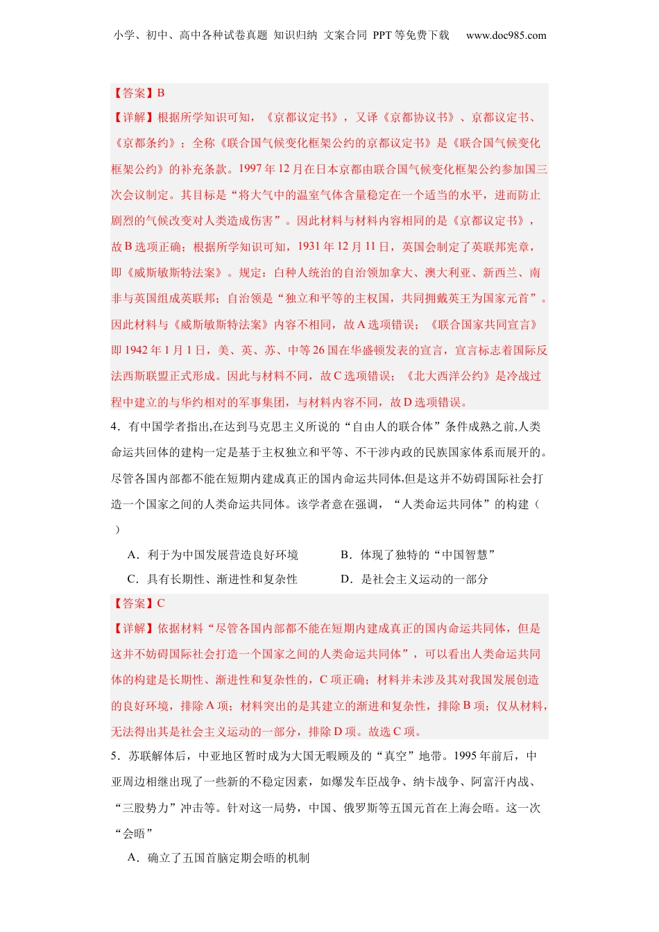 小学、初中、高中各种试卷真题知识归纳文案合同PPT等免费下载www.doc985.com当代世界发展的特点与主要趋势--2023-2024学年高三历史二轮(专题训练)1.德国学者乌尔里希贝克描述了一种现象:很有趣的一点是,如今谁都以为自己是全球化的受害者,包括美国人自己;其他地方的人说我们在美国化,美国人则说他们在欧洲化。这表明经济全球化时代A.民族主义成为全球化制约因素B.世界各国的民族属性日趋消失C.区域集团化阻碍全球化的发展D.世界经济发展趋向于合理平衡【答案】A【详解】从材料“如今谁都以为自己是全球化的受害者,包括美国人自己”可以看出每一个国家都是站在自身的立场和角度来分析和评价全球化,体现了民族主义是全球化的制约因素,故A项正确;B项说法错误,错在“日趋消失”;C项错误,区域集团化和经济全球化相互推动;世界经济发展的差距不断加大,故D项错误。2.学者们评论某一时期的欧洲,使用了“欧洲的末日审判”“欧洲的政治崩溃”“欧洲时代的消失”“别了,欧洲历史”等标题。据此判断,欧洲的这一时期开始于()A.20世纪30年代初B.20世纪40年代中期C.20世纪70年代初D.20世纪80年代末【答案】B【详解】试题分析:尊重材料是做对历史题目的唯一秘籍。而通过材料并结合所学知识不难发现,本题考查学生对二战后欧洲的理解.由“欧洲的末日审判”、“欧洲的政治崩溃”、“欧洲时代的消失”、“别了,欧洲历史”得知是二战后欧洲的普遍衰落,美国经济实力最强.其它是错误的.所以选B.考点:第二次世界大战后世界政治格局的演变•美苏两极对峙格局的形成•二战后欧洲的普遍衰落3.2015年11月30日,以“环境与可持续发展”为主题的第二十一届联合国气候变化巴黎大会开幕。以下内容与该会议主题相同的文件是A.《威斯敏斯特法案》B.《京都议定书》C.《联合国家宣言》D.《北大西洋公约》小学、初中、高中各种试卷真题知识归纳文案合同PPT等免费下载www.doc985.com【答案】B【详解】根据所学知识可知,《京都议定书》,又译《京都协议书》、京都议定书、《京都条约》;全称《联合国气候变化框架公约的京都议定书》是《联合国气候变化框架公约》的补充条款。1997年12月在日本京都由联合国气候变化框架公约参加国三次会议制定。其目标是“将大气中的温室气体含量稳定在一个适当的水平,进而防止剧烈的气候改变对人类造成伤害”。因此材料与材料内容相同的是《京都议定书》,故B选项正确;根据所学知识可知,1931年12月11日,英国会制定了英联邦宪章,即《威斯敏斯特法案》。规定:白种人统治的自治领加拿大、澳大利亚、新西兰、南非与英国组成英联邦;自治领是“独立和平等的主权国,共同拥戴英王为国家元首”。因此材料与《威斯敏斯特法案》内容不相同,故A选项错误;《联合国家共同宣言》即1942年1月1日,美、英、苏、中等26国在华盛顿发表的宣言,宣言标志着国际反法西斯联盟正式形成。因此与材料不同,故C选项错误;《北大西洋公约》是冷战过程中建立的与华约相对的军事集团,与材料内容不同,故D选项错误。4.有中国学者指出,在达到马克思主义所说的“自由人的联合体”条件成熟之前,人类命运共回体的建构一定是基于主权独立和平等、不干涉内政的民族国家体系而展开的。尽管各国内部都不能在短期内建成真正的国内命运共同体,但是这并不妨碍国际社会打造一个国家之间的人类命运共同体。该学者意在强调,“人类命运共同体”的构建()A.利于为中国发展营造良好环境B.体现了独特的“中国智慧”C.具有长期性、渐进性和复杂性D.是社会主义运动的一部分【答案】C【详解】依据材料“尽管各国内部都不能在短期内建成真正的国内命运共同体,但是这并不妨碍国际社会打造一个国家之间的人类命运共同体”,可以看出人类命运共同体的构建是长期性、渐进性和复杂性的,C项正确;材料并未涉及其对我国发展创造的良好环境,排除A项;材料突出的是其建立的渐进和复杂性,排除B项;仅从材料,无法得出其是社会主义运动的一部分,排除D项。故选C项。5.苏联解体后,中亚地区暂时成为大国无暇顾及的“真空”地带。1995年前后,中亚周边相继出现了一些新的不稳定因素,如爆发车臣...