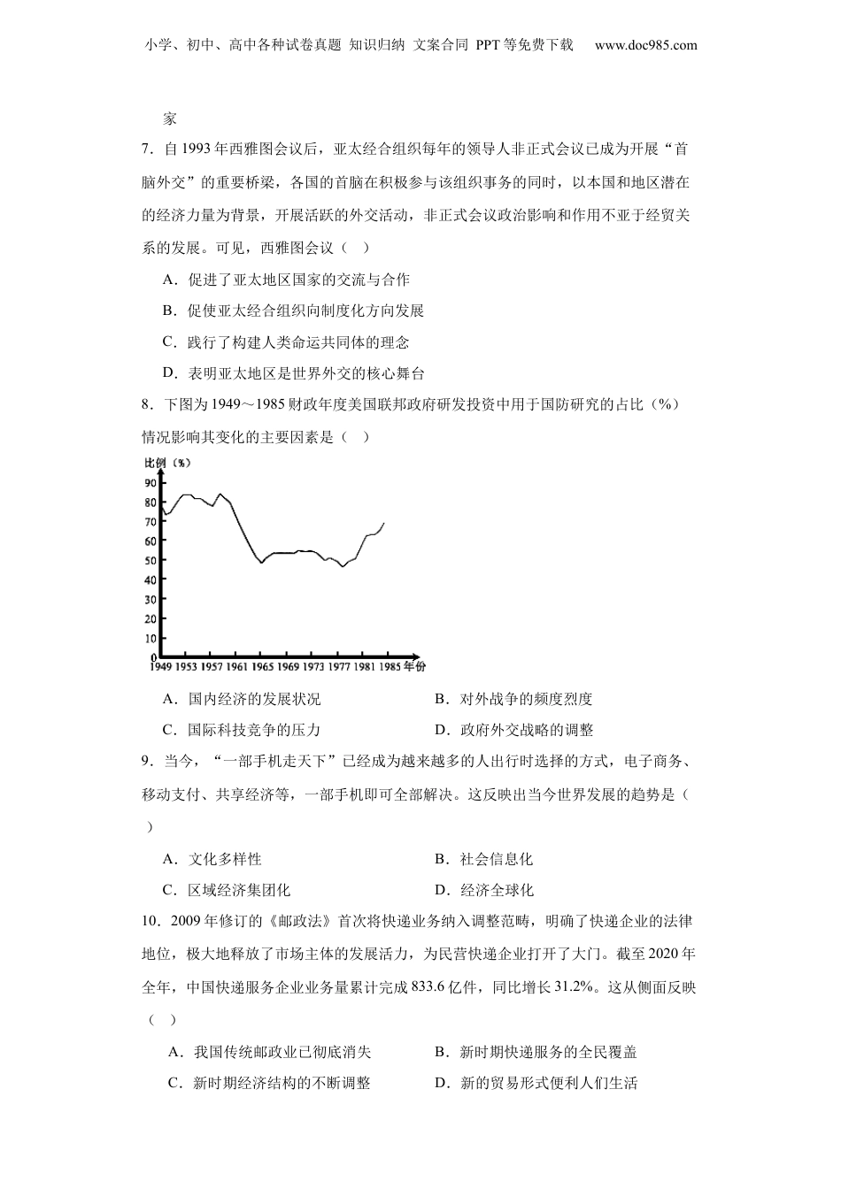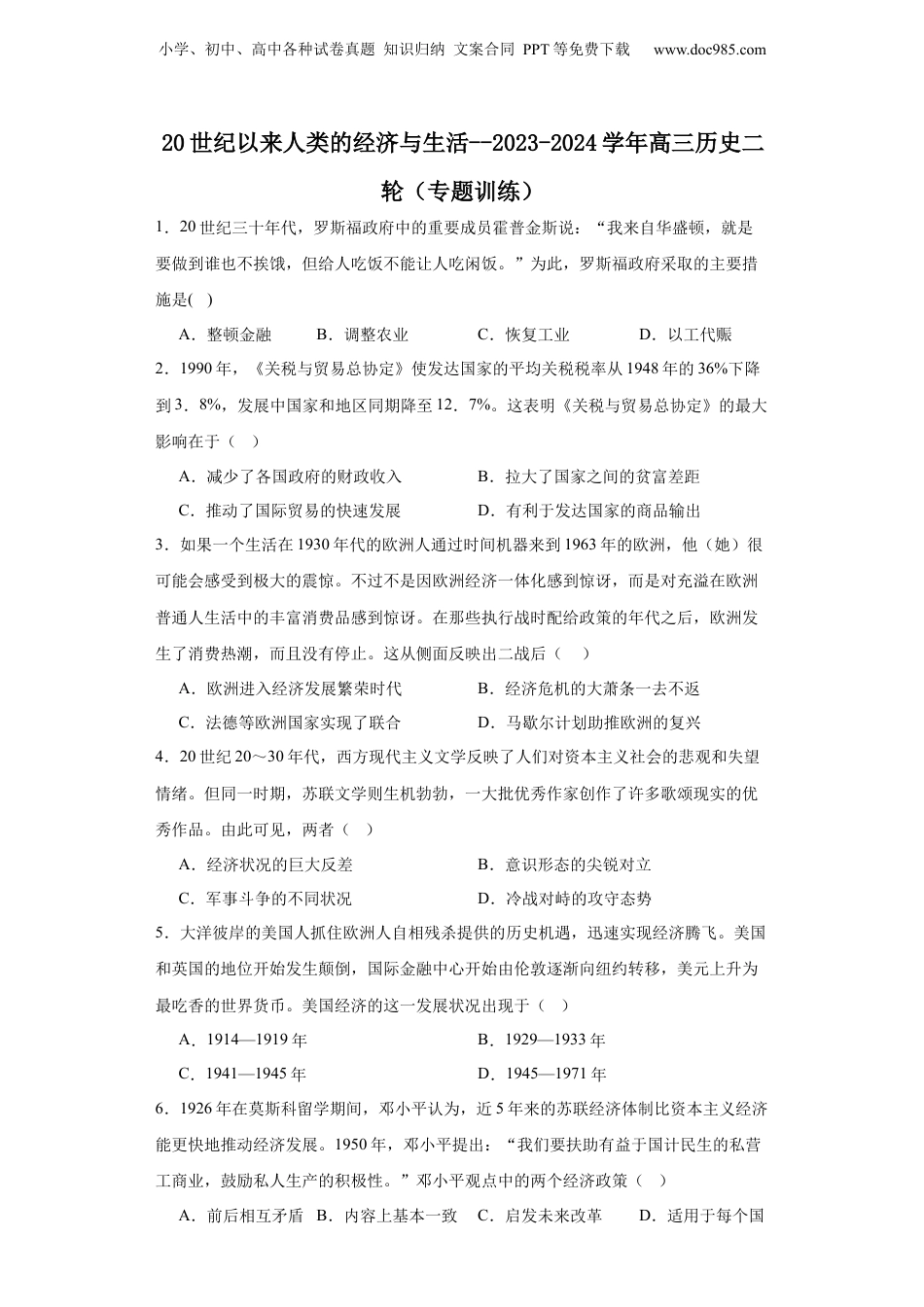 小学、初中、高中各种试卷真题知识归纳文案合同PPT等免费下载www.doc985.com20世纪以来人类的经济与生活--2023-2024学年高三历史二轮(专题训练)1.20世纪三十年代,罗斯福政府中的重要成员霍普金斯说:“我来自华盛顿,就是要做到谁也不挨饿,但给人吃饭不能让人吃闲饭。”为此,罗斯福政府采取的主要措施是()A.整顿金融B.调整农业C.恢复工业D.以工代赈2.1990年,《关税与贸易总协定》使发达国家的平均关税税率从1948年的36%下降到3.8%,发展中国家和地区同期降至12.7%。这表明《关税与贸易总协定》的最大影响在于()A.减少了各国政府的财政收入B.拉大了国家之间的贫富差距C.推动了国际贸易的快速发展D.有利于发达国家的商品输出3.如果一个生活在1930年代的欧洲人通过时间机器来到1963年的欧洲,他(她)很可能会感受到极大的震惊。不过不是因欧洲经济一体化感到惊讶,而是对充溢在欧洲普通人生活中的丰富消费品感到惊讶。在那些执行战时配给政策的年代之后,欧洲发生了消费热潮,而且没有停止。这从侧面反映出二战后()A.欧洲进入经济发展繁荣时代B.经济危机的大萧条一去不返C.法德等欧洲国家实现了联合D.马歇尔计划助推欧洲的复兴4.20世纪20~30年代,西方现代主义文学反映了人们对资本主义社会的悲观和失望情绪。但同一时期,苏联文学则生机勃勃,一大批优秀作家创作了许多歌颂现实的优秀作品。由此可见,两者()A.经济状况的巨大反差B.意识形态的尖锐对立C.军事斗争的不同状况D.冷战对峙的攻守态势5.大洋彼岸的美国人抓住欧洲人自相残杀提供的历史机遇,迅速实现经济腾飞。美国和英国的地位开始发生颠倒,国际金融中心开始由伦敦逐渐向纽约转移,美元上升为最吃香的世界货币。美国经济的这一发展状况出现于()A.1914—1919年B.1929—1933年C.1941—1945年D.1945—1971年6.1926年在莫斯科留学期间,邓小平认为,近5年来的苏联经济体制比资本主义经济能更快地推动经济发展。1950年,邓小平提出:“我们要扶助有益于国计民生的私营工商业,鼓励私人生产的积极性。”邓小平观点中的两个经济政策()A.前后相互矛盾B.内容上基本一致C.启发未来改革D.适用于每个国小学、初中、高中各种试卷真题知识归纳文案合同PPT等免费下载www.doc985.com家7.自1993年西雅图会议后,亚太经合组织每年的领导人非正式会议已成为开展“首脑外交”的重要桥梁,各国的首脑在积极参与该组织事务的同时,以本国和地区潜在的经济力量为背景,开展活跃的外交活动,非正式会议政治影响和作用不亚于经贸关系的发展。可见,西雅图会议()A.促进了亚太地区国家的交流与合作B.促使亚太经合组织向制度化方向发展C.践行了构建人类命运共同体的理念D.表明亚太地区是世界外交的核心舞台8.下图为1949~1985财政年度美国联邦政府研发投资中用于国防研究的占比(%)情况影响其变化的主要因素是()A.国内经济的发展状况B.对外战争的频度烈度C.国际科技竞争的压力D.政府外交战略的调整9.当今,“一部手机走天下”已经成为越来越多的人出行时选择的方式,电子商务、移动支付、共享经济等,一部手机即可全部解决。这反映出当今世界发展的趋势是()A.文化多样性B.社会信息化C.区域经济集团化D.经济全球化10.2009年修订的《邮政法》首次将快递业务纳入调整范畴,明确了快递企业的法律地位,极大地释放了市场主体的发展活力,为民营快递企业打开了大门。截至2020年全年,中国快递服务企业业务量累计完成833.6亿件,同比增长31.2%。这从侧面反映()A.我国传统邮政业已彻底消失B.新时期快递服务的全民覆盖C.新时期经济结构的不断调整D.新的贸易形式便利人们生活小学、初中、高中各种试卷真题知识归纳文案合同PPT等免费下载www.doc985.com11.如图为1850—1990年的英国职业人数结构图。该图反映出英国()A.从生产社会向消费社会转变B.从男权社会向女权社会转型C.国家干预经济的逐步加强D.福利国家制度的不断完善12.下图是2022年卡塔尔世界杯的主体育场——卢赛尔体育场。卡塔尔是最早响应中国“一带一路”倡议的国家之一,2016年中国铁建与当地公司组成联合体...
