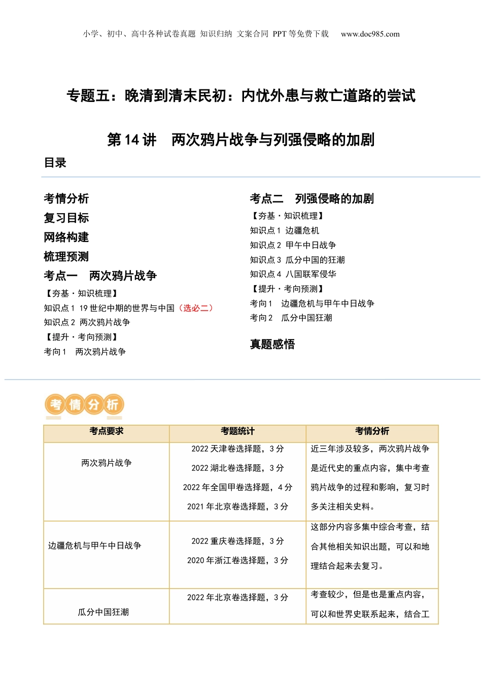 小学、初中、高中各种试卷真题知识归纳文案合同PPT等免费下载www.doc985.com专题五:晚清到清末民初:内忧外患与救亡道路的尝试第14讲两次鸦片战争与列强侵略的加剧目录考情分析复习目标网络构建梳理预测考点一两次鸦片战争【夯基·知识梳理】知识点119世纪中期的世界与中国(选必二)知识点2两次鸦片战争【提升·考向预测】考向1两次鸦片战争考点二列强侵略的加剧【夯基·知识梳理】知识点1边疆危机知识点2甲午中日战争知识点3瓜分中国的狂潮知识点4八国联军侵华【提升·考向预测】考向1边疆危机与甲午中日战争考向2瓜分中国狂潮真题感悟考点要求考题统计考情分析两次鸦片战争2022天津卷选择题,3分2022湖北卷选择题,3分2022年全国甲卷选择题,4分2021年北京卷选择题,3分近三年涉及较多,两次鸦片战争是近代史的重点内容,集中考查鸦片战争的过程和影响,复习时多关注相关史料。边疆危机与甲午中日战争2022重庆卷选择题,3分2020年浙江卷选择题,3分这部分内容多集中综合考查,结合其他相关知识出题,可以和地理结合起来去复习。瓜分中国狂潮2022年北京卷选择题,3分考查较少,但是也是重点内容,可以和世界史联系起来,结合工小学、初中、高中各种试卷真题知识归纳文案合同PPT等免费下载www.doc985.com业革命内容复习。1、认识两次鸦片战争对中国社会的影响,概述这一时期中国人民反抗外来侵略的斗争事迹及意义。2、认识列强侵华对中国社会的影响,理解其性质和意义考点一两次鸦片战争【整体脉络】小学、初中、高中各种试卷真题知识归纳文案合同PPT等免费下载www.doc985.com知识点1:19世纪中期的世界与中国(选必二)1、鸦片战争前夕世界形势发生的变化:19世纪中期,世界形势发展到全新的格局。①政治:资产阶级代议制在欧洲大陆逐步确立。②经济:工业革命后半个多世纪,资本主义生产方式在英、法、美等国逐渐占据主导地位;③外交:世界主要殖民主义国家都把矛头指向了中国。④科技:西方自然科学进一步发展。2、鸦片战争前中国的社会状况:清政府对世界形势的变化浑然不觉。①政治:中国社会仍然停留在封建社会,君主专制统治仍很顽固;②经济:自给自足的小农经济是主要的生产方式;③科技:落后④军事:武备落后,使用的武器主要是冷兵器,远远落后于英国的热兵器。⑤社会:社会阶级矛盾激化,各地农民起义此起彼伏⑥外交:闭关自守,落后于世界潮流。⑦文化:八股取士束缚人们的思想。中西方本质上的差异在于——西方已经进入资本主义工业文明阶段,中国仍处于落后的封建农耕文明时代。知识点2:两次鸦片战争(一)虎门销烟1、背景:在中英正当贸易中,中国处于明显的出超地位,为了改变这种不利局面,英国向中国大量走私鸦片。2、原因:①鸦片战争前,外国鸦片商人逐年扩大对华鸦片走私,中国白银大量外流。②鸦片烟毒损害了中国人的健康,加剧了政治腐败,削弱了军队战斗力,加重了劳动人民负担。③道光皇帝特命林则徐为钦差大臣,前往广州禁烟。3、过程:林则徐将英美鸦片商人呈缴的走私鸦片烟土两万多箱,在虎门海滩公开销毁。4、意义和影响:(从“家国情怀”角度认识禁烟运动的影响)①从一定程度上遏制了鸦片在中国的泛滥,在民间产生了积极的影响。唤醒了中国人们的爱国意识。经过这次事件,禁烟英雄林则徐被中国人尊为民族英雄。②加速了英国对中国的侵略。禁烟运动直接损害了英国资产阶级的利益,英国政府很快决定对中国发动蓄谋已久的侵略战争,"虎门销烟"也成为了外国列强发动鸦片战争的导火索。从这个角度看,"虎门销烟"加速了中国半殖民地化的脚步,从很大程度上推动了中国近代史的发展。③虎门销烟一方面唤醒了当时中国很多爱国的有识之士,他们开始反省,重新定位中国在世界上的地位,不再以"天朝上国"自居。另一方面,也大大抑制了英国在中国的鸦片交易,沉重打击了英国资产阶级在小学、初中、高中各种试卷真题知识归纳文案合同PPT等免费下载www.doc985.com中国的贸易掠夺,展示了中国人民禁烟的坚定决心和觉醒意识。④林则徐领导禁烟运动的胜利,维护了中华民族的尊严和利益。"虎门销烟"是中国近代史上反对帝国主义的重要史例,展示出了中华民族反对...
