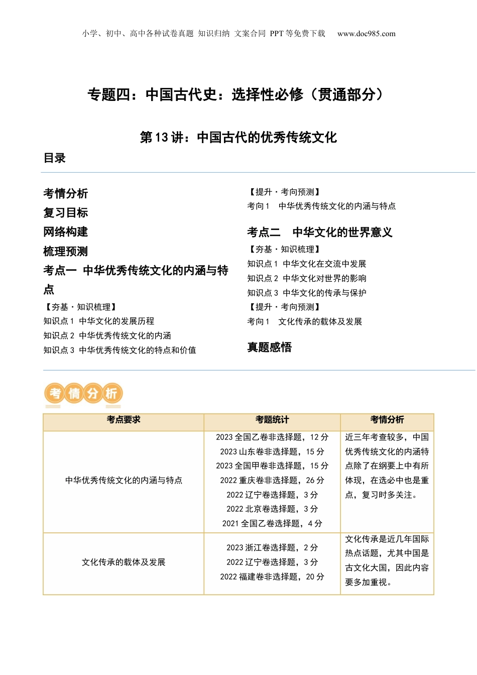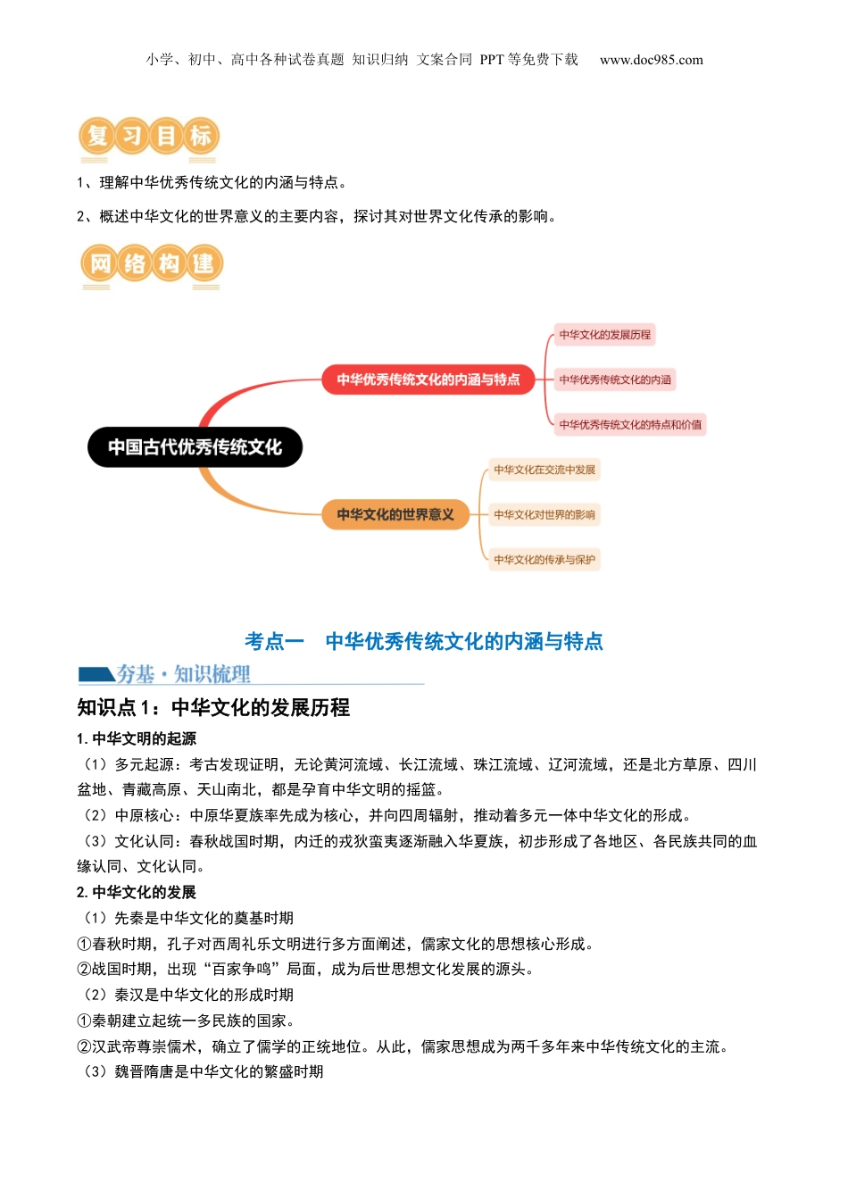 小学、初中、高中各种试卷真题知识归纳文案合同PPT等免费下载www.doc985.com专题四:中国古代史:选择性必修(贯通部分)第13讲:中国古代的优秀传统文化目录考情分析复习目标网络构建梳理预测考点一中华优秀传统文化的内涵与特点【夯基·知识梳理】知识点1中华文化的发展历程知识点2中华优秀传统文化的内涵知识点3中华优秀传统文化的特点和价值【提升·考向预测】考向1中华优秀传统文化的内涵与特点考点二中华文化的世界意义【夯基·知识梳理】知识点1中华文化在交流中发展知识点2中华文化对世界的影响知识点3中华文化的传承与保护【提升·考向预测】考向1文化传承的载体及发展真题感悟考点要求考题统计考情分析中华优秀传统文化的内涵与特点2023全国乙卷非选择题,12分2023山东卷非选择题,15分2023全国甲卷非选择题,15分2022重庆卷非选择题,26分2022辽宁卷选择题,3分2022北京卷选择题,3分2021全国乙卷选择题,4分近三年考查较多,中国优秀传统文化的内涵特点除了在纲要上中有所体现,在选必中也是重点,复习时多关注。文化传承的载体及发展2023浙江卷选择题,2分2022辽宁卷选择题,3分2022福建卷非选择题,20分文化传承是近几年国际热点话题,尤其中国是古文化大国,因此内容要多加重视。小学、初中、高中各种试卷真题知识归纳文案合同PPT等免费下载www.doc985.com1、理解中华优秀传统文化的内涵与特点。2、概述中华文化的世界意义的主要内容,探讨其对世界文化传承的影响。考点一中华优秀传统文化的内涵与特点知识点1:中华文化的发展历程1.中华文明的起源(1)多元起源:考古发现证明,无论黄河流域、长江流域、珠江流域、辽河流域,还是北方草原、四川盆地、青藏高原、天山南北,都是孕育中华文明的摇篮。(2)中原核心:中原华夏族率先成为核心,并向四周辐射,推动着多元一体中华文化的形成。(3)文化认同:春秋战国时期,内迁的戎狄蛮夷逐渐融入华夏族,初步形成了各地区、各民族共同的血缘认同、文化认同。2.中华文化的发展(1)先秦是中华文化的奠基时期①春秋时期,孔子对西周礼乐文明进行多方面阐述,儒家文化的思想核心形成。②战国时期,出现“百家争鸣”局面,成为后世思想文化发展的源头。(2)秦汉是中华文化的形成时期①秦朝建立起统一多民族的国家。②汉武帝尊崇儒术,确立了儒学的正统地位。从此,儒家思想成为两千多年来中华传统文化的主流。(3)魏晋隋唐是中华文化的繁盛时期小学、初中、高中各种试卷真题知识归纳文案合同PPT等免费下载www.doc985.com①魏晋玄学盛行,唐朝佛学繁荣,传统儒学受到挑战。②隋唐时期,中华传统文化辉煌灿烂。(4)宋元是中华文化的繁荣发展时期①宋代理学形成,丰富了中华文化的理论思维,但宣扬封建礼教,严重束缚了人们的精神世界。②宋元时期,科技、史学、文学、艺术高度繁荣。(5)明清是中华文化的继承和发展时期①明清之际,提倡个性自由的思想,进步思想家黄宗羲、顾炎武和王夫之等批判理学,倡导经世致用。②康雍乾时期,君主专制高度发展,文字狱愈演愈烈,思想受到钳制,也禁锢了中华文化的发展。(6)近代中华文化的衰落①1840年鸦片战争爆发后,向西方学习以救亡图存逐渐成为近代中华文化的潮流。②20世纪初期兴起的新文化运动,抨击封建思想,科学与民主成为中华文化追求的价值目标。③五四运动以后,马克思主义在中国传播,马克思主义与中国实际相结合,推动了中华文化的进步。知识点2:中华优秀传统文化的内涵1.重视以人为本(1)西周时期,周公提出“敬天保民”的思想,建立了以人为中心的礼乐制度。(2)春秋时期,孔子提倡“仁”,主张“仁者爱人”,建立起儒家的一套规范社会关系的伦理秩序。2.提倡民本思想(1)春秋战国时期:①管子提出君主治理国家要顺应民意;②孔子要求统治者体察民情,反对苛政;③孟子提出了“仁政”说,其中“民为贵,社稷次之,君为轻”的主张,体现了民本思想。(2)历代思想家继承了先秦民本思想,发展为系统的理论学说,并在一定程度上转化为政治实践,成为中华传统政治文化的重要特征,对推动中国历史发展起到了积极作用。3.崇尚天人合一,道法自然(1)夏商时期,人...