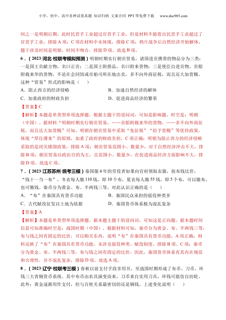 小学、初中、高中各种试卷真题知识归纳文案合同PPT等免费下载www.doc985.com第11讲中国古代的法治教化、商业贸易及货币与赋税制度1.(2023·海南·统考模拟预测)秦汉的“律”“令”二者没有性质上的区别,“令”中有刑法内容,“律”中有行政制度。魏晋以后,“律”的内容开始集中于刑律,“令”则用于容纳行政法令。这表明魏晋以后()A.律令体系逐渐发展B.专制王权得以强化C.重视法律惩戒作用D.儒学日益融入法律【答案】A【解析】本题是单类型单项选择题。据本题主题干的设问词,可知这是本质题。据本题时间信息可知准确时空是:秦汉至魏晋(中国)。据本题材料概括得出主要结论是:魏晋以后,“律”“令”逐渐区别开来,“律”集中于刑律,“令”则与行政法令相关,区别于秦汉,“律”“令”逐渐专门化、体系化,A项正确。材料反映的是古代法律的发展与完善,与皇权的强化无关,排除B项;材料反映的是“律”“令”内容的变化,与法律的作用无关,排除C项;材料并没有提及法律吸纳儒家伦理纲常等相关内容,排除D项。故选A项。2.(2023·宁夏银川·银川一中校考模拟预测)唐代《杂令》规定:“诸家长在,而子孙弟侄等不得辄以奴婢、六畜、田宅及财物和自质举,及卖田宅。……若不相本问,违而辄与及买者,物即还主,钱没不追。”由此可见当时()A.理学思想制约了商品经济的发展B.宗法社会中家庭卑幼成员无财产权C.封建国家禁止未成年人处分财产D.封建国家依法保护父家长的财产权【答案】D【解析】本题是单类型单项选择题,根据题干设问可知是推断题,准确的时空是:唐代(中国)。根据材料可知,唐朝法律对家长的财产支配权进行了严格规定,说明封建国家依法保护父家长的财产权,D项正确;理学在宋朝才出现,排除A项;材料强调“家长在”的话,子孙弟侄不能售卖田宅,而不是卑幼成员无继承权,排除B项;“禁止未成年人处分财产”说法错误,材料强调“家长在”的话,子孙弟侄不能售卖田宅,排除C项。故选D项。3.(2023·辽宁丹东·统考二模)宋太祖曾下诏:“私炼盐者,三斤死”;宋太宗时规定:“有敢私市戍人青白盐(产自西夏境内的盐)者,皆坐死”“贩易私茶,遇官司擒捕抵拒者,皆死”;宋哲宗曾详细规定私贩青白盐,“一两杖八十……一百二十斤绞”。这体现了宋代()最新模拟精炼小学、初中、高中各种试卷真题知识归纳文案合同PPT等免费下载www.doc985.comA.针对西夏进行经济封锁B.严明法纪以促进民间商业C.抑商政策仍占主导地位D.经济管理中重刑色彩鲜明【答案】D【解析】本题是单类型单项选择题。据设问词可知是本质题。时空是北宋时期(中国)。据材料“私炼盐者,三斤死”,“有敢私市戍人青白盐(产自西夏境内的盐)者,皆坐死”等信息,可以看出在宋代对于私自贩卖或者炼制食盐的行为,予以重刑,体现出经济管理中的重刑色彩,D项正确;材料强调的是重刑色彩,并不是对西夏的经济封锁,排除A项;仅从材料,无法得出民间商业的发展状况,排除B项;从政府对私自贩卖或者炼制食盐的行为的重刑,无法得出政府对商业的政策,排除C项。故选D项。4.(2023·重庆·统考三模)中国古代有大量外来的农作物传入并推广种植。秦汉到唐宋之间传进来的基本上叫“胡”,例如胡萝卜、胡椒、胡瓜等;宋到明清时期传入的基本上叫“番”或者“洋”,例如番薯、番茄、洋芋等。外来作物命名的变化反映了()A.精耕细作农业模式的发展B.民间对外来事物接受态度不同C.对外贸易路线的重要变化D.西方殖民侵略不断加深的影响【答案】C【解析】本题是单类型单项选择题。据本题主题干的设问词,可知这是本质题。据本题时间信息可知准确时空是:古代中国。根据材料可知,秦汉到唐宋之间传进来的基本上叫“胡”,宋到明清的时候传进来的基本上叫“番”。这个命名规律其实体现了贸易线路的改变,叫“胡”的是走西域的陆路传进来的,叫“番”的是走海路传进来的,可以看到一个海权逐渐替代路权的过程,其中暗含着贸易轨迹的转变,C项正确;材料所述与小农经济无关,排除A项;胡或番的称谓不能反映民间接受态度的变化,排除B项;材料中物种的传播及称谓的变化与西方殖民侵略无关,...