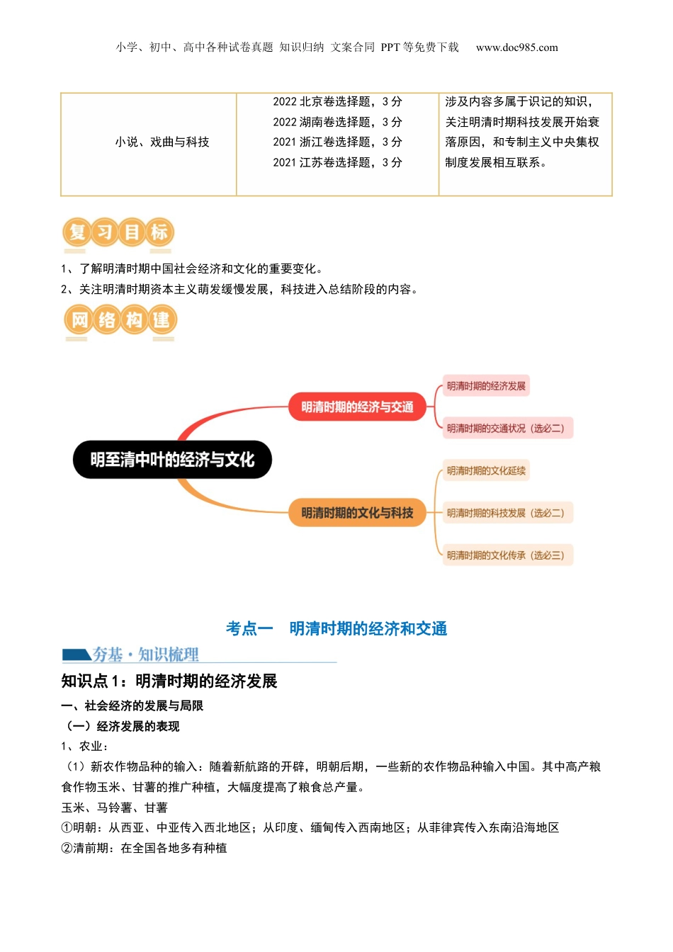 小学、初中、高中各种试卷真题知识归纳文案合同PPT等免费下载www.doc985.com专题三:宋元到明清:多民族政权的并立、统一和中国版图的奠定第09讲明至清中叶的经济与文化目录考情分析复习目标网络构建梳理预测考点一明清时期的经济和交通【夯基·知识梳理】知识点1明清时期的经济发展知识点2明清时期的交通状况(选必二)【提升·考向预测】考向1明清经济发展与局限考点二明清时期的文化和科技【夯基·知识梳理】知识点1明清时期的文化延续知识点2明清时期的科技发展(选必二)知识点3明清时期文化传承(选必三)【提升·考向预测】考向1陆王心学与明清之际的思想批判考向2小说、戏曲与科技真题感悟考点要求考题统计考情分析明清经济发展与局限2023新课标卷(五省)选择题,4分2023全国甲卷非选择题,15分2022全国乙卷选择题,4分2022江苏卷选择题,3分2022广东卷非选择题,25分2021重庆卷选择题,3分2021海南卷选择题,3分2021辽宁卷选择题,3分近三年考查较多,基本集中在明清经济发展和资本主义萌芽内容,和近代史靠的近,因此复习时候多关注资本主义萌芽发展缓慢的问题,同时对于明清商业和世界市场联系要重视。陆王心学与明清之际的思想批判2023全国甲卷选择题,4分2021广东卷选择题,3分2021湖南卷非选择题,12分这部分内容主要考查明清进步思想,复习时要和儒家思想的发展结合,体现变化。小学、初中、高中各种试卷真题知识归纳文案合同PPT等免费下载www.doc985.com小说、戏曲与科技2022北京卷选择题,3分2022湖南卷选择题,3分2021浙江卷选择题,3分2021江苏卷选择题,3分涉及内容多属于识记的知识,关注明清时期科技发展开始衰落原因,和专制主义中央集权制度发展相互联系。1、了解明清时期中国社会经济和文化的重要变化。2、关注明清时期资本主义萌发缓慢发展,科技进入总结阶段的内容。考点一明清时期的经济和交通知识点1:明清时期的经济发展一、社会经济的发展与局限(一)经济发展的表现1、农业:(1)新农作物品种的输入:随着新航路的开辟,明朝后期,一些新的农作物品种输入中国。其中高产粮食作物玉米、甘薯的推广种植,大幅度提高了粮食总产量。玉米、马铃薯、甘薯①明朝:从西亚、中亚传入西北地区;从印度、缅甸传入西南地区;从菲律宾传入东南沿海地区②清前期:在全国各地多有种植小学、初中、高中各种试卷真题知识归纳文案合同PPT等免费下载www.doc985.com③清乾隆、嘉庆:得到大规模推广④鸦片战争前夕:遍布全国番茄①明万历:引入,长期被当作观赏和药用植物②清光绪:开始作为食用蔬菜在菜园种植辣椒明朝:传入中国,被称为“番椒”(2)多种经营的发展:江南等地区农业的多种经营日益兴盛,经济作物品种繁多,种植广泛,很多农民还兼营产品初级加工或相关副业,以获取更多的收入。2、手工业:手工业各行业都有不同程度的进步。明朝后期,在南方一些地区的丝织、榨油、制瓷等行业中出现了新的经营方式,即开设工场,使用自由雇佣劳动进行较大规模的生产。3、商业:国内①市场:明清形成全国范围的商业贸易网络②货币:白银逐渐成为基本支付手段是商品经济发展的需要,推动了商品经济进一步发展(选一P87)促进了长途和大额贸易的发展,有利于商业资本的集聚(纲上P84)一个围绕白银输入中国的贸易网络逐渐形成(纲下P41)③商品:农产品商品化程度不断加深④商人:地域性商人群体——商帮(徽商和晋商)⑤市镇:工商业市镇成为地区贸易网络的核心⑥信贷:⑦城市⑧集镇小学、初中、高中各种试卷真题知识归纳文案合同PPT等免费下载www.doc985.com对外贸易①商品输出:瓷器(文艺复兴时期名画《群神宴》中的瓷碗都是中国的青花瓷)(选二37);16世纪初,葡萄牙人带到欧洲的第一批中国瓷器引起了欧洲人的浓厚兴趣,各国的君主和达官显贵纷纷用黄金购买(选三55);丝绸棉布(16世纪,葡萄牙商人把中国生丝转运到欧洲和日本长崎销售;16世纪,西班牙“马尼拉大帆船”运载大量中国生丝、丝绸、棉布和瓷器到墨西哥销售(纲下41);茶(16世纪以后,中国茶广泛传播到欧洲、美洲、非洲和大洋洲等地区(选三57),丰富了当地人们的生活和文化(选二37)输入:钟...
