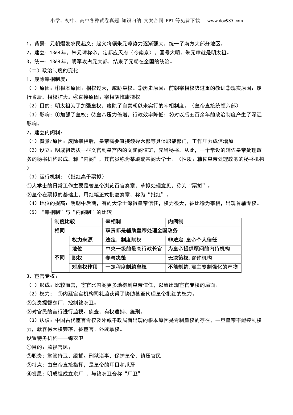 小学、初中、高中各种试卷真题知识归纳文案合同PPT等免费下载www.doc985.com专题三:宋元到明清:多民族政权的并立、统一和中国版图的奠定第08讲从明朝建立到清军入关和清朝前中期的鼎盛与危机目录考情分析复习目标网络构建梳理预测考点一明朝时期的内政外交与明清易代【夯基·知识梳理】知识点1明朝施政措施与明清易代知识点2官员的选拔与管理(选必一)知识点3法律与教化(选必一)知识点4民族关系与对外交往(选必一)知识点5户籍制度与基层治理(选必一)【提升·考向预测】考向1明朝建立到清军入关考点二清朝时期的内政外交与统治危机【夯基·知识梳理】知识点1清朝施政措施与统治危机知识点2官员的选拔与管理(选必一)知识点3法律与教化(选必一)知识点4民族关系与对外交往(选必一)知识点5户籍制度与基层治理(选必一)【提升·考向预测】考向1康雍乾的君主专制考向2疆域的奠定与闭关锁国真题感悟考点要求考题统计考情分析明朝建立到清军入关2023全国乙卷选择题,4分2022全国甲卷非选择题,25分2021年全国甲卷非选择题,12分近三年考查非选择题较多,且多为全国卷,明清是专制主义中央集权达到顶峰时期的一个阶段,是高考的重点,也是逐渐从古代过渡到近代的特殊时期,复习时重点把握。康雍乾的君主专制2022湖南卷选择题,3分近三年考查较少,但是这部分内容仍然是重点,涉及到清朝达到顶峰时期的一些政策,要重点复习。小学、初中、高中各种试卷真题知识归纳文案合同PPT等免费下载www.doc985.com疆域的奠定与闭关锁国2022年辽宁卷非选择题,12分2022年浙江卷选择题,3分2022年湖南卷选择题,3分属于民族关系和对外关系的内容,考查时候和政治、地理内容联系紧密,多关注相关内容,重点把握。1、通过学习明清时期统一全国和经略边疆的相关举措,认识到这一时期南海诸岛、台湾、澎湖列岛及包括钓鱼岛在内的其他岛屿都是中国版图的一部分,理解这一时期统一多民族国家版图奠定的重要意义。2、知道南海诸岛、台湾及其包括钓鱼岛在内的附属岛屿是中国版图一部分;了解清朝封建专制的发展、世界的变化对中国的影响,认识社会面临的危机。考点一明朝时期的内政外交与明清易代知识点1:明朝施政措施与明清易代一、明朝政治制度的变化(一)元朝灭亡,明朝建立小学、初中、高中各种试卷真题知识归纳文案合同PPT等免费下载www.doc985.com1、背景:元朝爆发农民起义;起义将领朱元璋势力逐渐强大,统一了南方大部分地区。2、建立:1368年,朱元璋称帝,定都应天府(今南京),国号大明。朱元璋就是明太祖。3、统一:1368年,明军攻占元大都,结束了元朝在全国的统治。(二)政治制度的变化1、废除宰相制度:(1)原因:①根本原因:相权过大,威胁皇权。②历史原因:前朝宰相权势过重的教训③现实原因:废行省后,相权扩大。④直接原因:宰相胡惟庸擅权(2)目的:明太祖为了加强皇权,废除了自秦朝以来实行的宰相制度。(皇帝直接统领六部)(3)影响:①加强了皇权;②皇帝压力倍增,行政效率降低;③对以后五百余年的政治制度产生了深远影响。2、建立内阁制:(1)背景/原因:废除宰相后,皇帝需要直接领导六部等具体职能部门,工作压力成倍增加。(2)设立:明成祖选拔一些文官到皇宫内的文渊阁值班,充当秘书。从此,一个常设的辅佐皇帝处理政务的秘书机构形成,称“内阁”,其官员称为某殿或某阁大学士。(性质:辅佐皇帝处理政务的秘书机构)(3)运行机制:(批红高于票拟)①大学士的日常工作主要是替皇帝浏览百官奏章,草拟处理意见,称为“票拟”。②皇帝在票拟的基础上,用红笔正式批复奏章,称为“批红”。(4)地位的提高:明朝中后期,有的大学士深得皇帝信任,权力很大,被比喻为宰相,出现首辅专权。(5)“宰相制”与“内阁制”的比较制度比较宰相制内阁制相同职责都是辅助皇帝处理全国政务不同权力来源法定,制度赋权非法定,皇帝个人信任地位中央一级的最高行政长官为皇帝提供顾问的内侍机构职权参与决策无决策权,咨询机构对皇权作用一定程度制约皇权不能制约,君主专制强化的产物3、宦官专权:(1)形成:比较而言,宦官比内阁更多地得到皇帝信任,以致出现宦官...